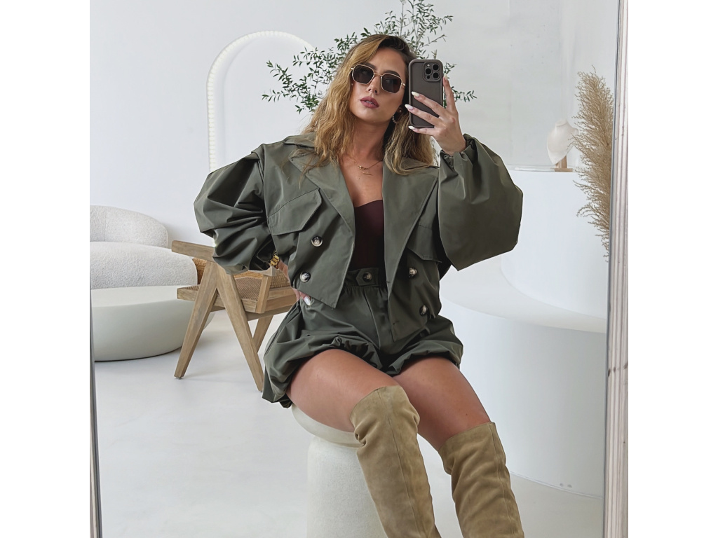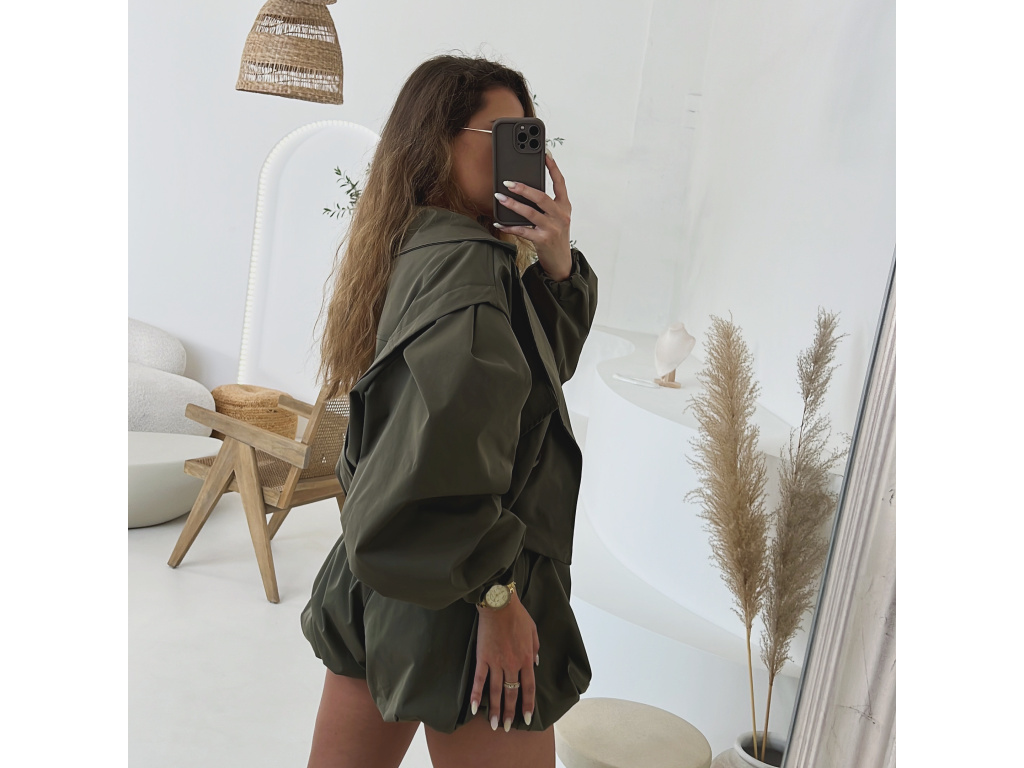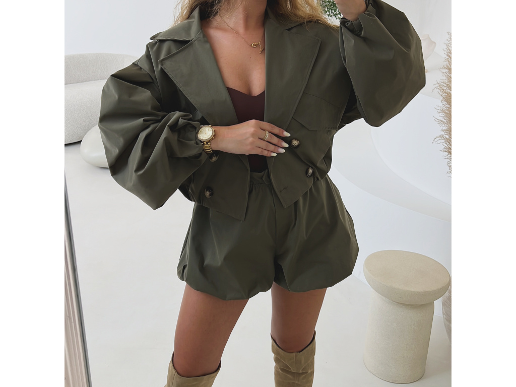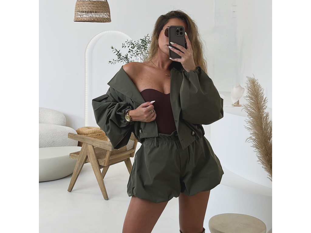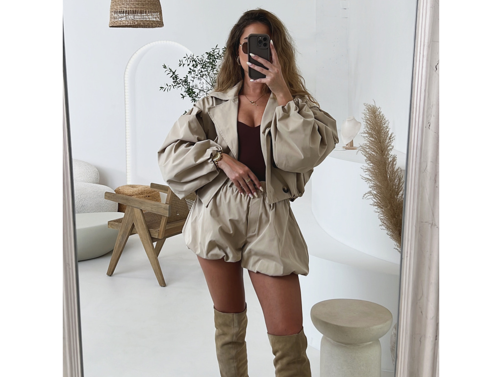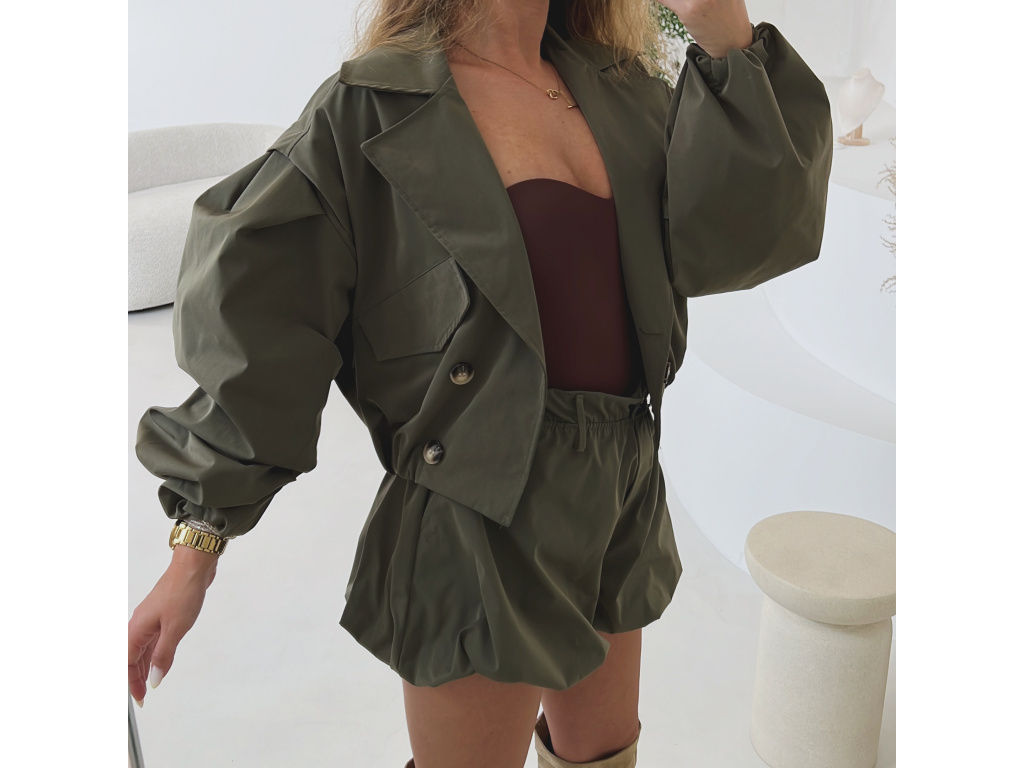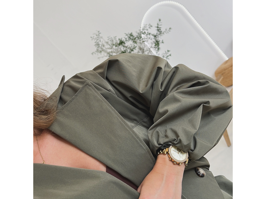 Stylová oversize bundička v béžové a khaki barvě je navržena jako komplet k balónovým šortkám ze stejné kolekce. Má výrazné balónové rukávy, volnější střih a zapínání na knoflíky, takže působí trendy i pohodlně zároveň. Dostupná ve velikostech S/M a M/L. Trenčkot je vč. podšívky. Rukávy a dolní kraj bundy je stažený do gumy.