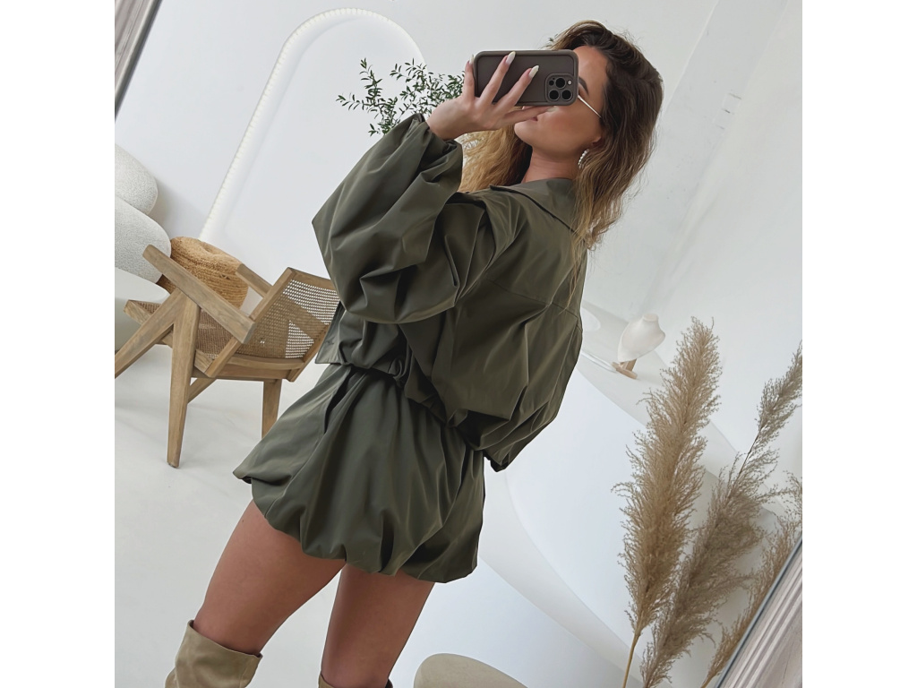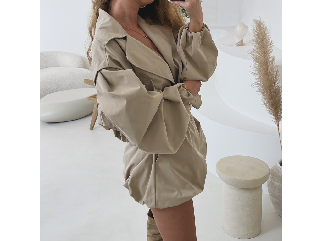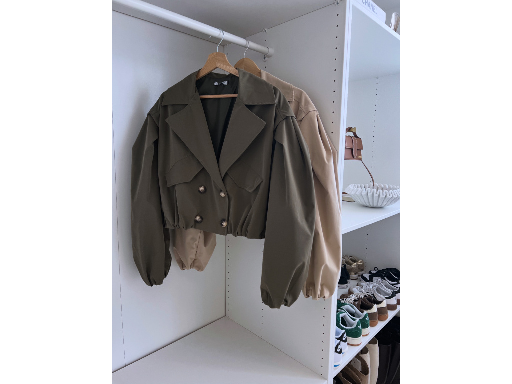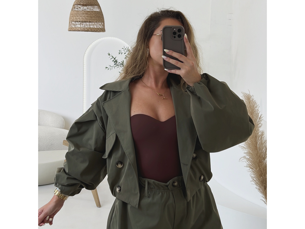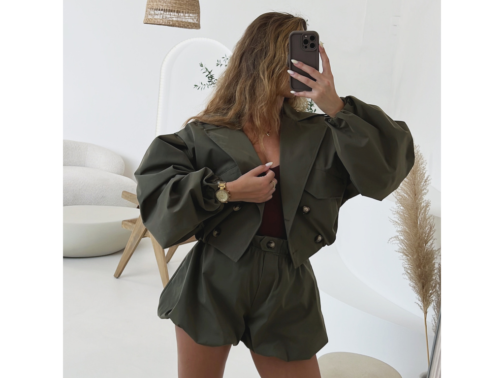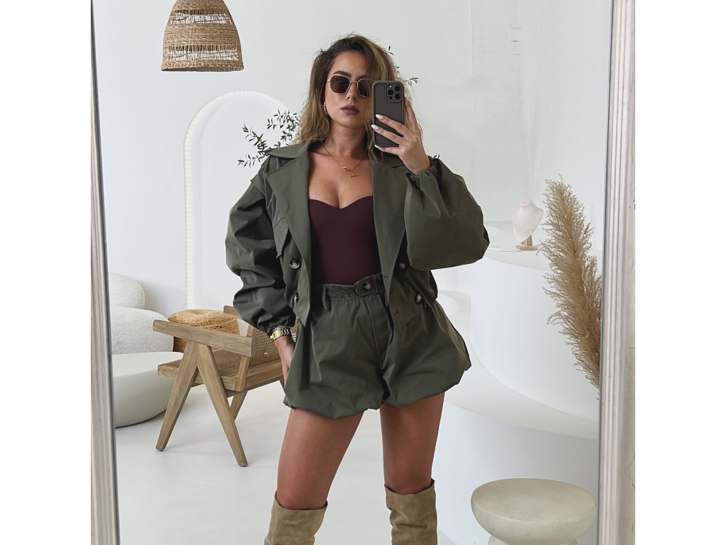 Stylová oversize bundička v béžové a khaki barvě je navržena jako komplet k balónovým šortkám ze stejné kolekce. Má výrazné balónové rukávy, volnější střih a zapínání na knoflíky, takže působí trendy i pohodlně zároveň. Dostupná ve velikostech S/M a M/L. Trenčkot je vč. podšívky. Rukávy a dolní kraj bundy je stažený do gumy.