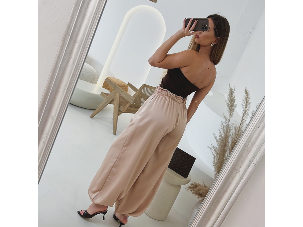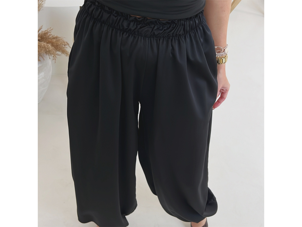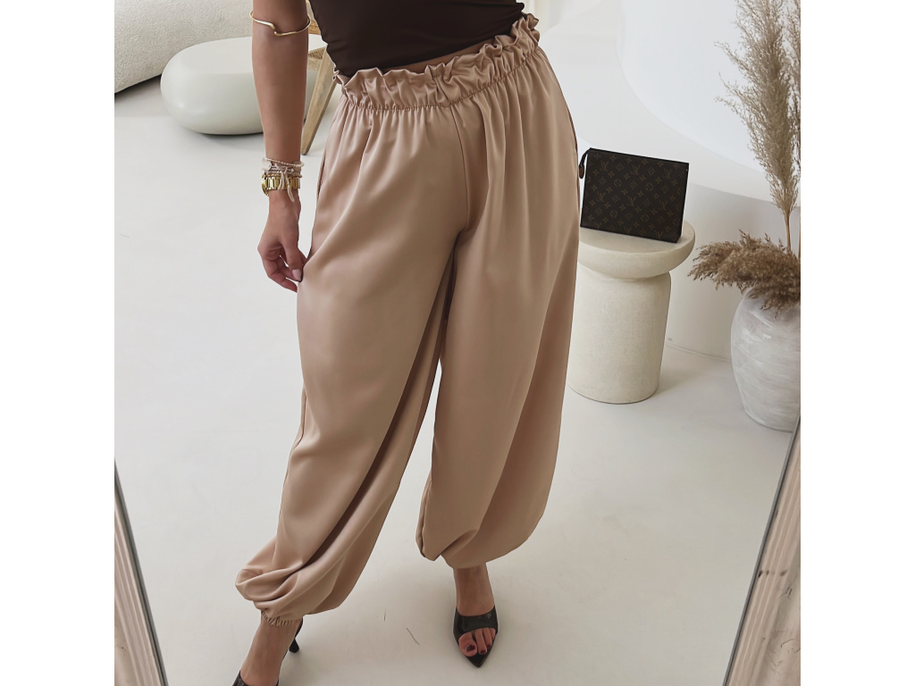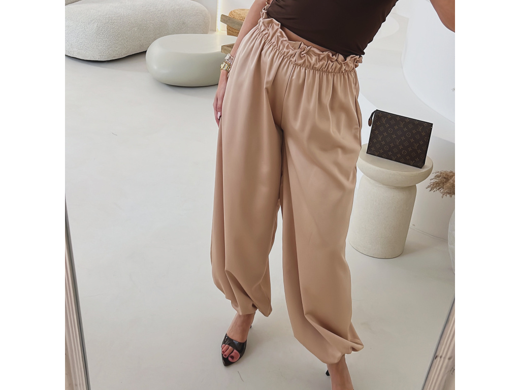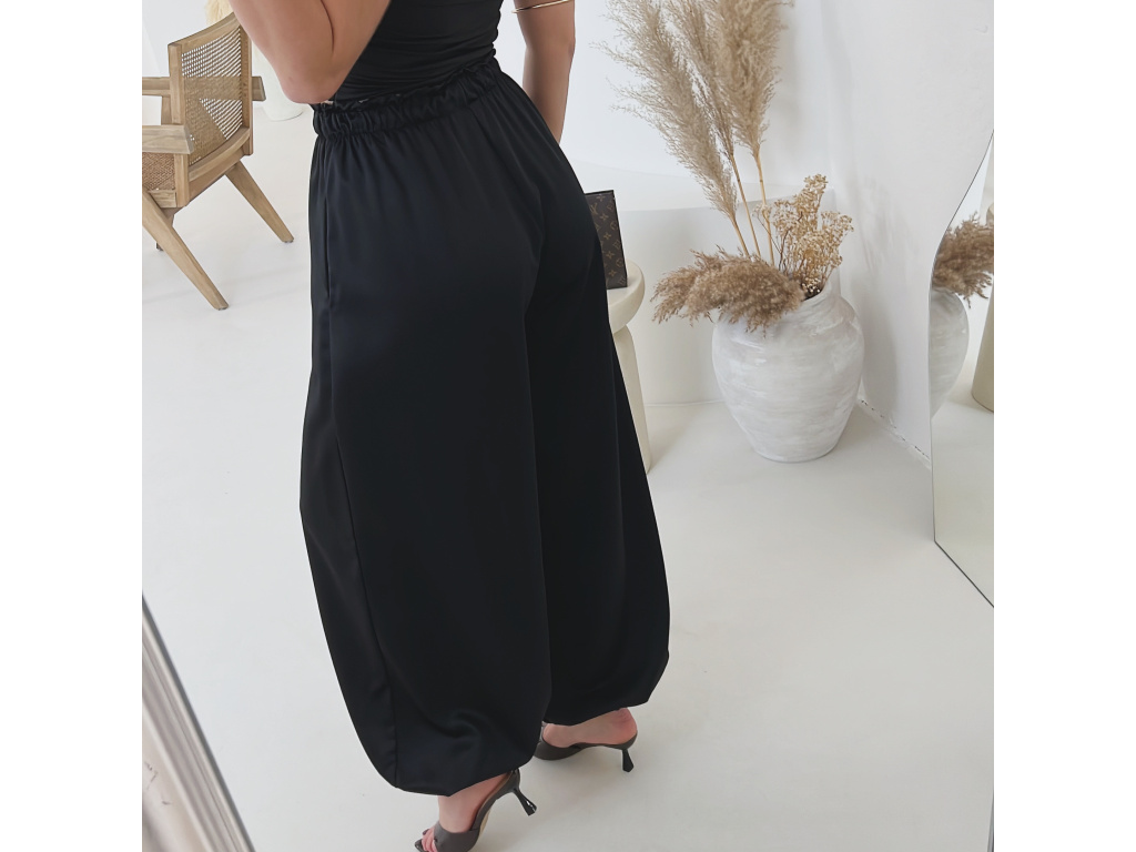 Stylové a pohodlné balonové kalhoty z jemného saténového materiálu, které zaujmou svým originálním střihem. V pase mají elastický pás, díky kterému se krásně přizpůsobí postavě, a do gumy jsou zakončeny také v dolním kraji. Působí elegantně, ale zároveň uvolněně – perfektní volba jak na každodenní nošení, tak i na večerní outfit. Dostupné v několika barvách. Mají kapsy.