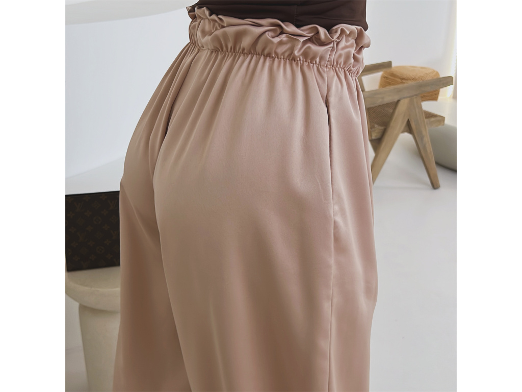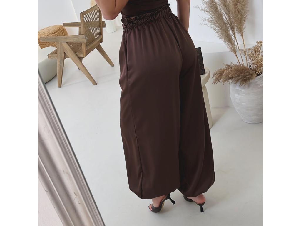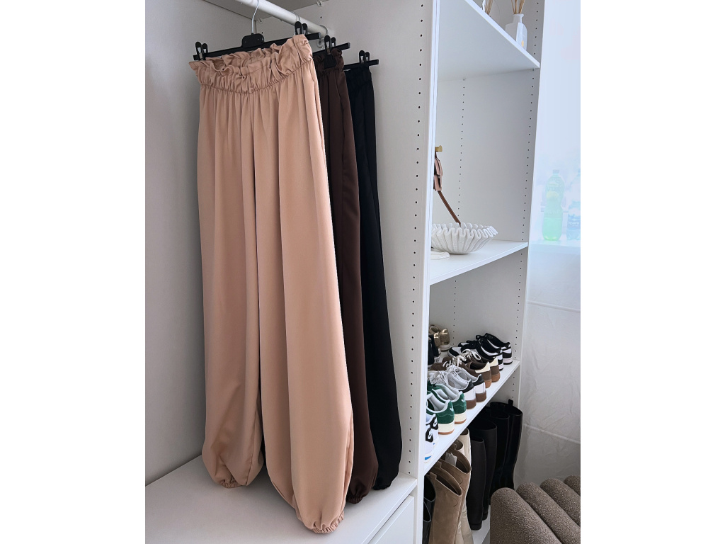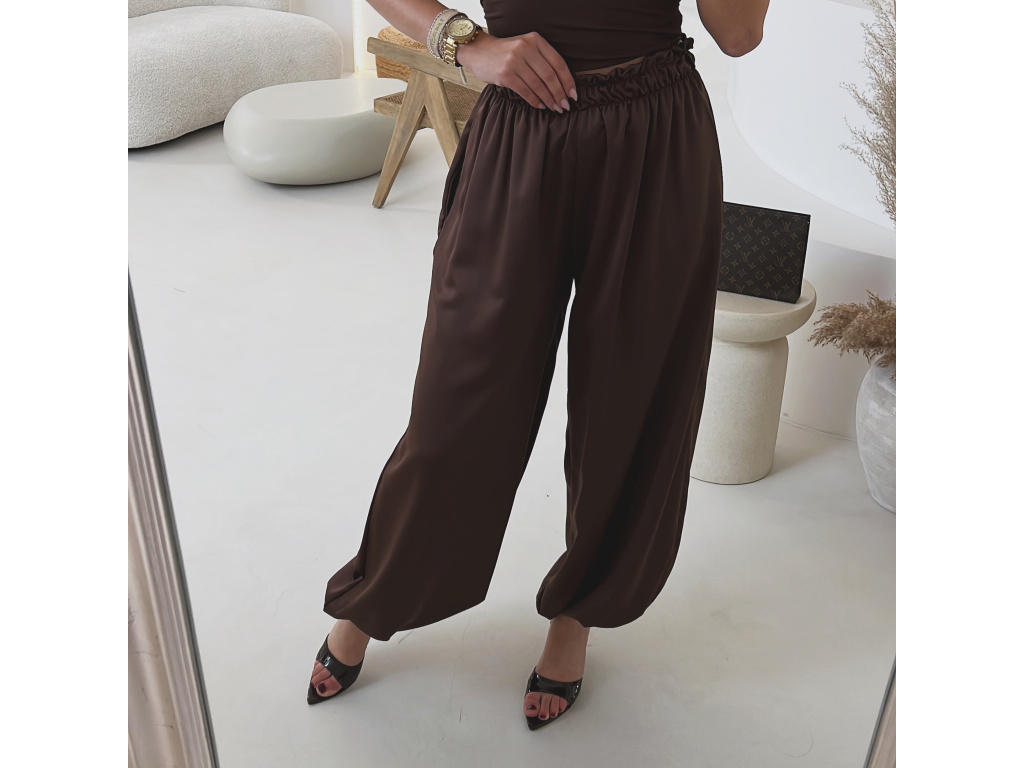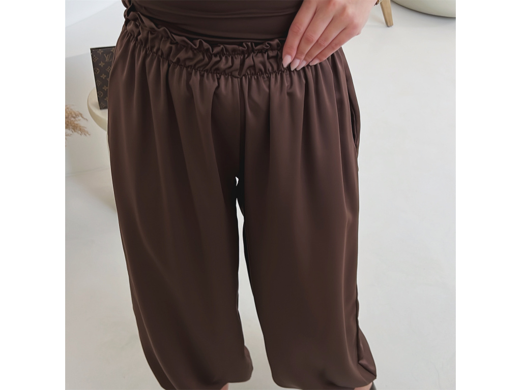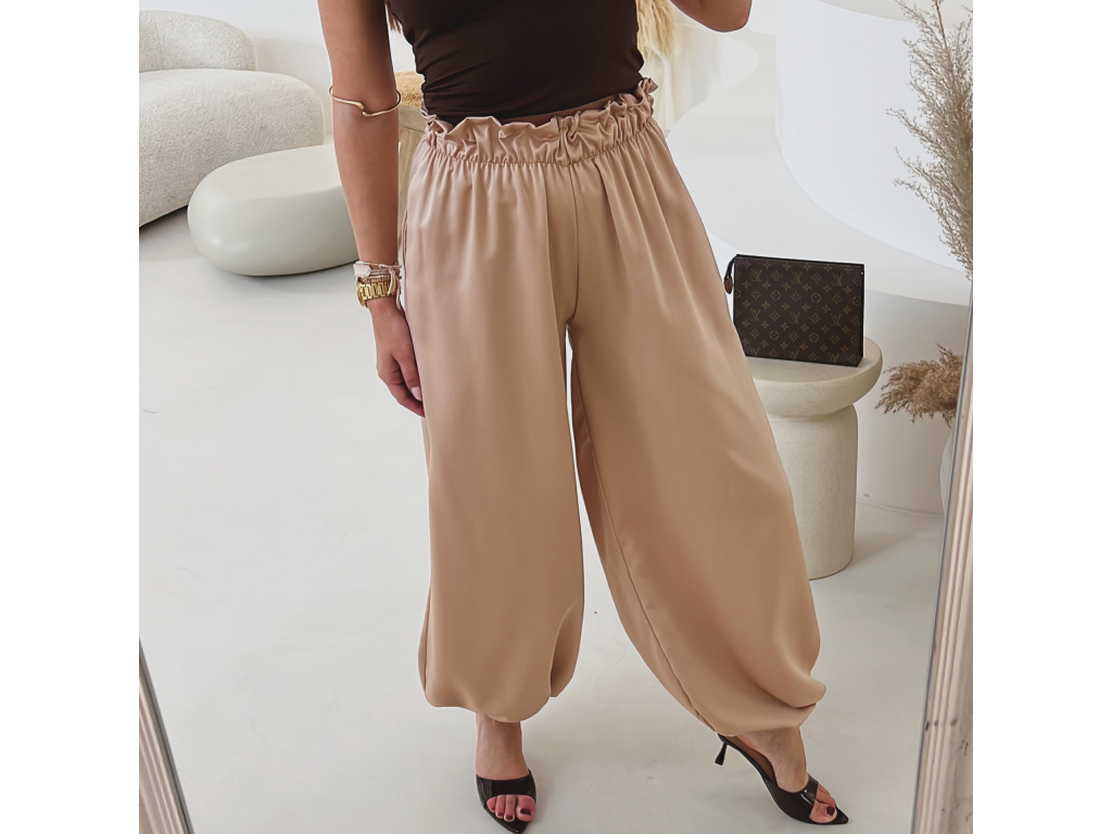 Stylové a pohodlné balonové kalhoty z jemného saténového materiálu, které zaujmou svým originálním střihem. V pase mají elastický pás, díky kterému se krásně přizpůsobí postavě, a do gumy jsou zakončeny také v dolním kraji. Působí elegantně, ale zároveň uvolněně – perfektní volba jak na každodenní nošení, tak i na večerní outfit. Dostupné v několika barvách. Mají kapsy.