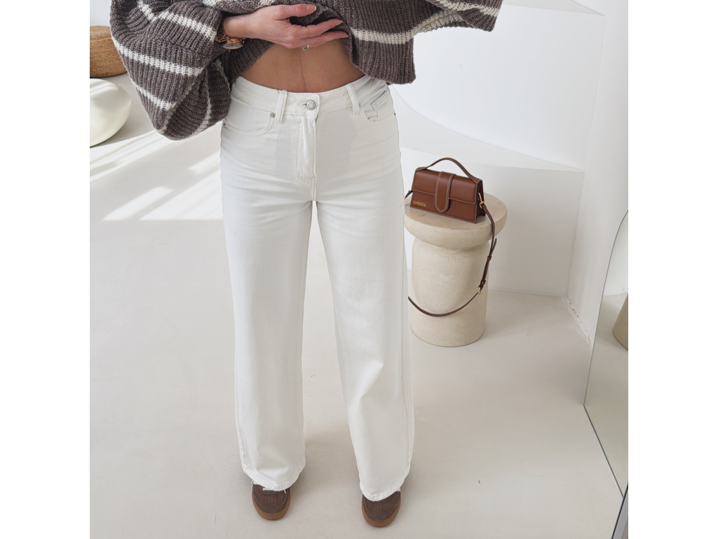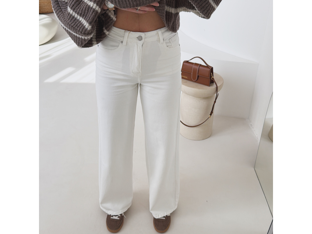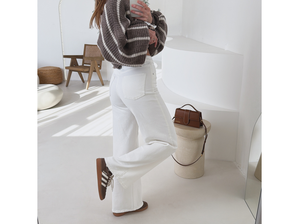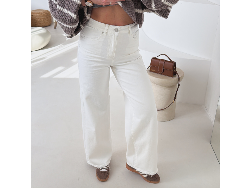 Stylové bílé kalhoty s moderním střihem, které se ke spodní části nohavic jemně rozšiřují a krásně prodlužují siluetu nohou. Jsou vyrobené z příjemného elastického materiálu, díky kterému skvěle sedí a jsou velmi pohodlné na nošení. Snadno je zkombinujete jak s elegantním, tak i ležérním outfitem. Dostupné ve velikostech XS–XL, doporučujeme zvolit vaši běžnou velikost.