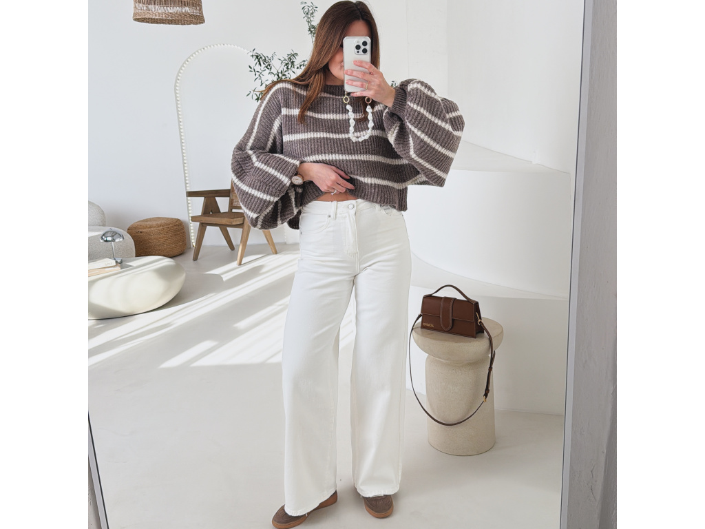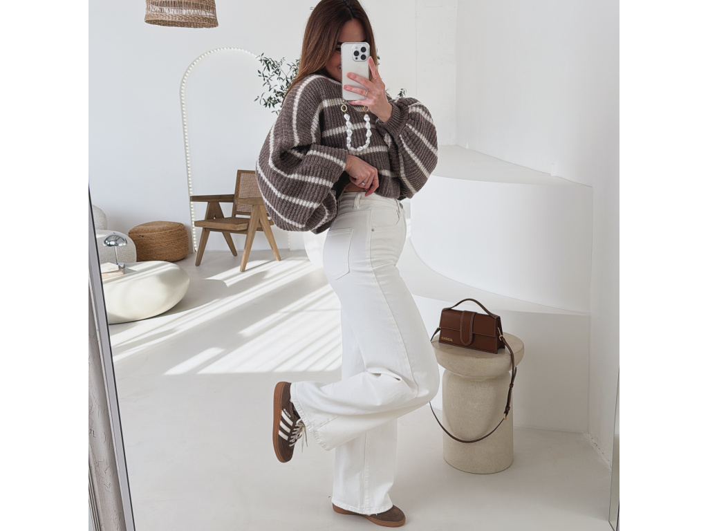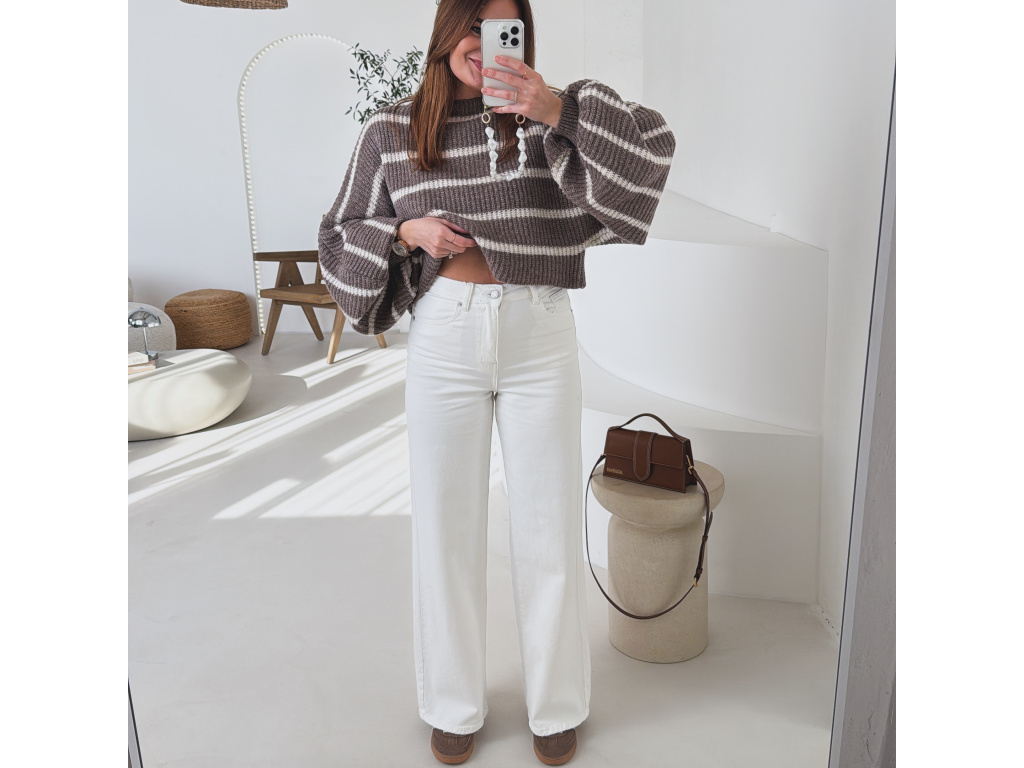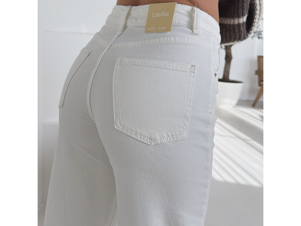 Stylové bílé kalhoty s moderním střihem, které se ke spodní části nohavic jemně rozšiřují a krásně prodlužují siluetu nohou. Jsou vyrobené z příjemného elastického materiálu, díky kterému skvěle sedí a jsou velmi pohodlné na nošení. Snadno je zkombinujete jak s elegantním, tak i ležérním outfitem. Dostupné ve velikostech XS–XL, doporučujeme zvolit vaši běžnou velikost.