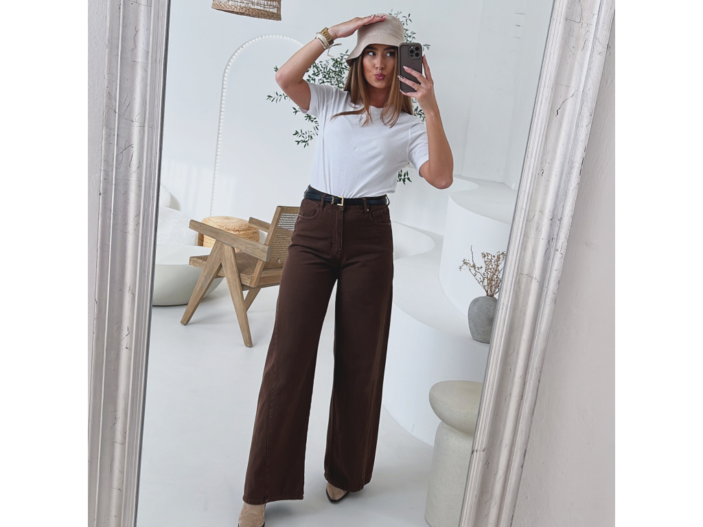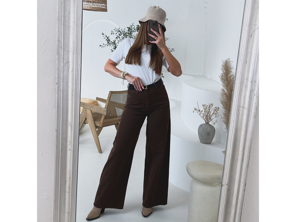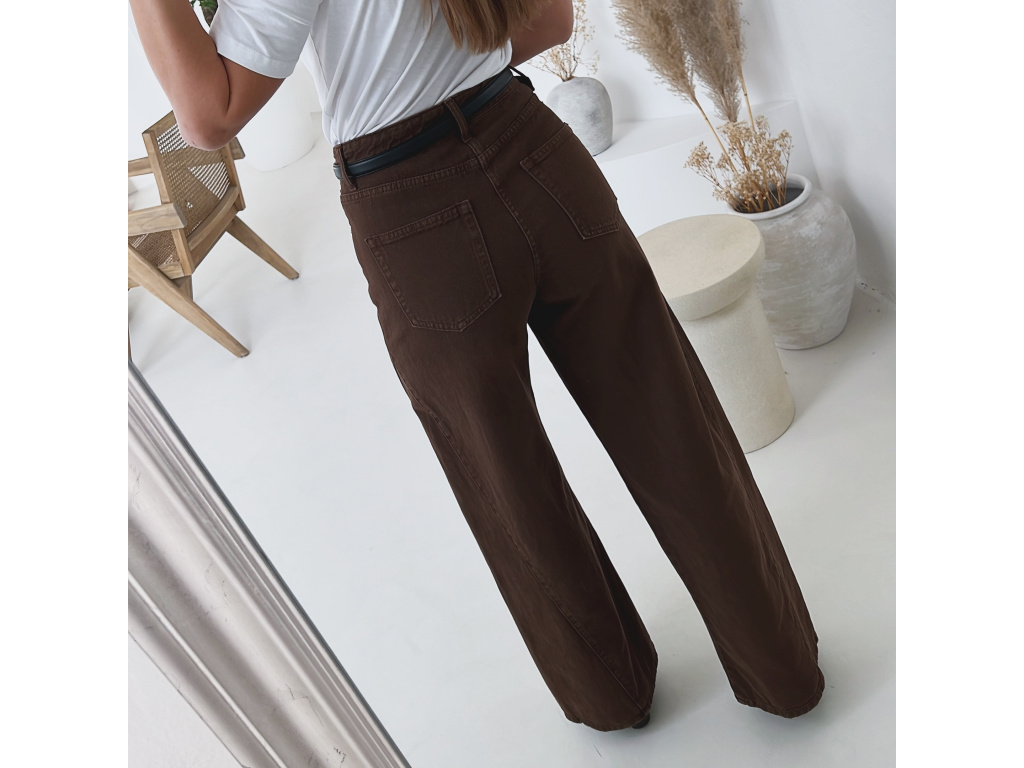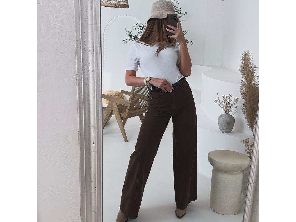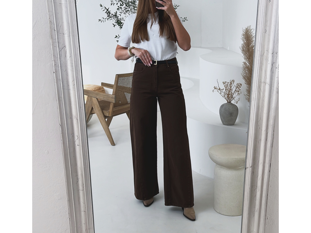 Elegantní hnědé kalhoty s rovnějším volnějším střihem, který krásně prodlouží siluetu a působí ležérně chic. Kalhoty jsou ušité z pevnějšího, neelastického materiálu, který drží tvar a působí luxusně. Vysoký pas a klasické kapsy zajišťují pohodlné nošení i praktické využití. Skvěle se hodí k tričku, halence i saku.