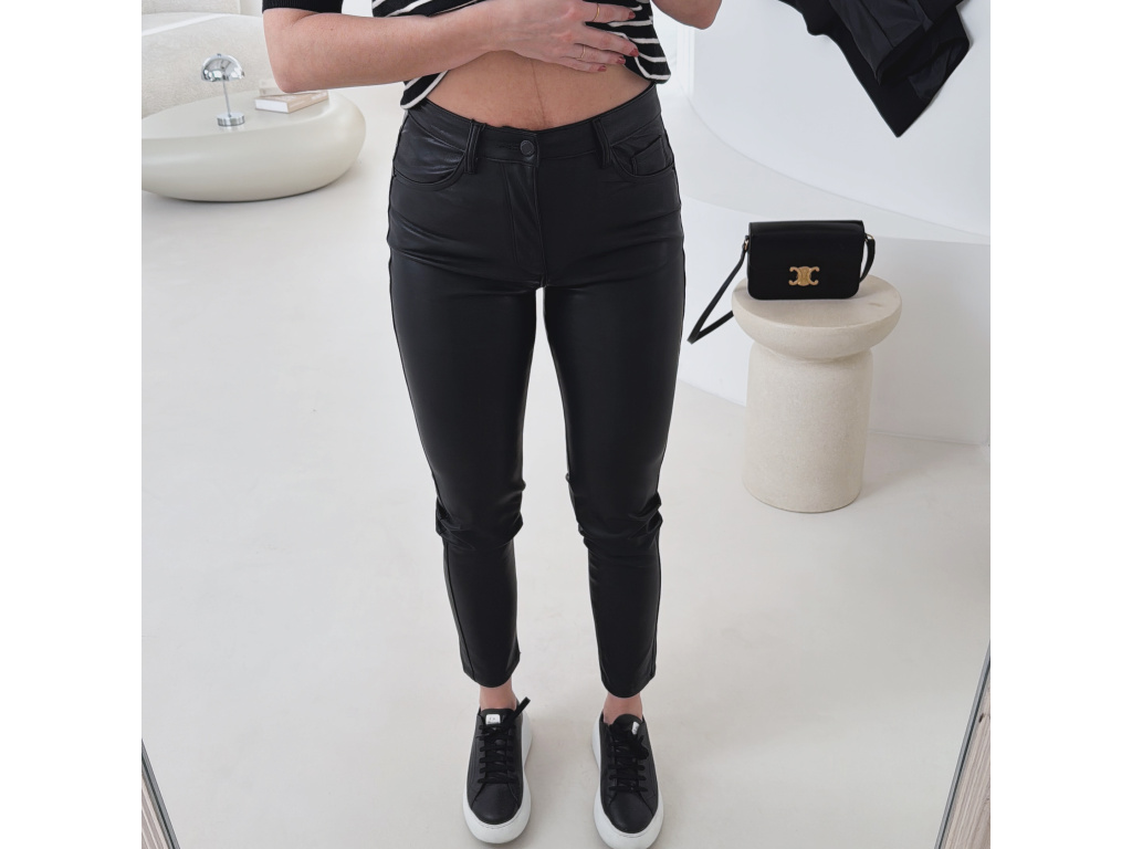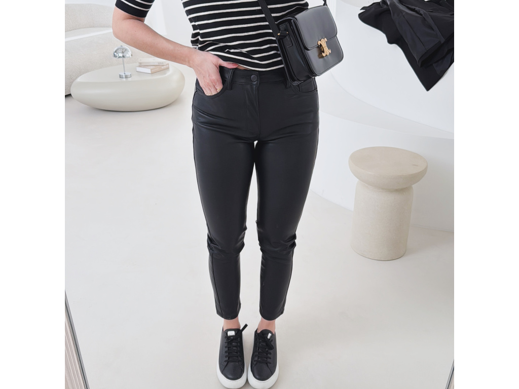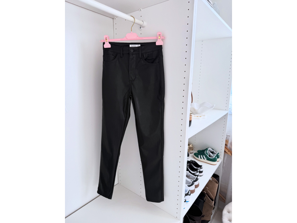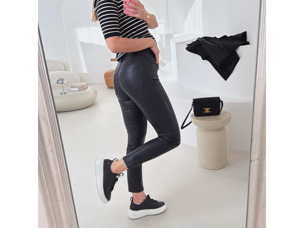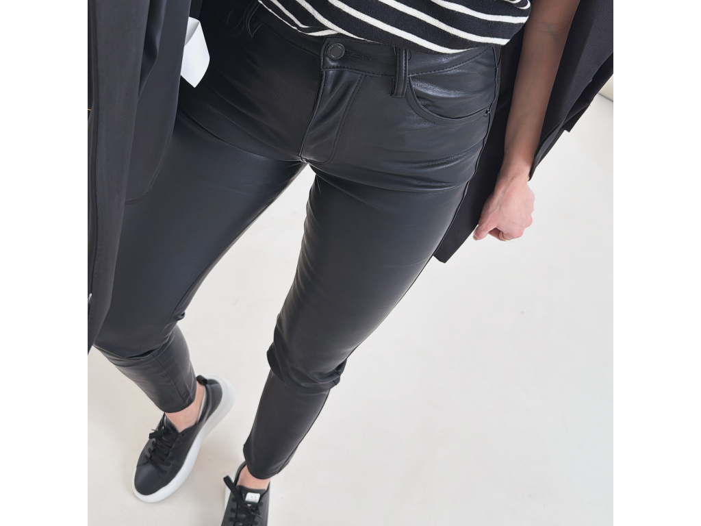 Koženkové skinny džíny v černé barvě s vysokým pasem a úzkými nohavicemi. Mírně elastický materiál se krásně přizpůsobí postavě a zvýrazní siluetu. Nadčasový kousek, který využiješ ke každodenním i elegantnějším outfitům.