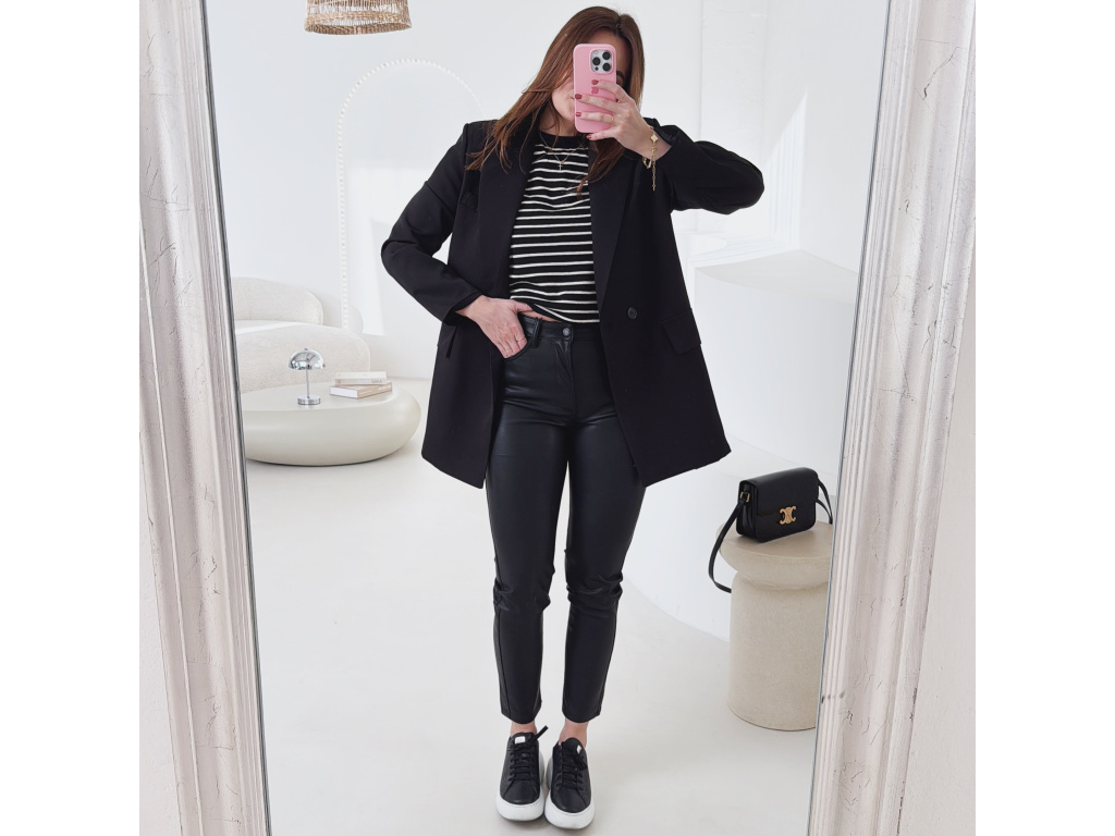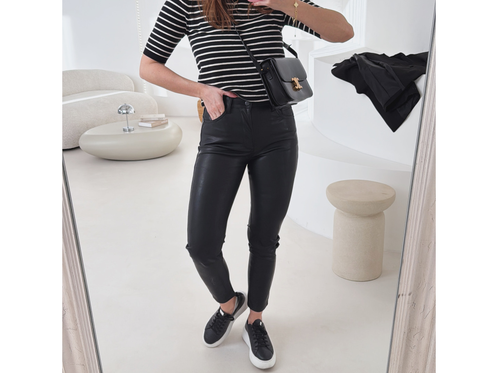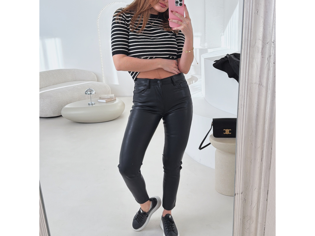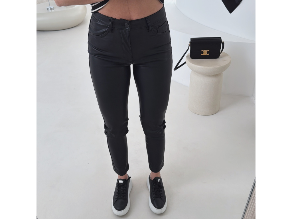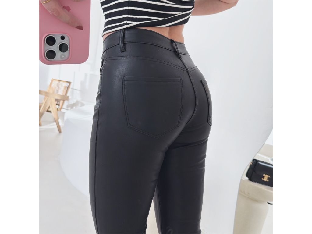 Koženkové skinny džíny v černé barvě s vysokým pasem a úzkými nohavicemi. Mírně elastický materiál se krásně přizpůsobí postavě a zvýrazní siluetu. Nadčasový kousek, který využiješ ke každodenním i elegantnějším outfitům.