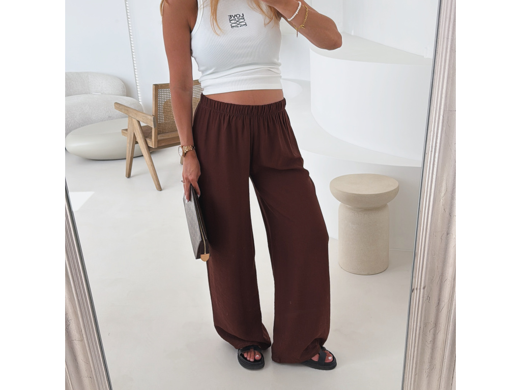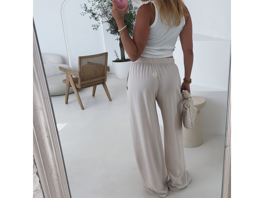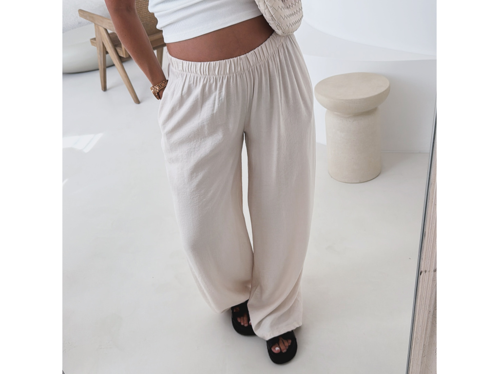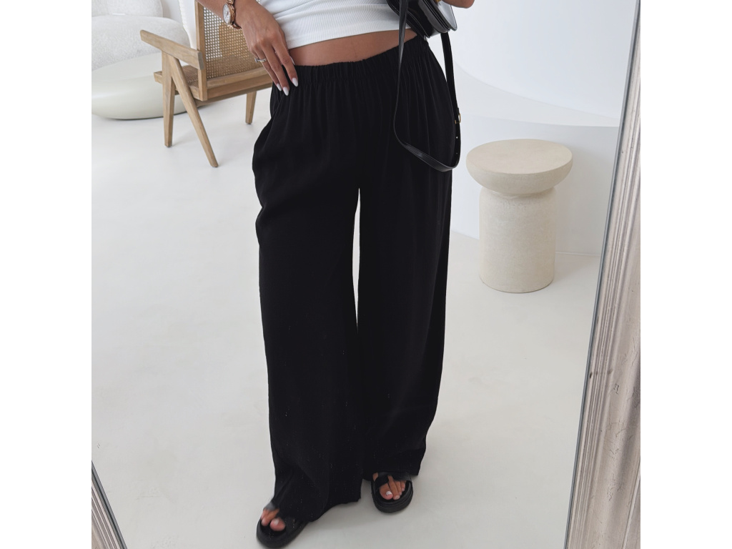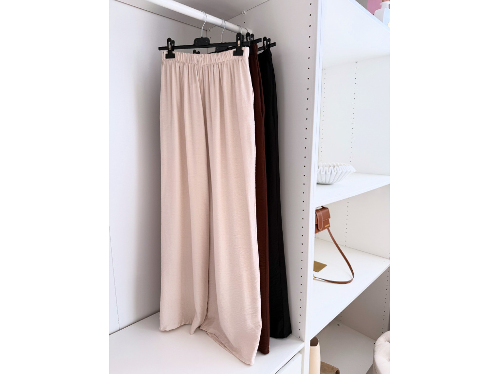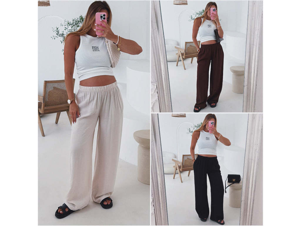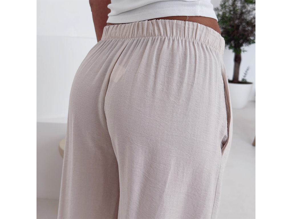 Pohodlné široké kalhoty s elastickým pasem, které se dokonale přizpůsobí postavě. Vyrobené z lehkého, vzdušného materiálu, ideálního pro letní dny i volnočasové nošení. Snadno je zkombinuješ s basic topem, košilí i plavkami na pláž. K dispozici ve více barevných variantách. Mají boční kapsy. Velikost je univerzální, sedí na XS, S a M.