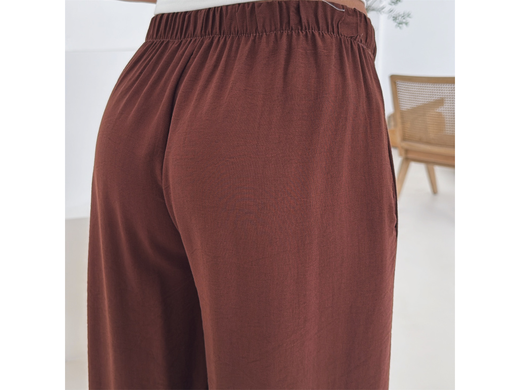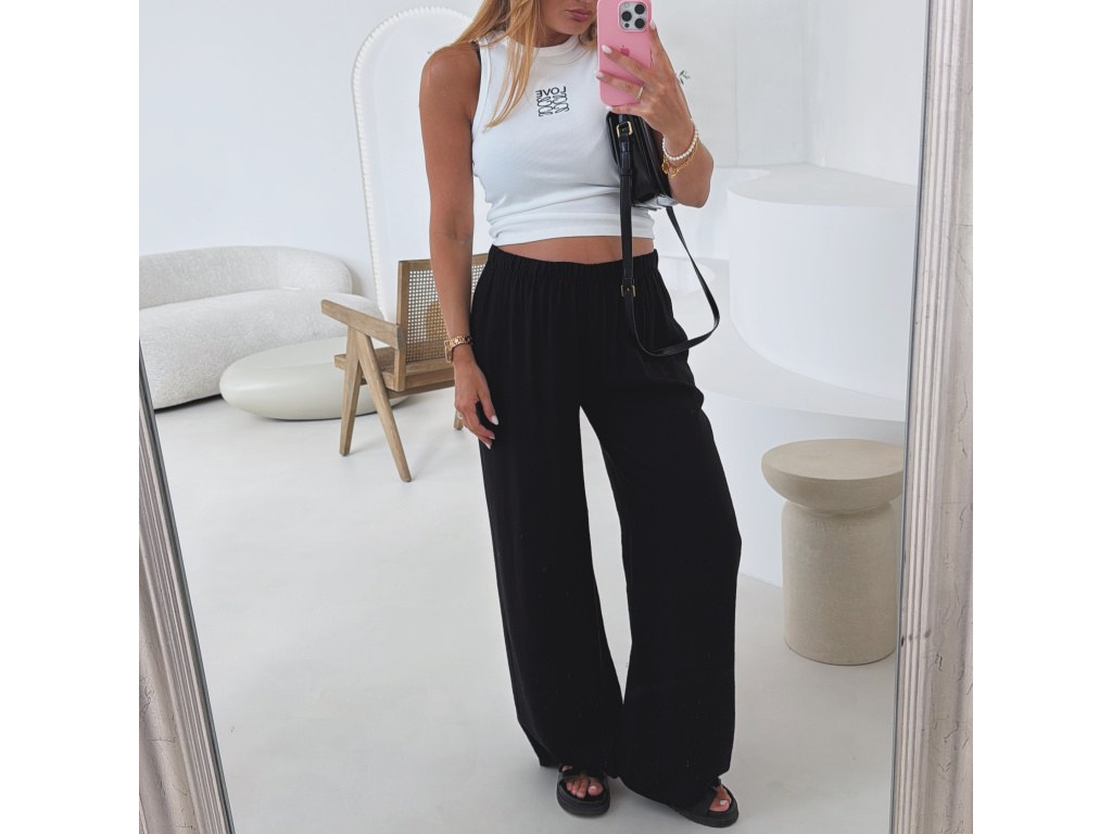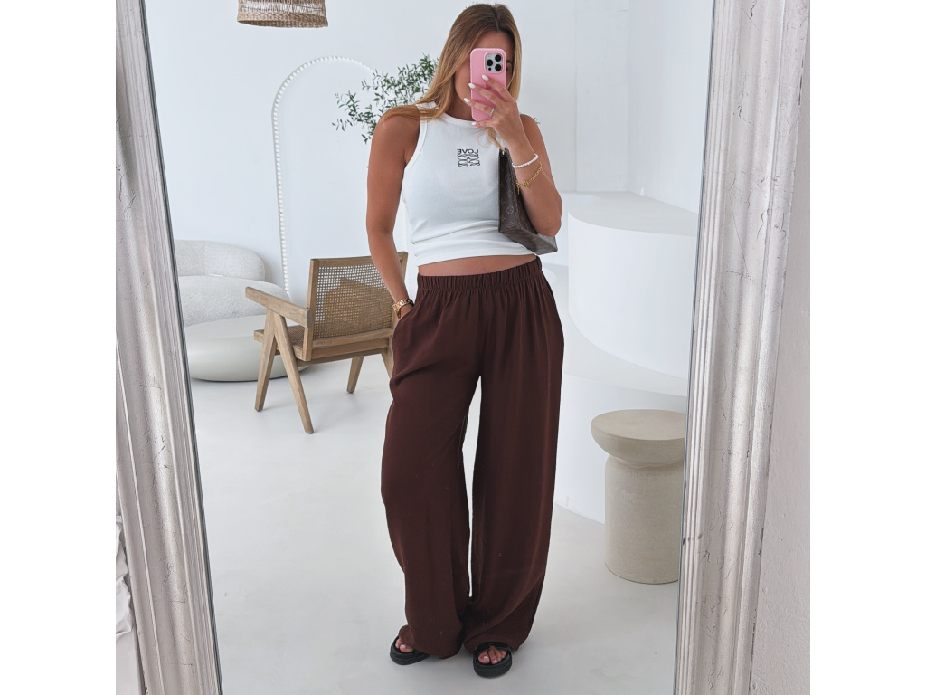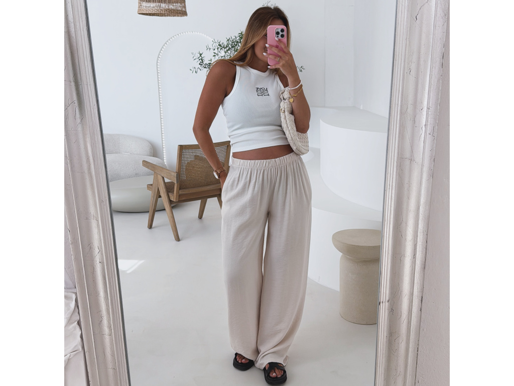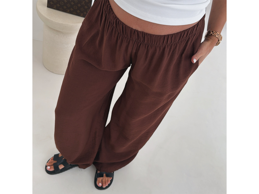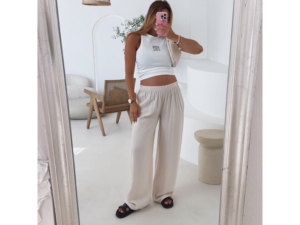 Pohodlné široké kalhoty s elastickým pasem, které se dokonale přizpůsobí postavě. Vyrobené z lehkého, vzdušného materiálu, ideálního pro letní dny i volnočasové nošení. Snadno je zkombinuješ s basic topem, košilí i plavkami na pláž. K dispozici ve více barevných variantách. Mají boční kapsy. Velikost je univerzální, sedí na XS, S a M.