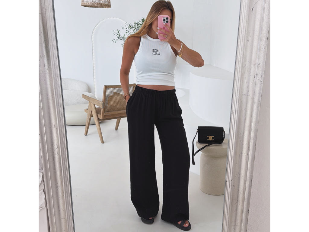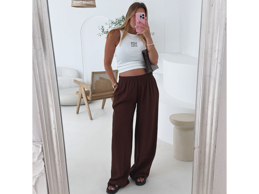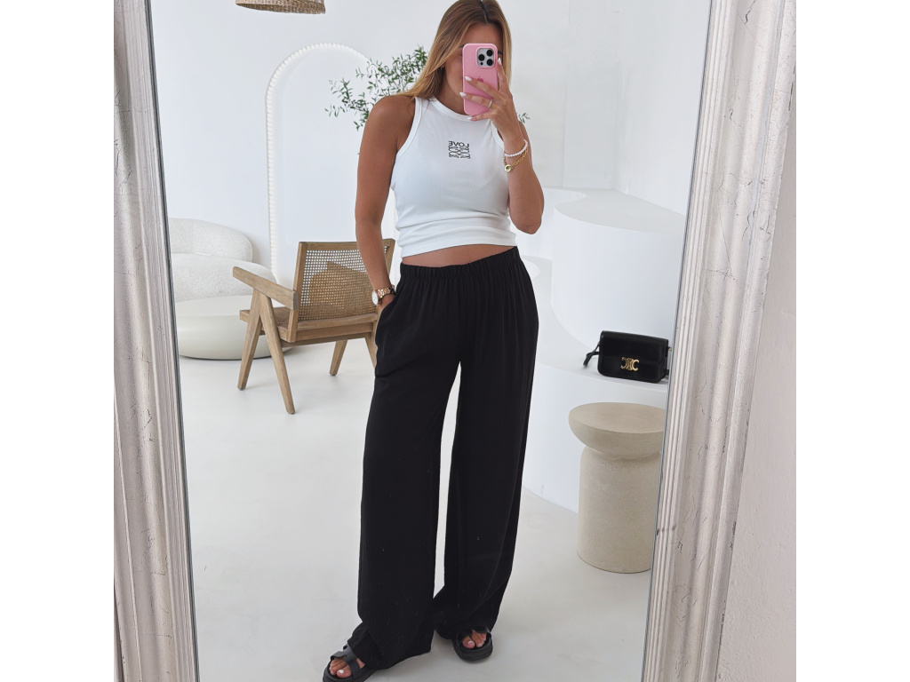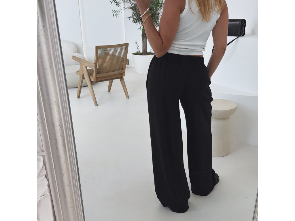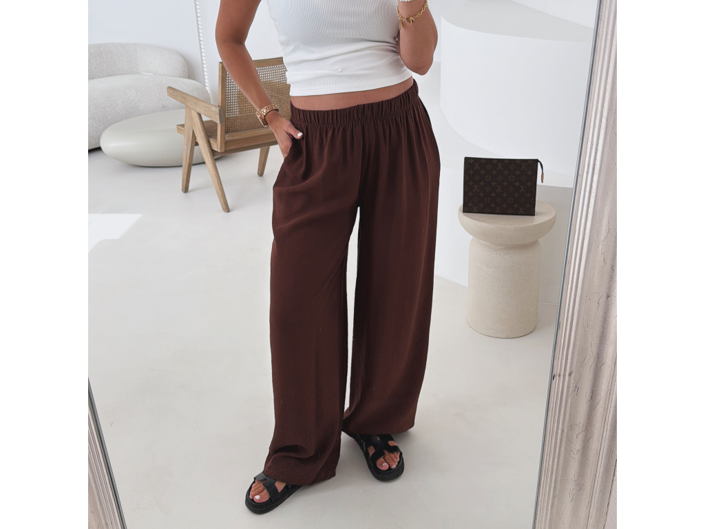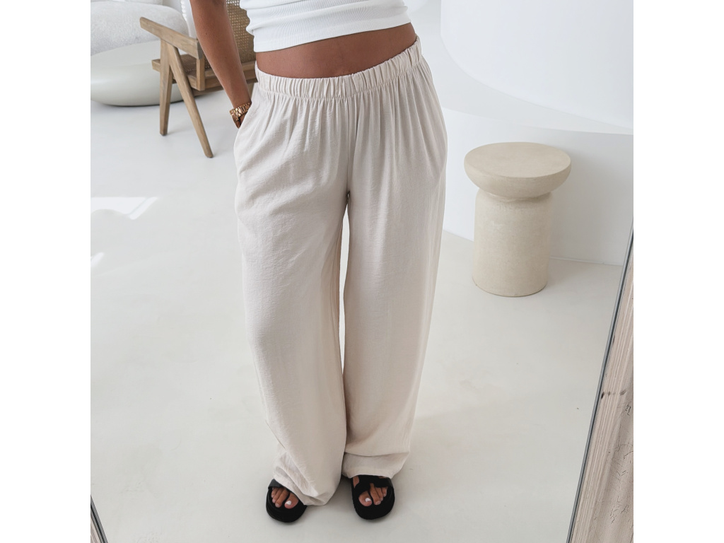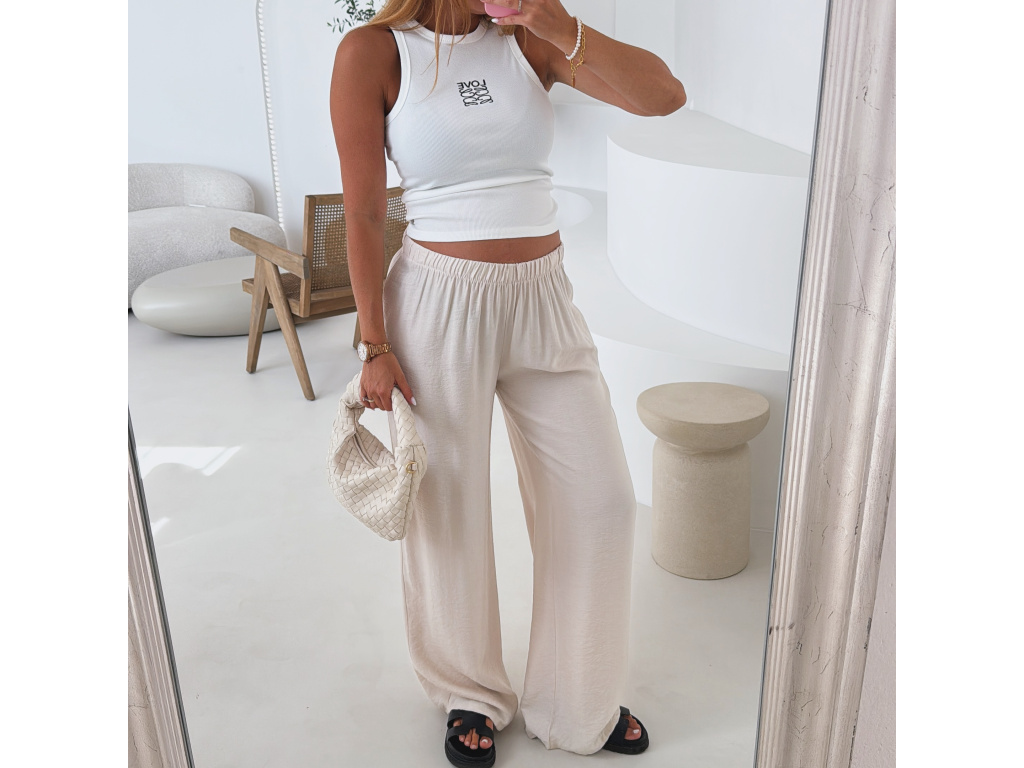 Pohodlné široké kalhoty s elastickým pasem, které se dokonale přizpůsobí postavě. Vyrobené z lehkého, vzdušného materiálu, ideálního pro letní dny i volnočasové nošení. Snadno je zkombinuješ s basic topem, košilí i plavkami na pláž. K dispozici ve více barevných variantách. Mají boční kapsy. Velikost je univerzální, sedí na XS, S a M.