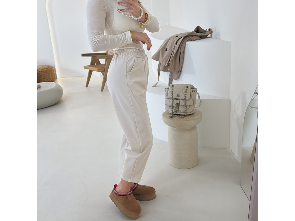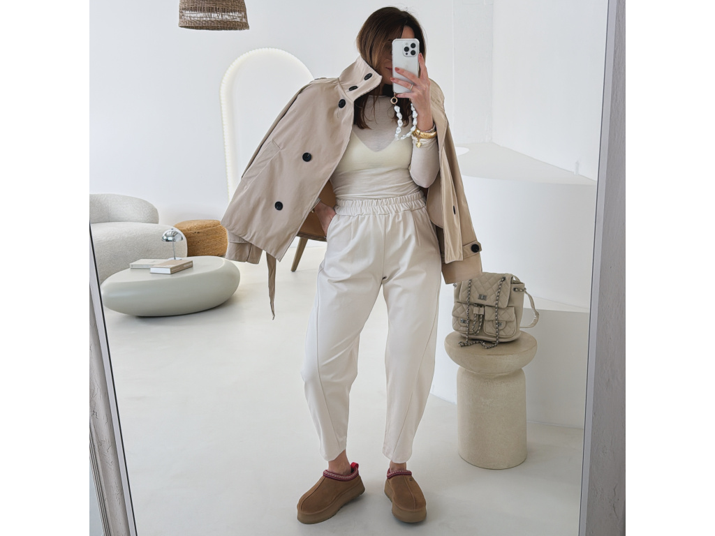 Stylové tepláky z lehkého a příjemného materiálu, který zajišťuje maximální pohodlí při nošení. Mají elastický pas, praktické kapsy a moderní mírně barrelový střih, který působí uvolněně, ale stále upraveně. Skvěle se kombinují s basic topem, mikinou i sakem pro ležérně-elegantní look. Ideální kousek pro každodenní nošení.