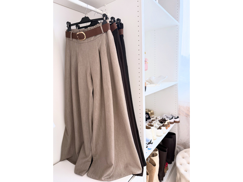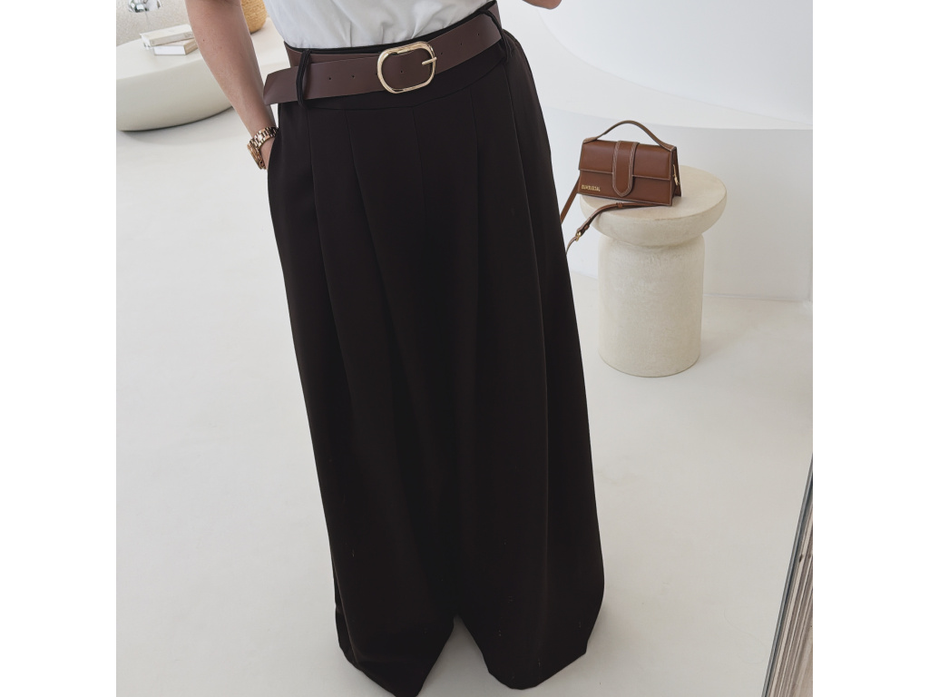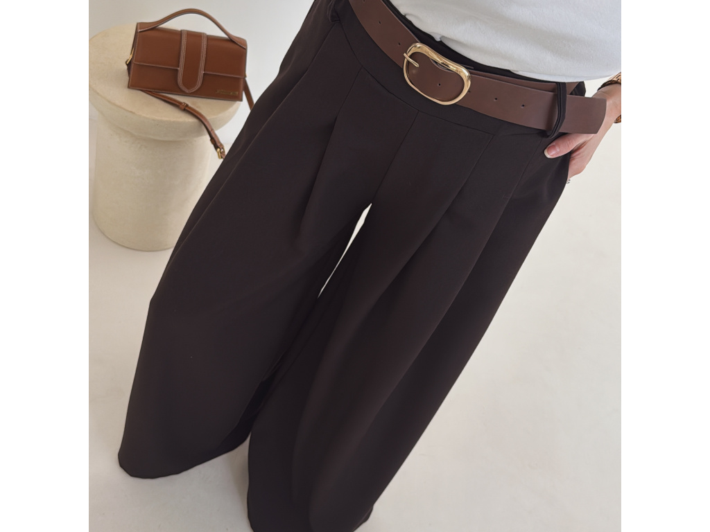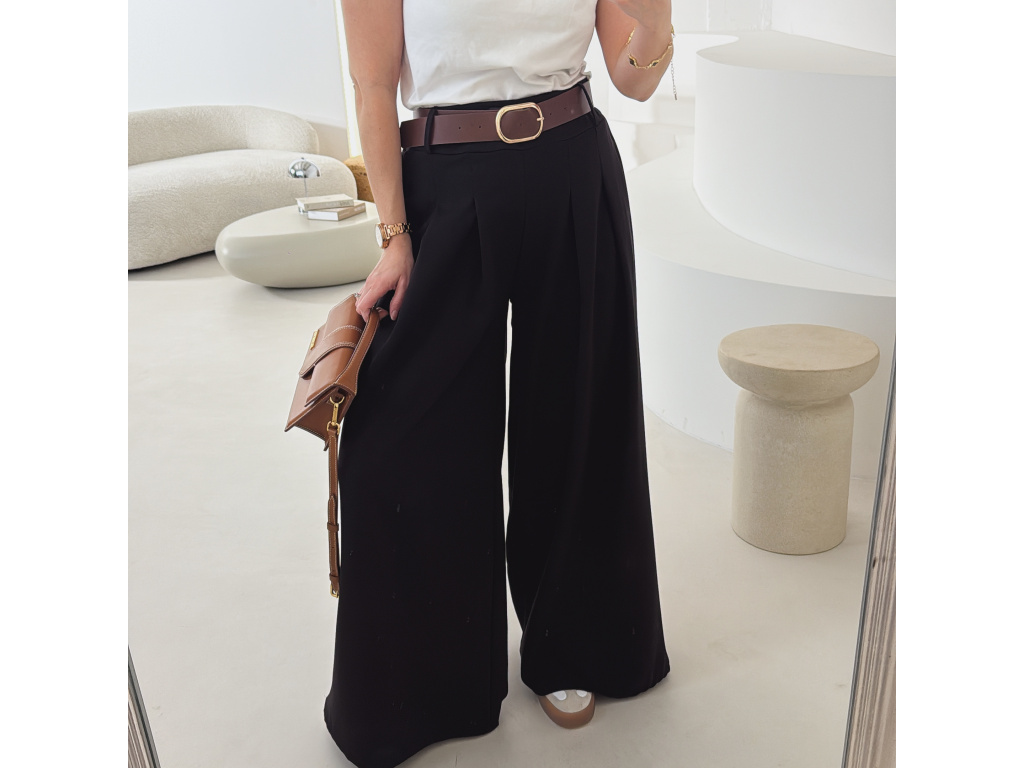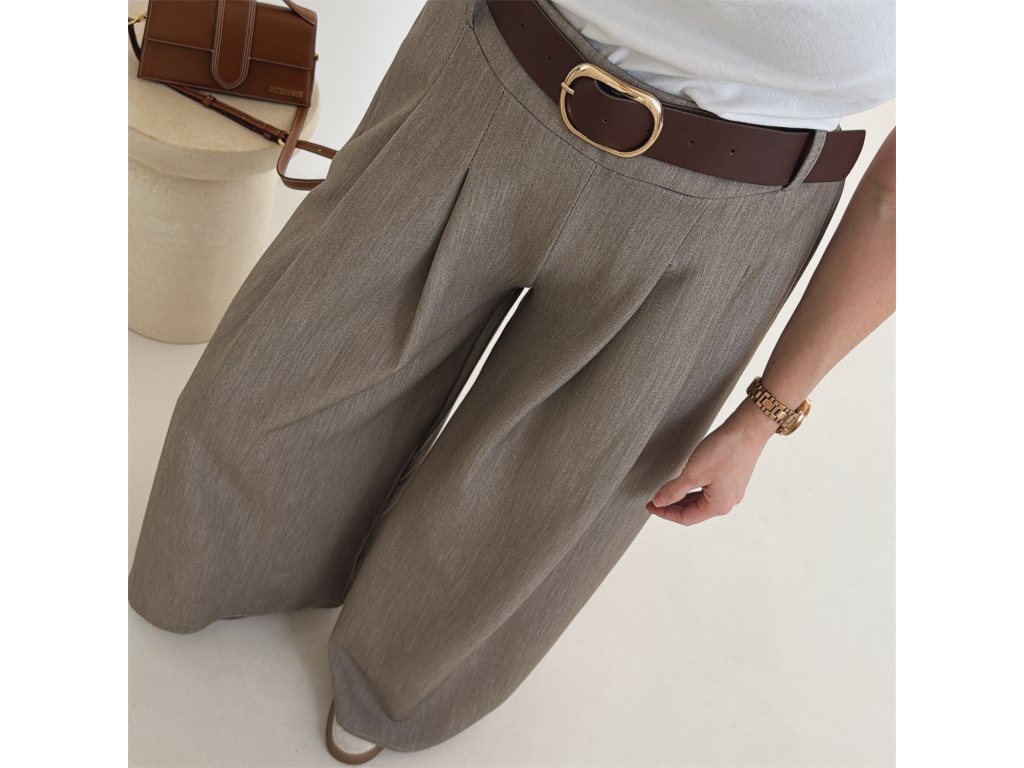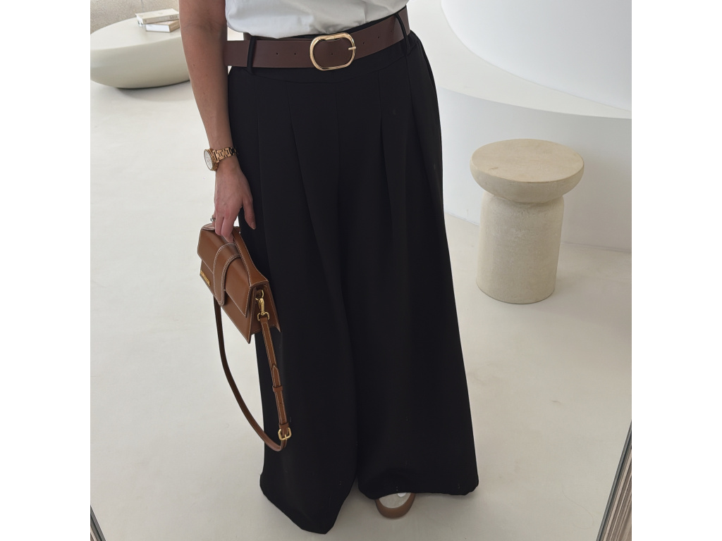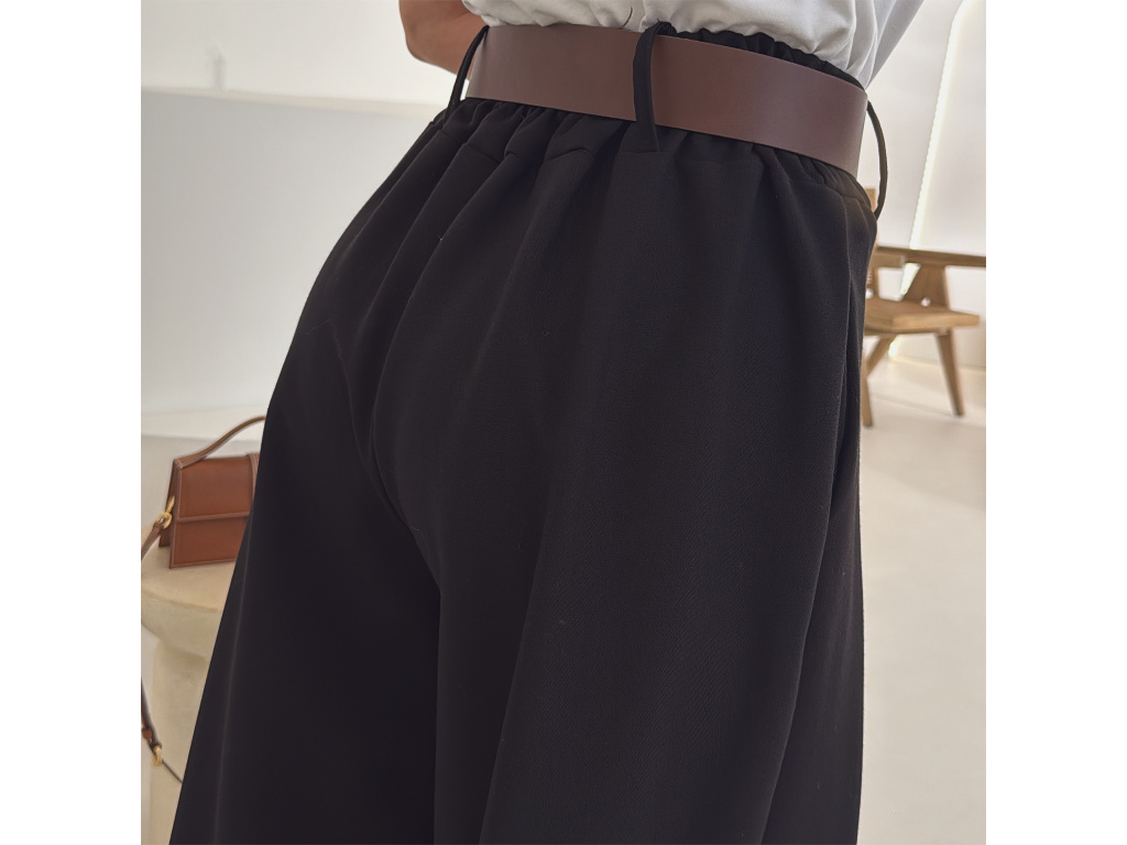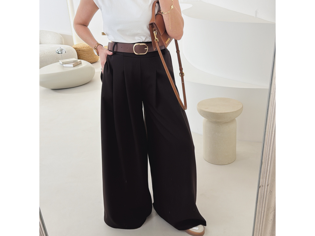 Elegantní široké kalhoty s vysokým pasem a stylovým páskem. Zadní část pasu je doplněna pružnou gumou, díky které se kalhoty krásně přizpůsobí postavě a jsou velmi pohodlné na nošení. Volný střih opticky prodlužuje nohy a působí elegantně i ležérně zároveň.