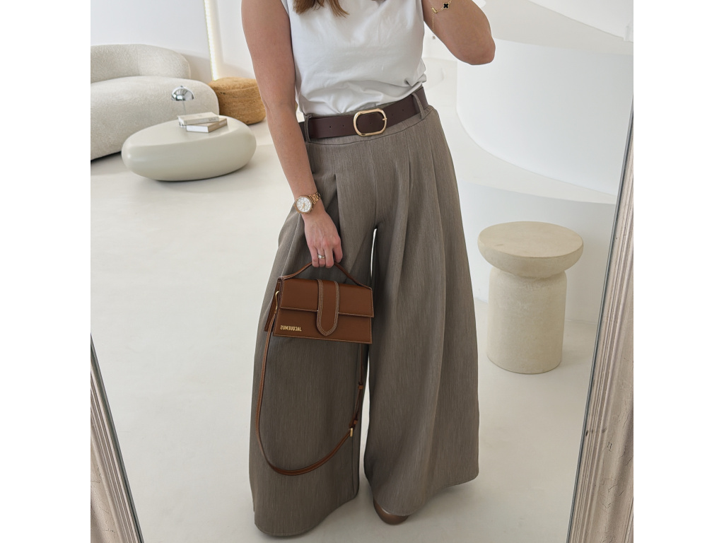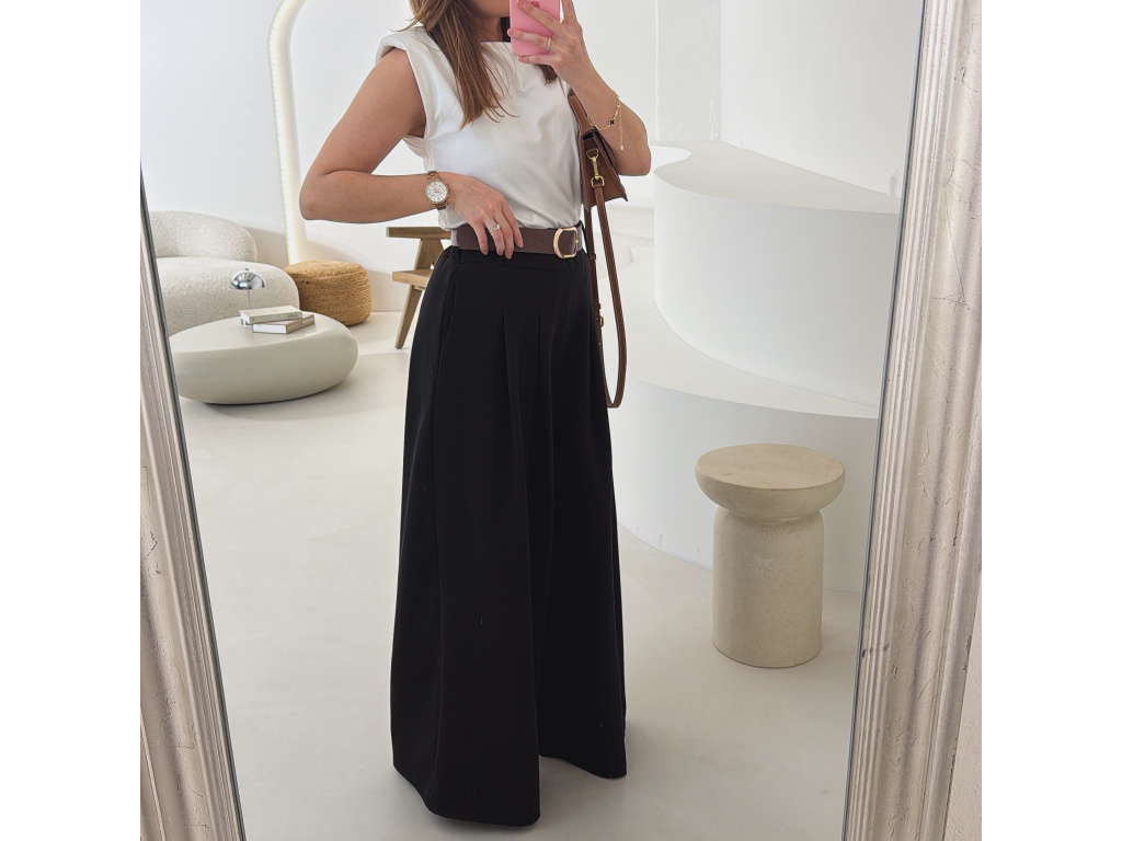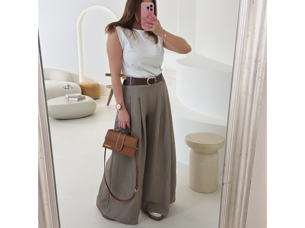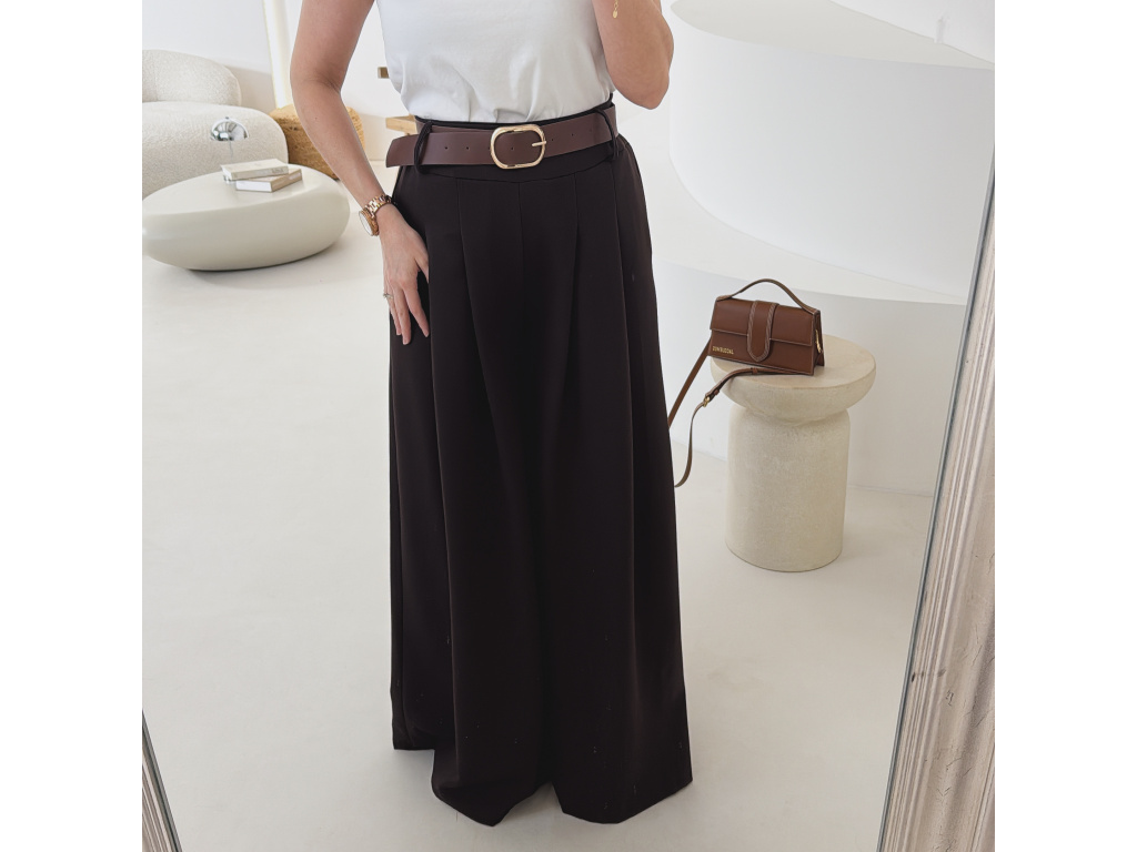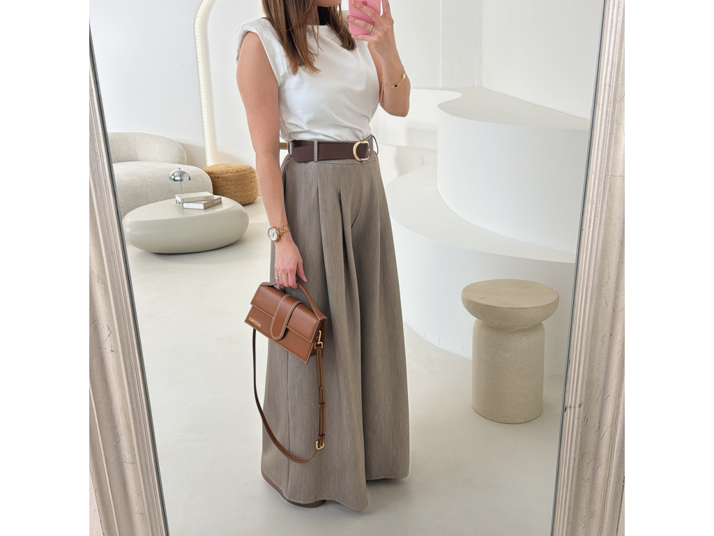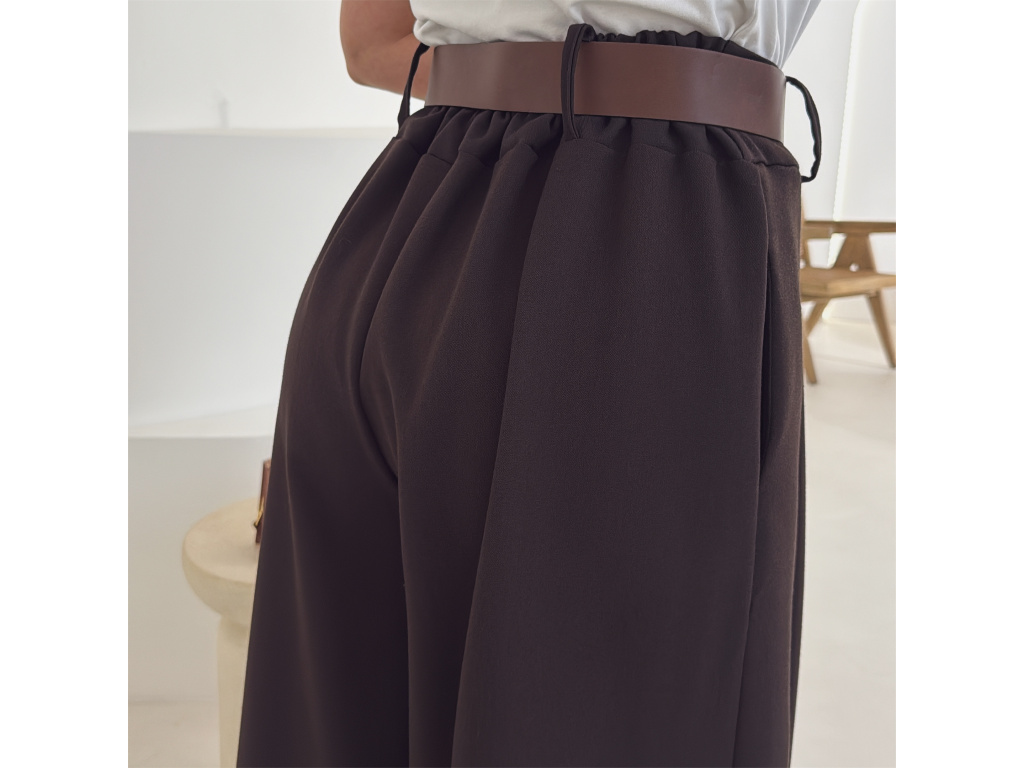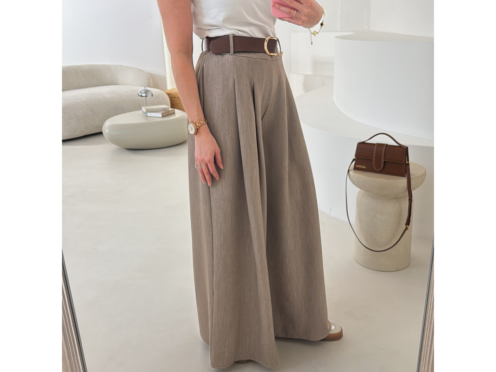 Elegantní široké kalhoty s vysokým pasem a stylovým páskem. Zadní část pasu je doplněna pružnou gumou, díky které se kalhoty krásně přizpůsobí postavě a jsou velmi pohodlné na nošení. Volný střih opticky prodlužuje nohy a působí elegantně i ležérně zároveň.
