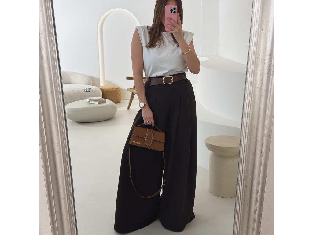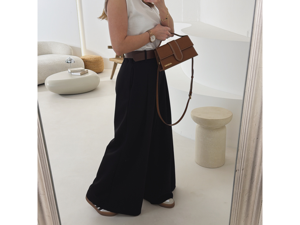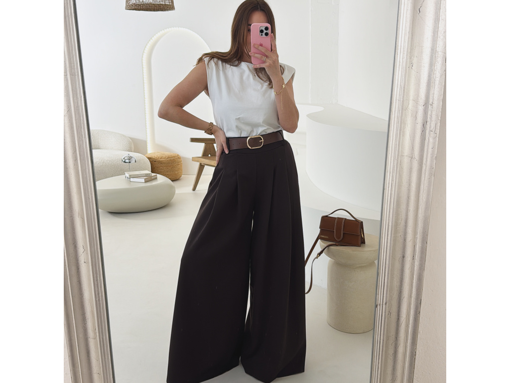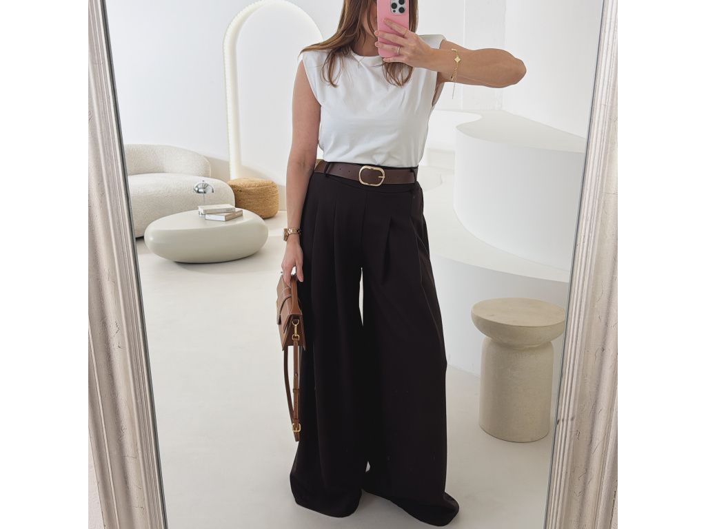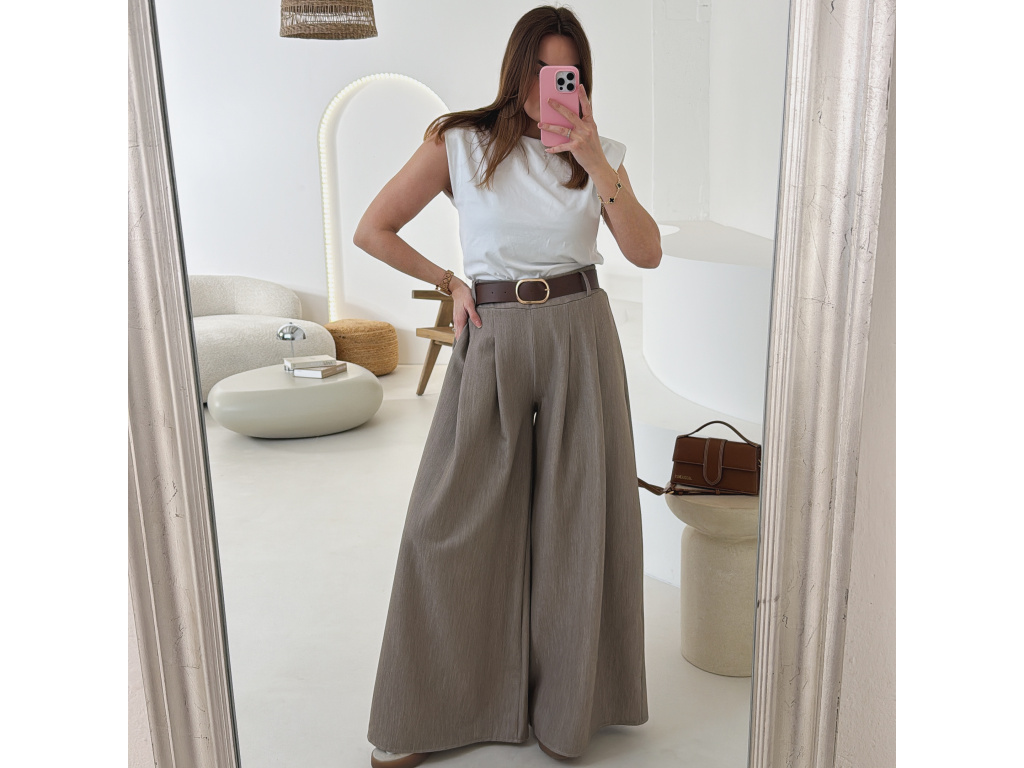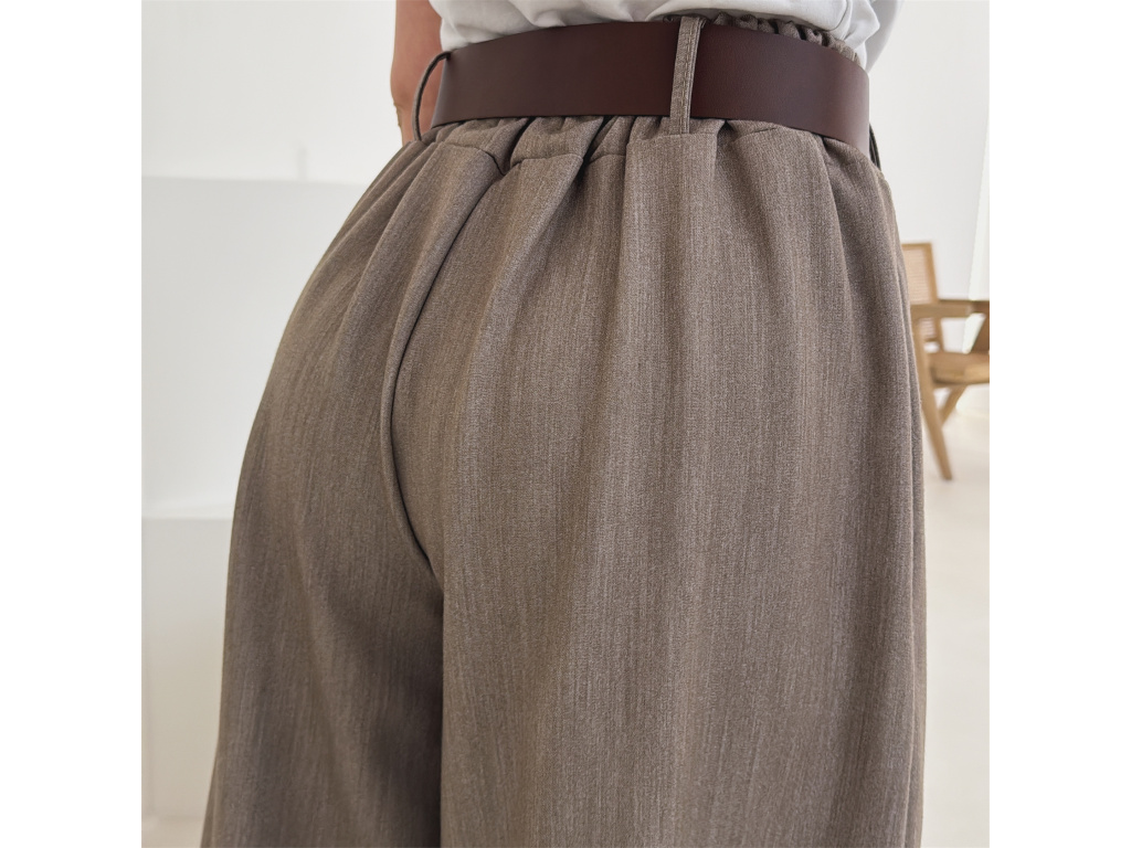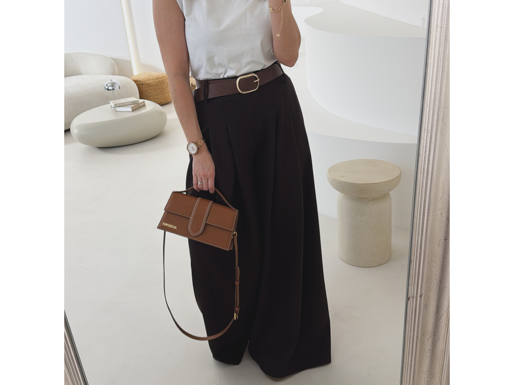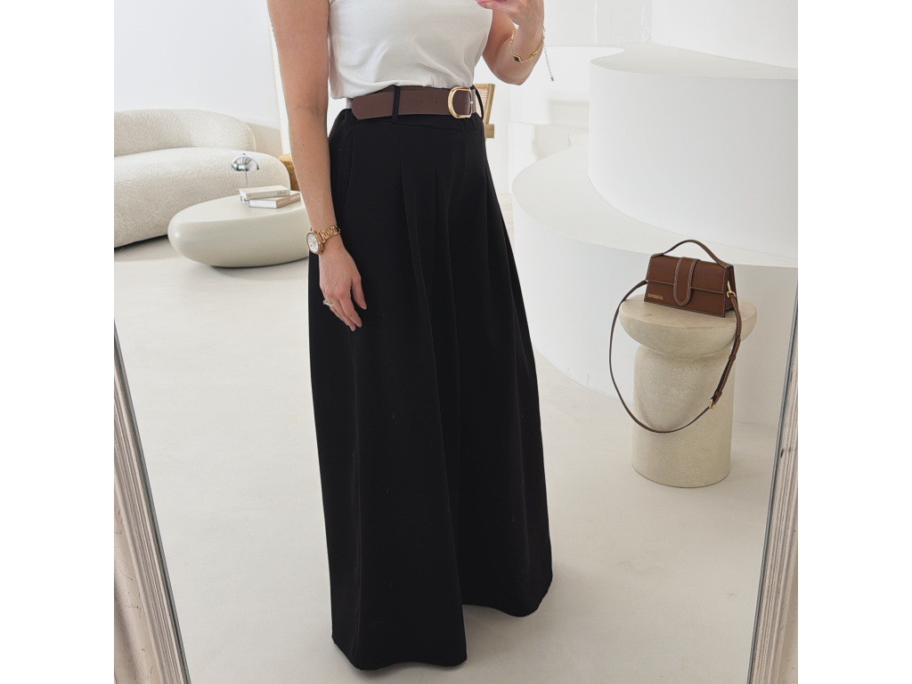 Elegantní široké kalhoty s vysokým pasem a stylovým páskem. Zadní část pasu je doplněna pružnou gumou, díky které se kalhoty krásně přizpůsobí postavě a jsou velmi pohodlné na nošení. Volný střih opticky prodlužuje nohy a působí elegantně i ležérně zároveň.