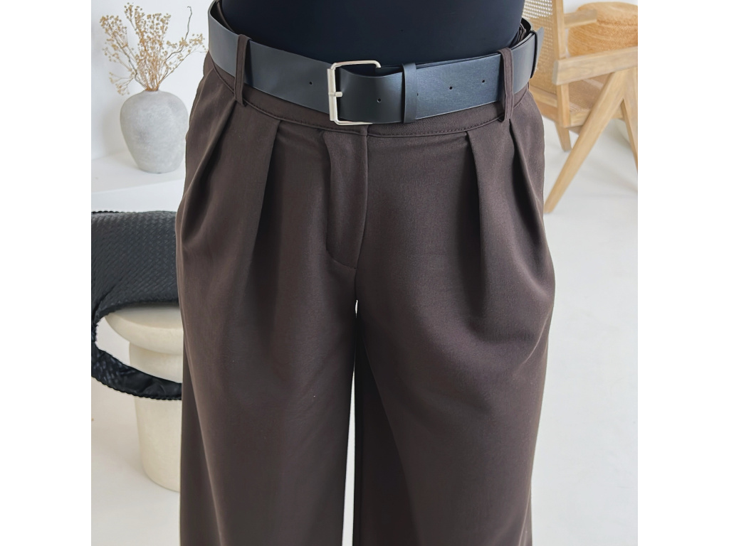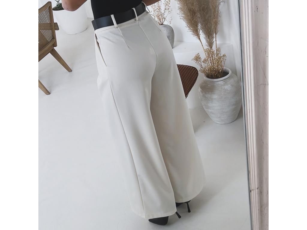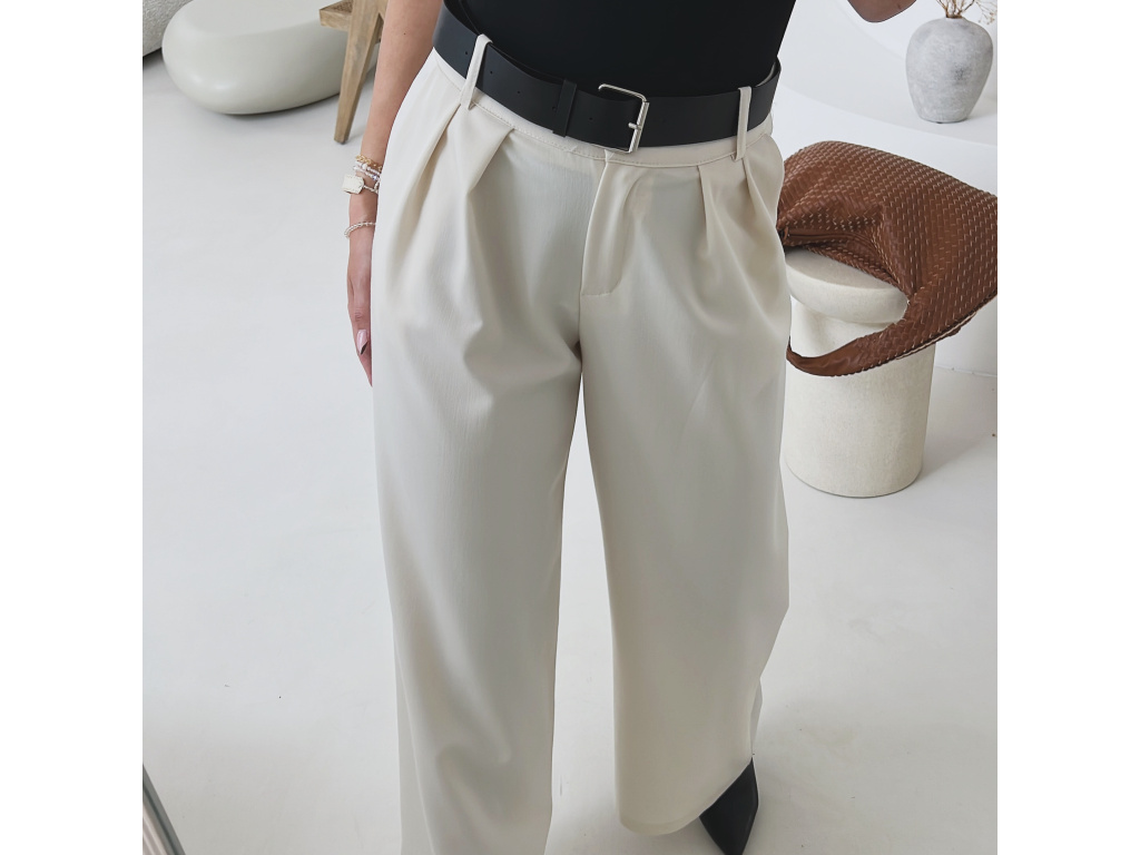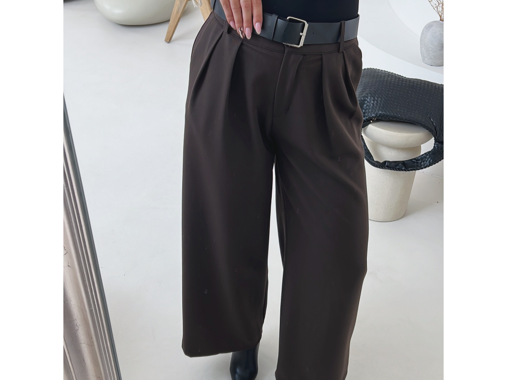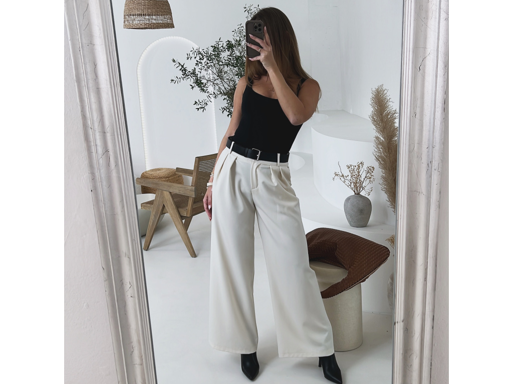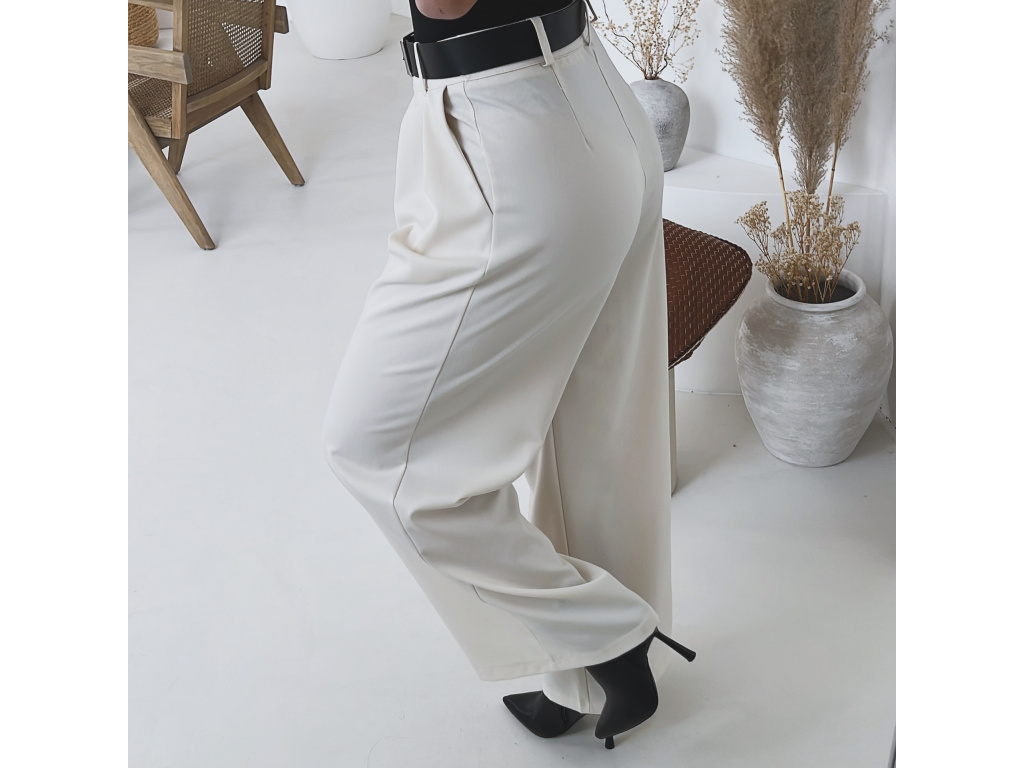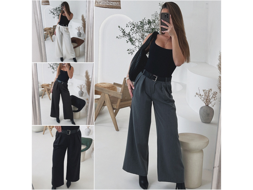 Elegantní a nadčasové široké kalhoty, které spojují styl a pohodlí. Mají klasický střih s vyšším pasem, praktické kapsy a zapínání na knoflík a zip. Součástí je i pásek v černé barvě, který krásně dotvoří celkový look a zvýrazní siluetu. Ideální k business i ležérním outfitům.