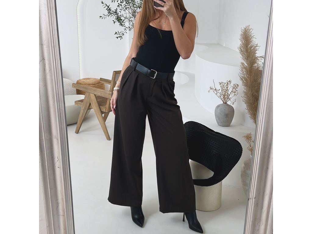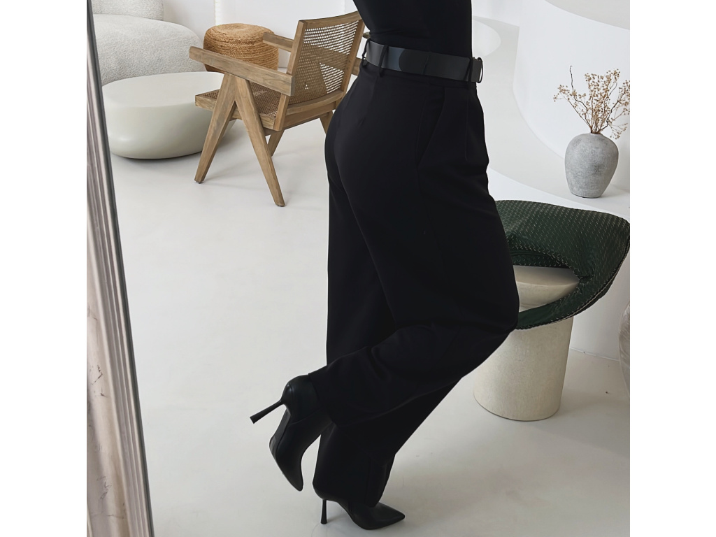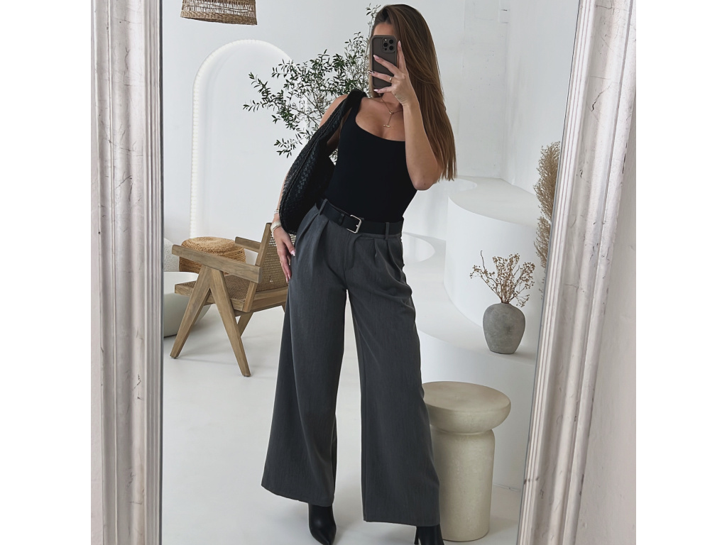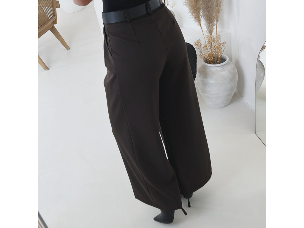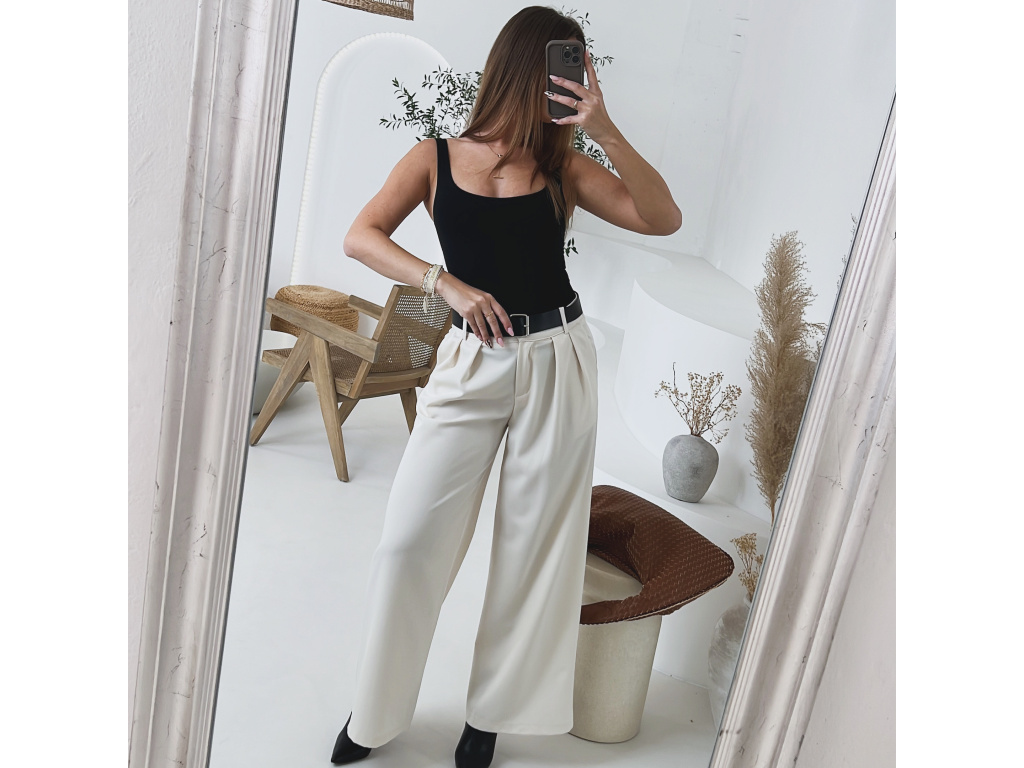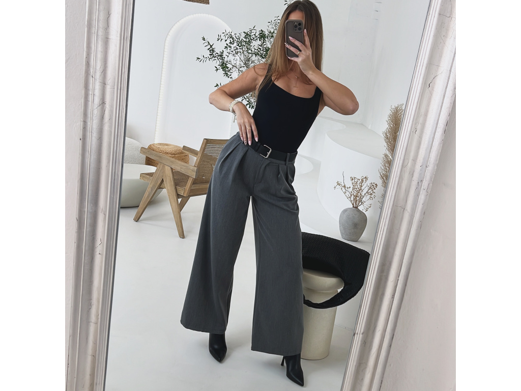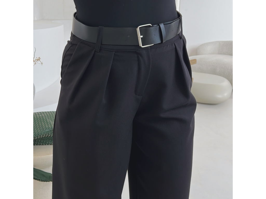 Elegantní a nadčasové široké kalhoty, které spojují styl a pohodlí. Mají klasický střih s vyšším pasem, praktické kapsy a zapínání na knoflík a zip. Součástí je i pásek v černé barvě, který krásně dotvoří celkový look a zvýrazní siluetu. Ideální k business i ležérním outfitům.