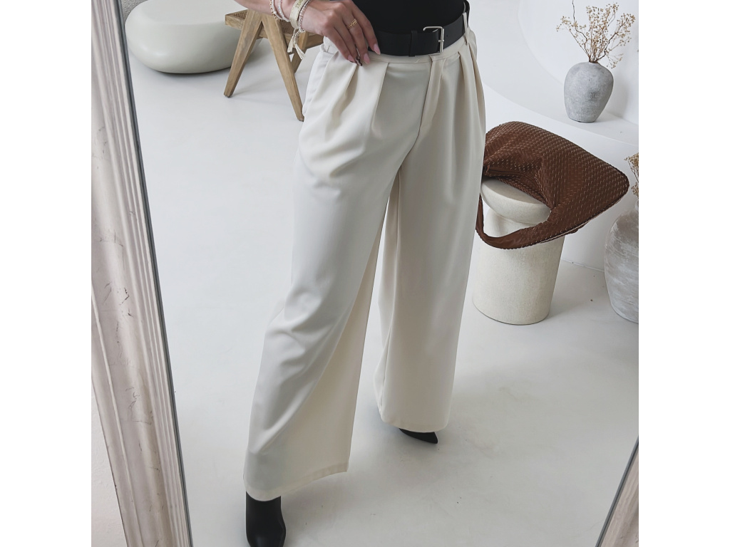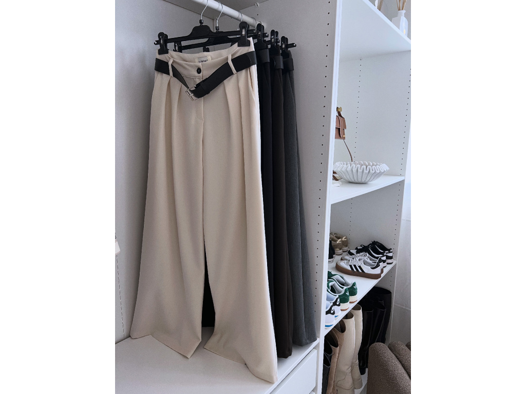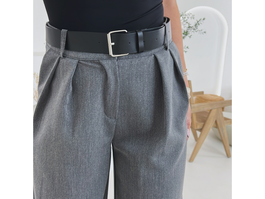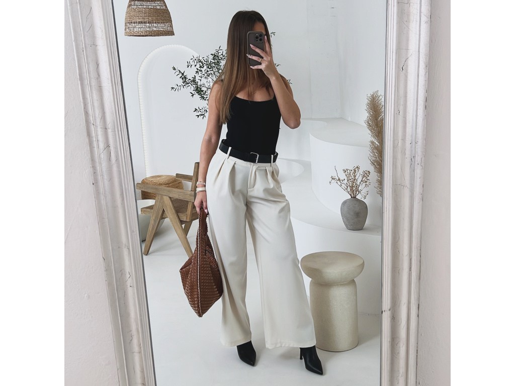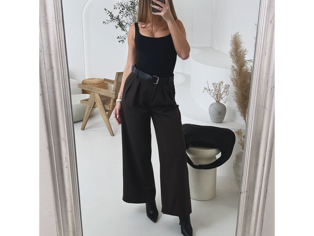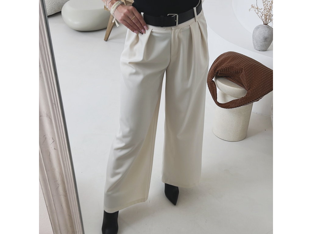 Elegantní a nadčasové široké kalhoty, které spojují styl a pohodlí. Mají klasický střih s vyšším pasem, praktické kapsy a zapínání na knoflík a zip. Součástí je i pásek v černé barvě, který krásně dotvoří celkový look a zvýrazní siluetu. Ideální k business i ležérním outfitům.