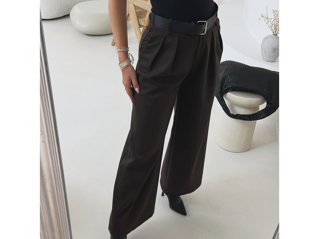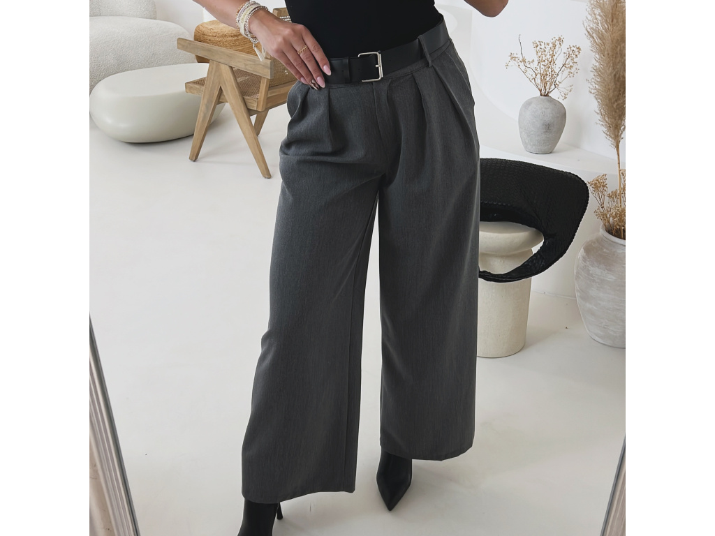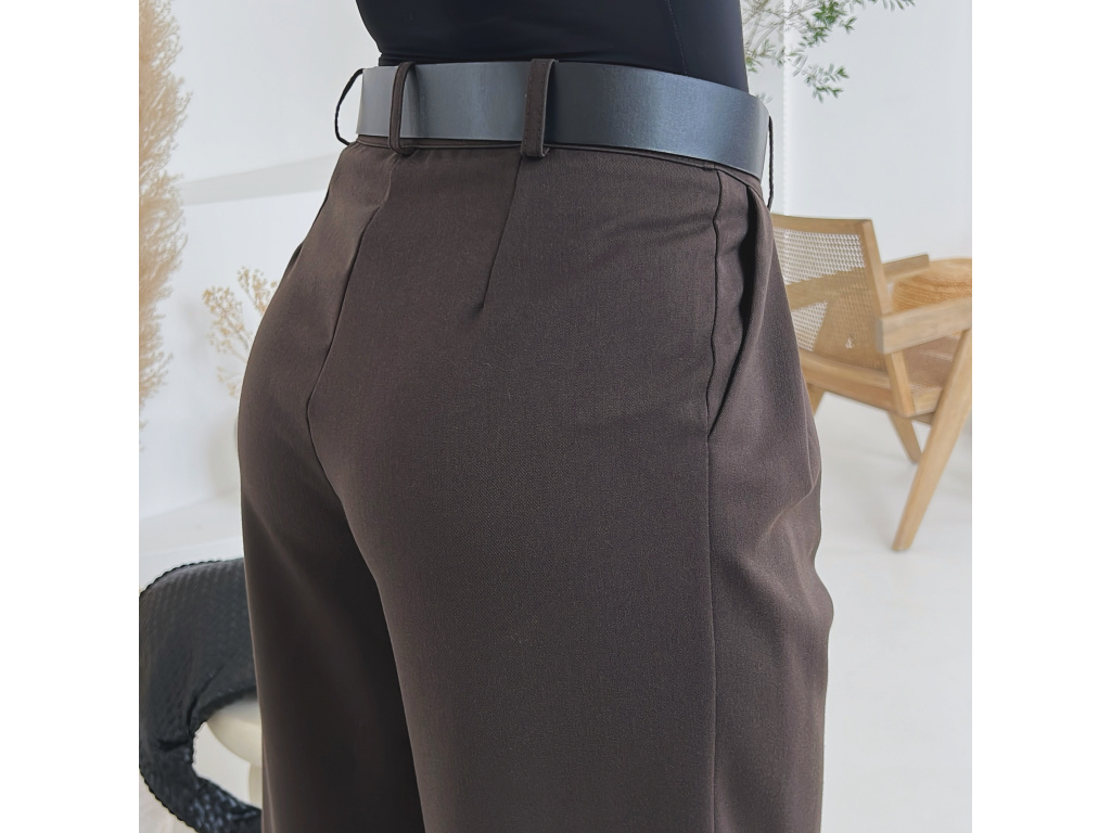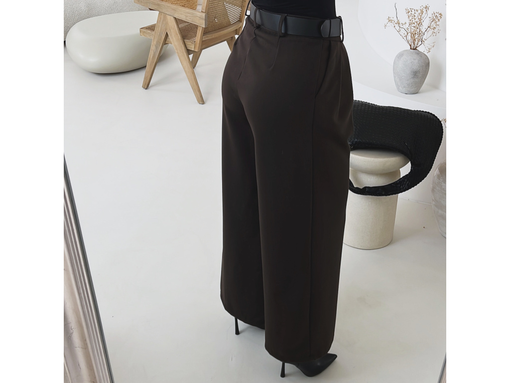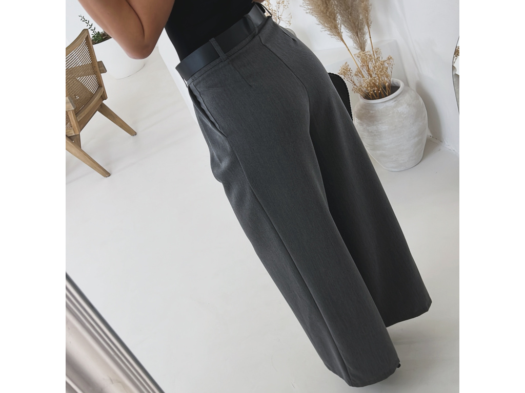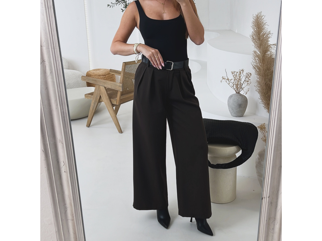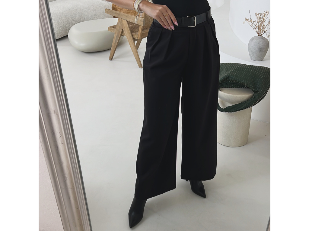 Elegantní a nadčasové široké kalhoty, které spojují styl a pohodlí. Mají klasický střih s vyšším pasem, praktické kapsy a zapínání na knoflík a zip. Součástí je i pásek v černé barvě, který krásně dotvoří celkový look a zvýrazní siluetu. Ideální k business i ležérním outfitům.
