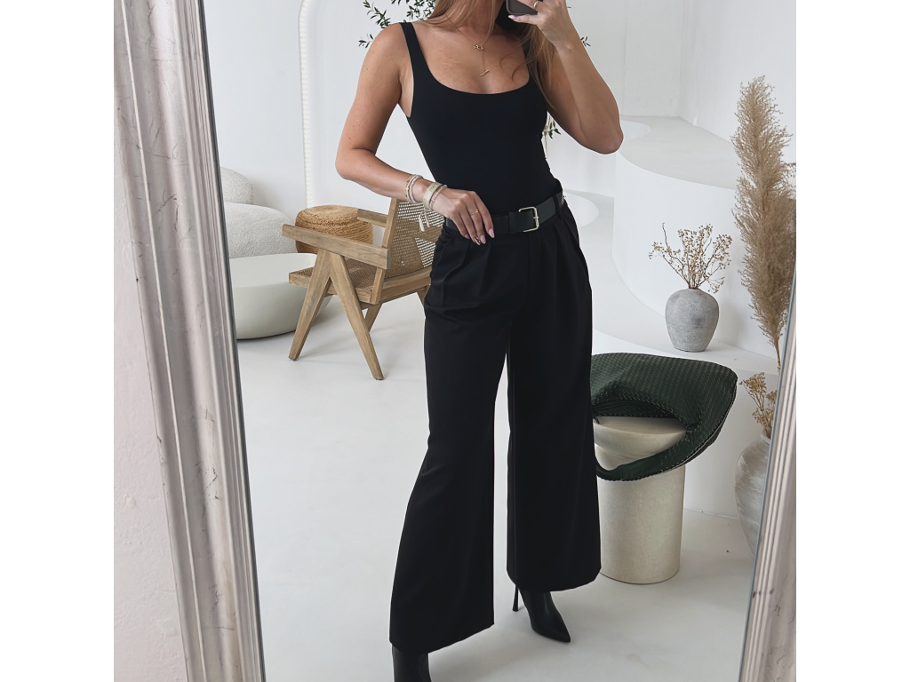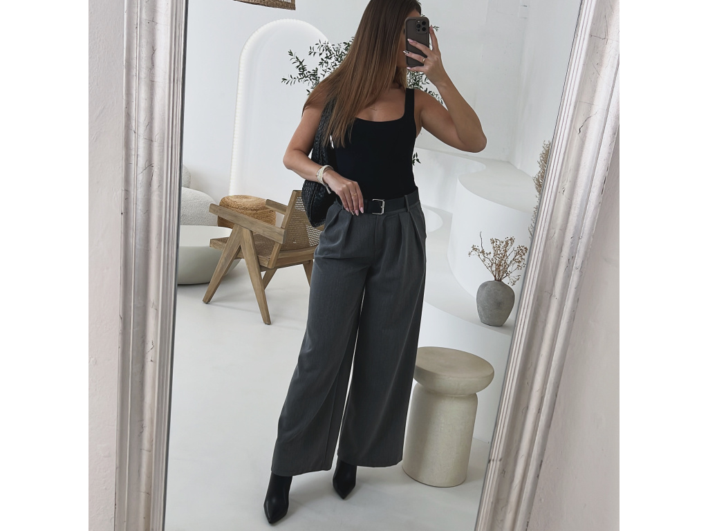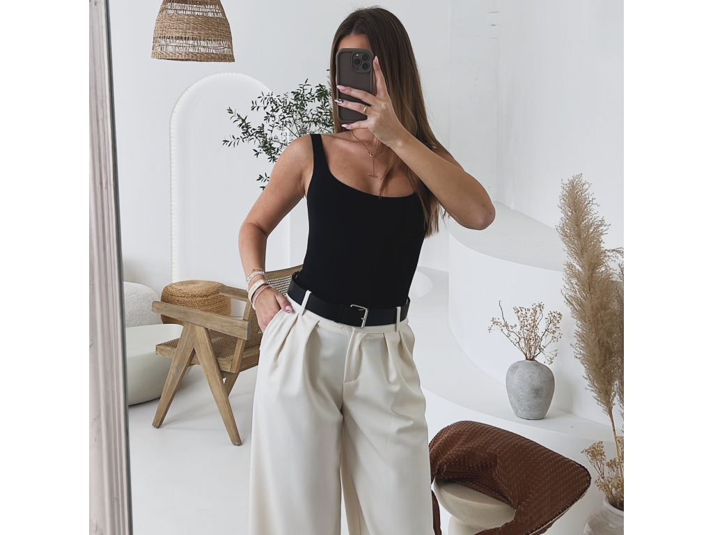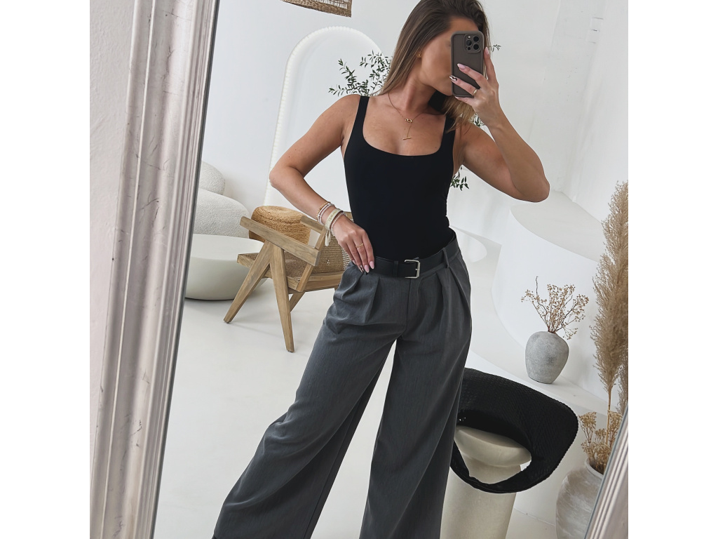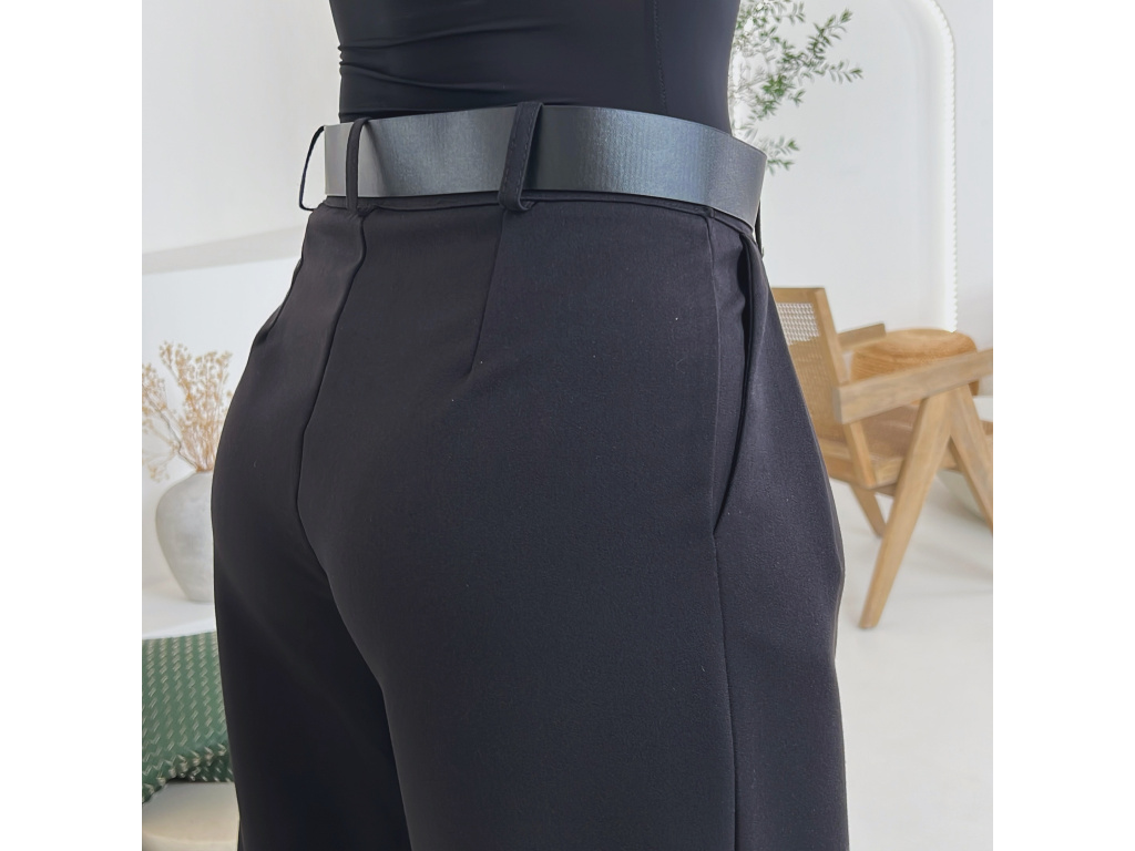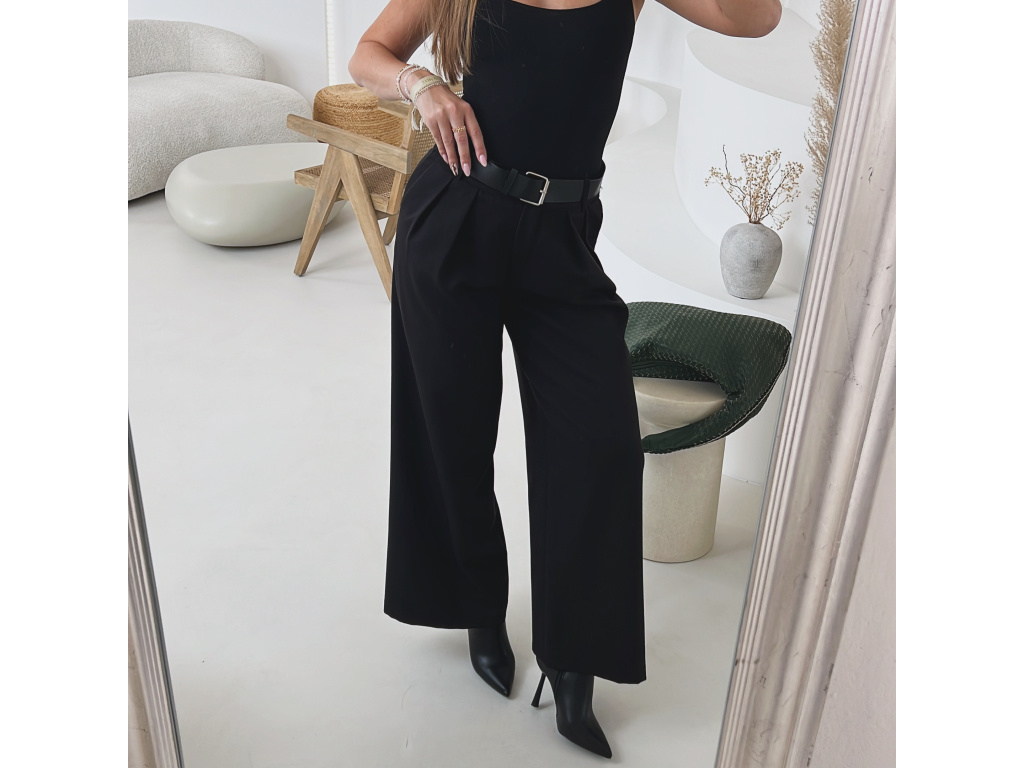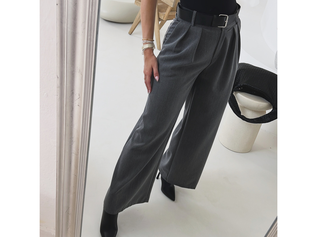 Elegantní a nadčasové široké kalhoty, které spojují styl a pohodlí. Mají klasický střih s vyšším pasem, praktické kapsy a zapínání na knoflík a zip. Součástí je i pásek v černé barvě, který krásně dotvoří celkový look a zvýrazní siluetu. Ideální k business i ležérním outfitům.