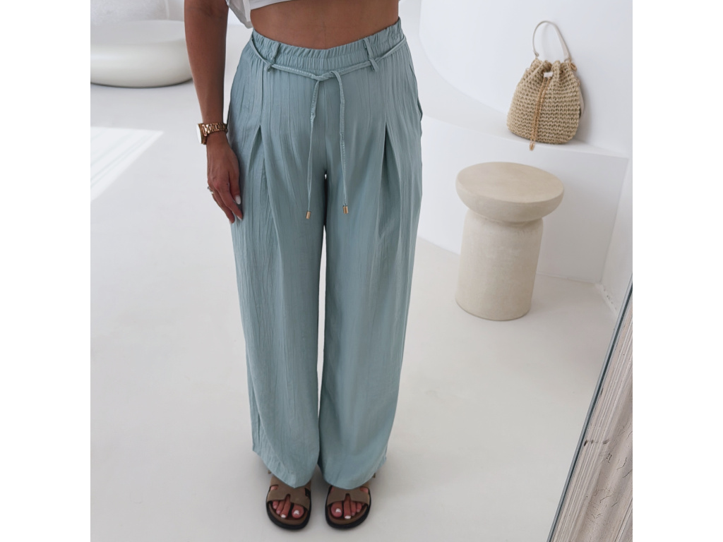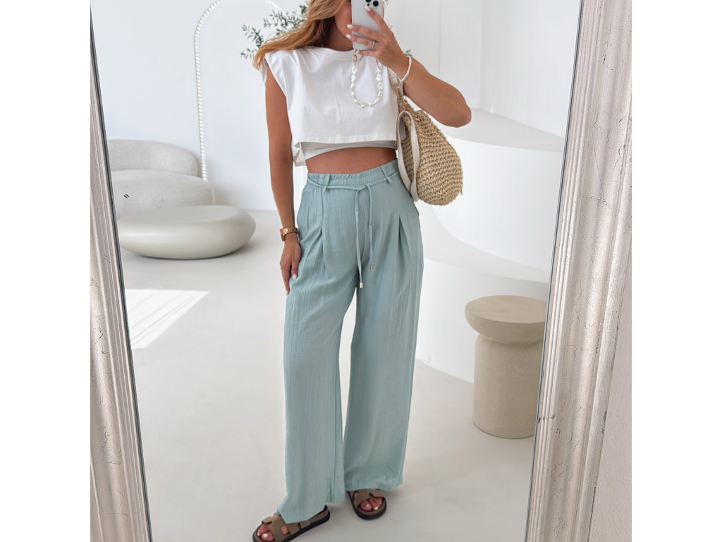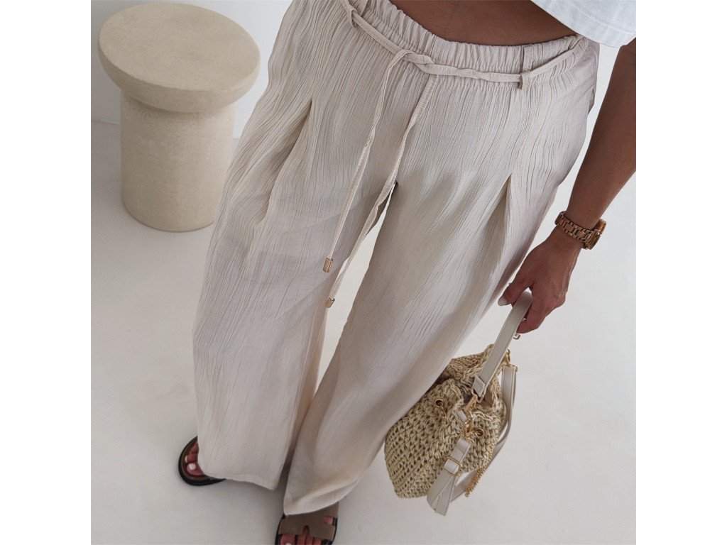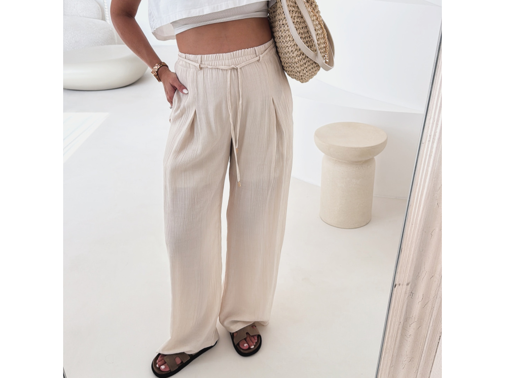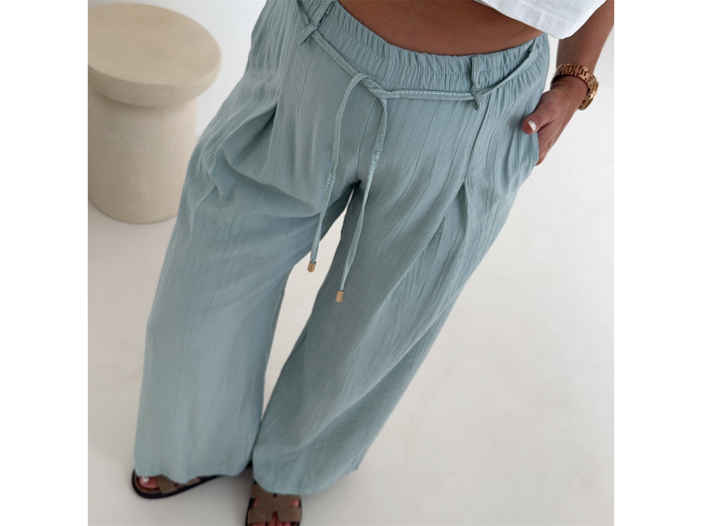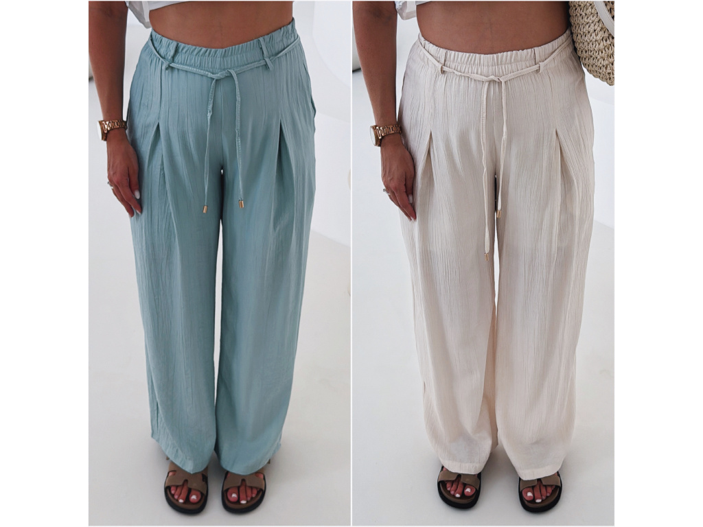 Lehké a pohodlné volné kalhoty v béžové a tyrkysové barvě. Mají elastický pas se stahovací šňůrkou a volnější střih, který zaručí maximální komfort i styl. Skvěle se hodí na letní dny, dovolenou i volný čas. Mají boční kapsy. Velikost je univerzální, sedí na XS, S a M.