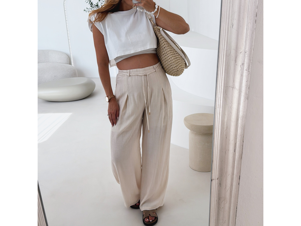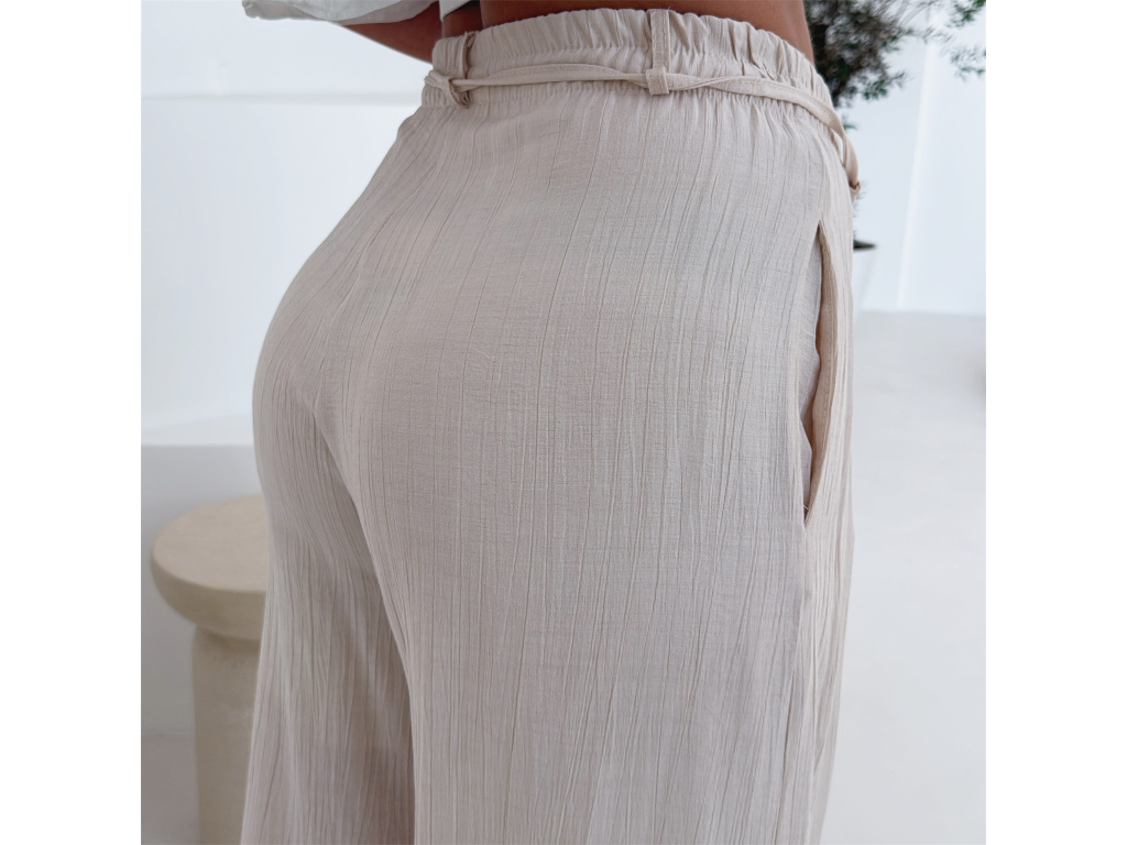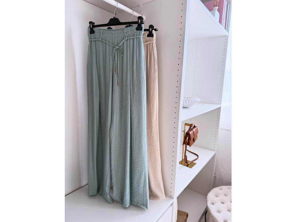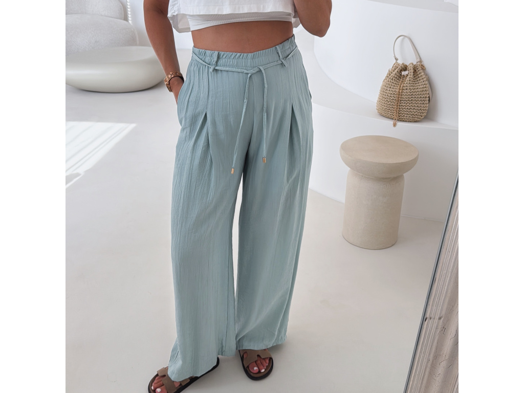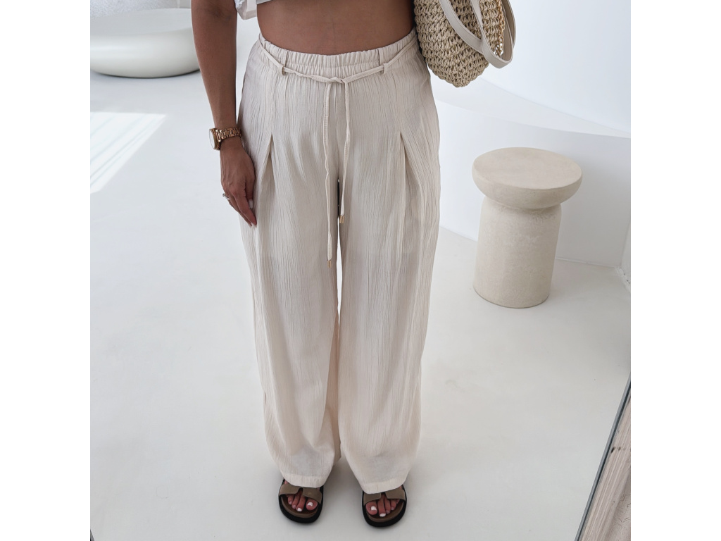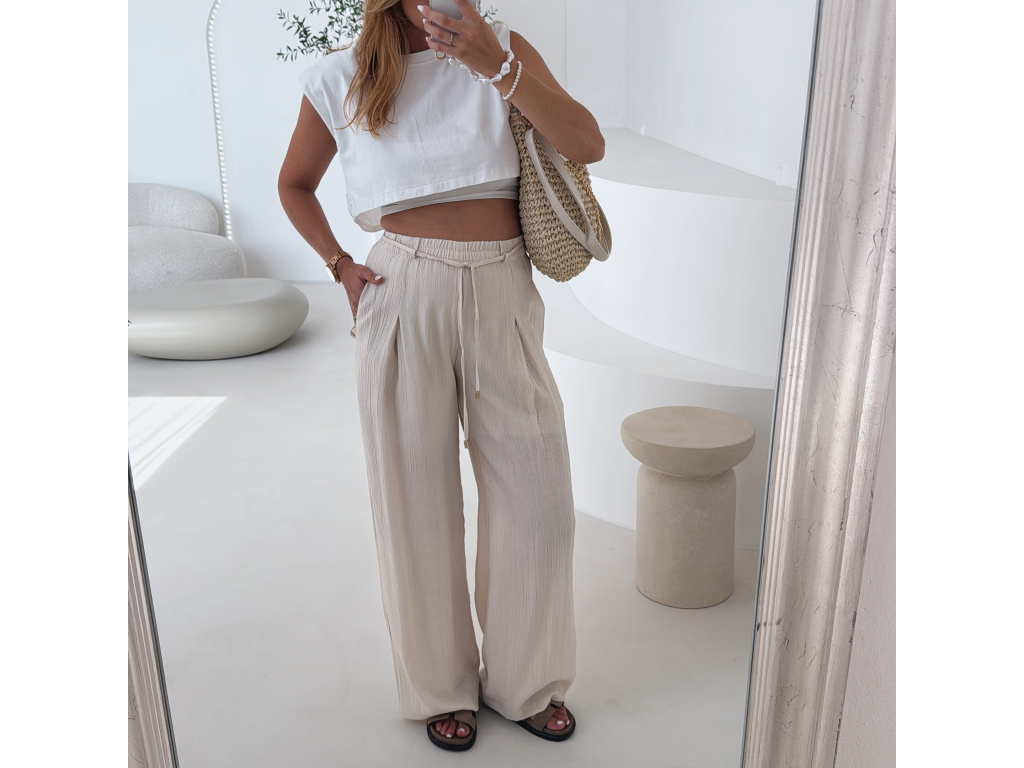 Lehké a pohodlné volné kalhoty v béžové a tyrkysové barvě. Mají elastický pas se stahovací šňůrkou a volnější střih, který zaručí maximální komfort i styl. Skvěle se hodí na letní dny, dovolenou i volný čas. Mají boční kapsy. Velikost je univerzální, sedí na XS, S a M.