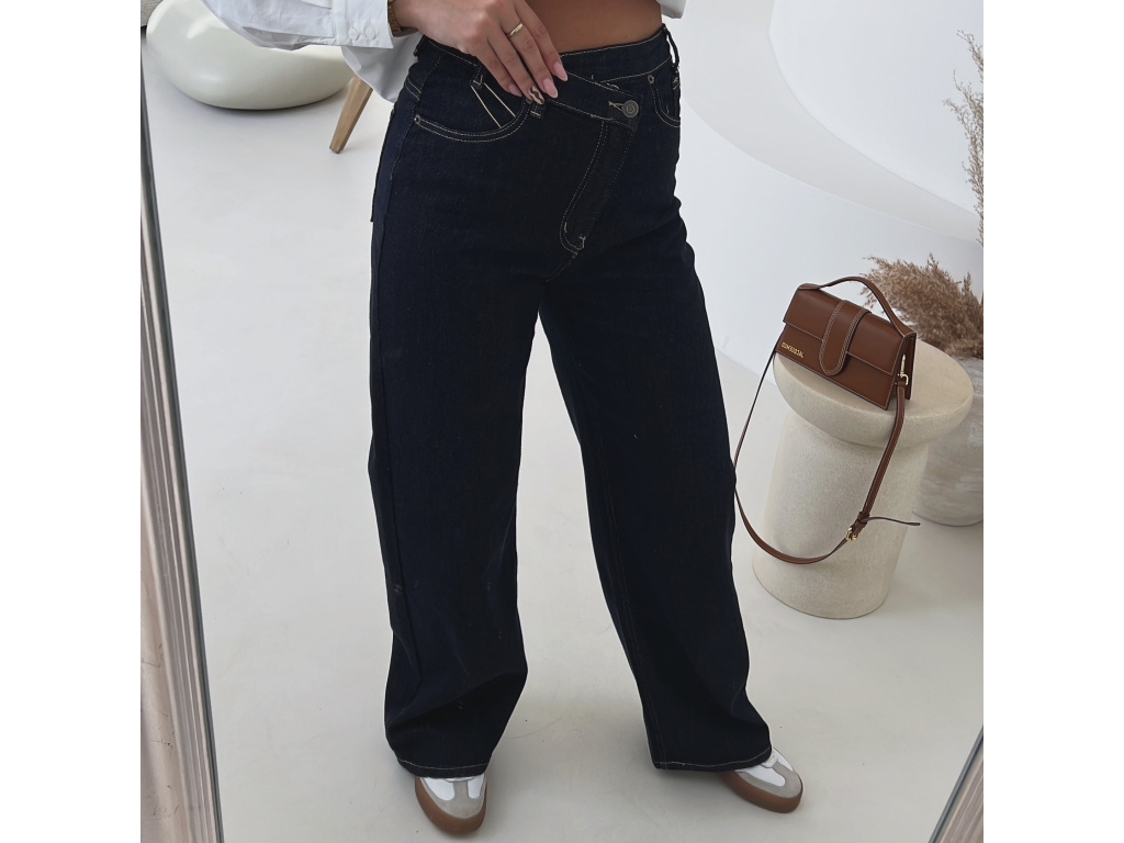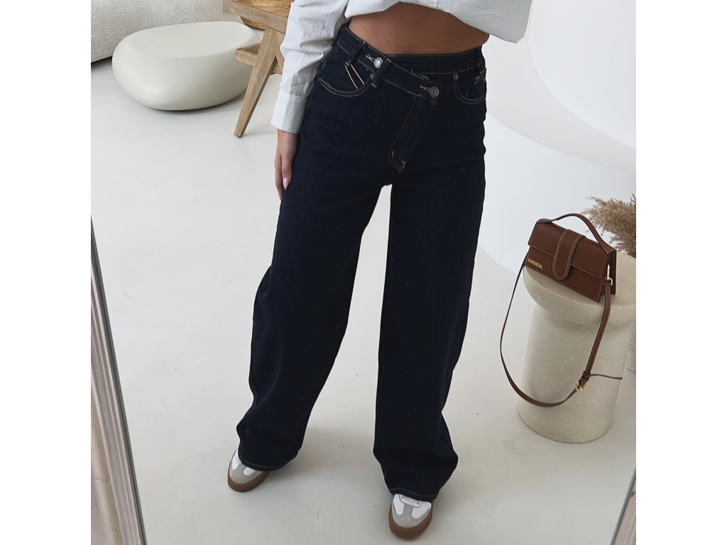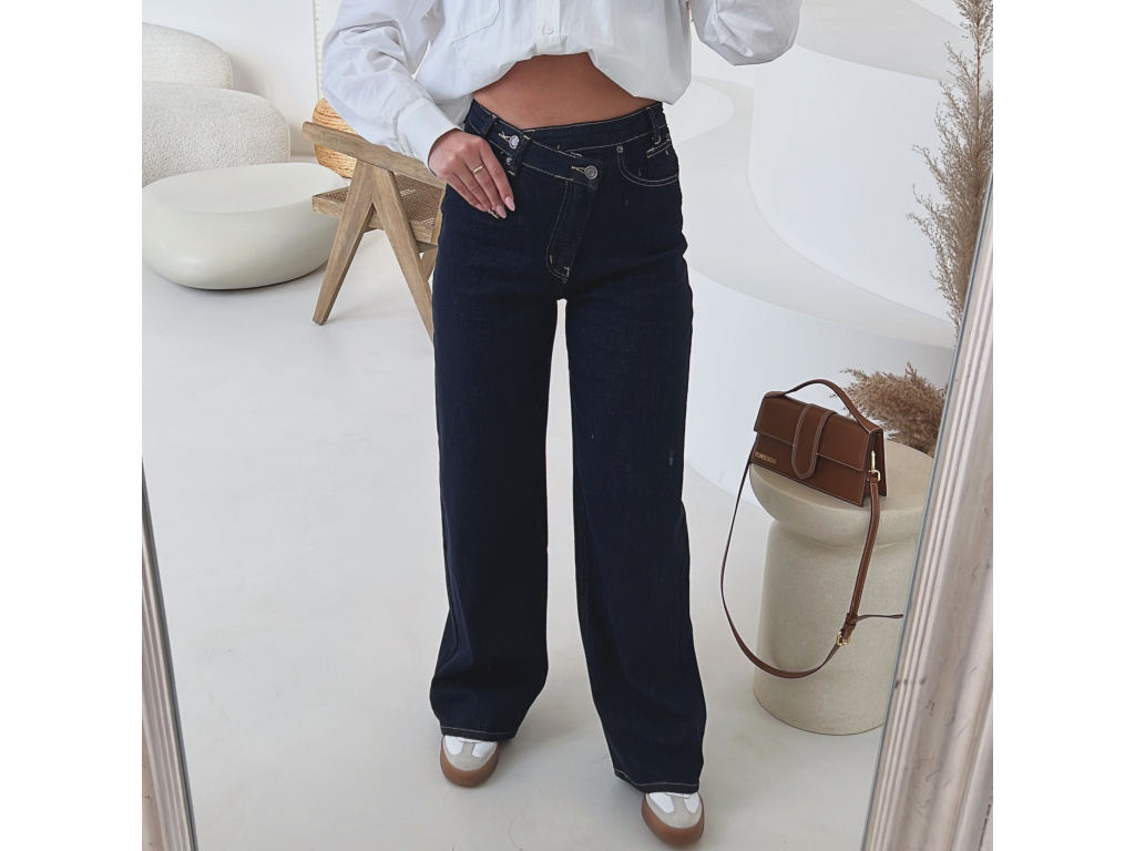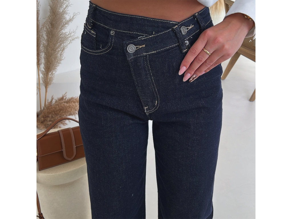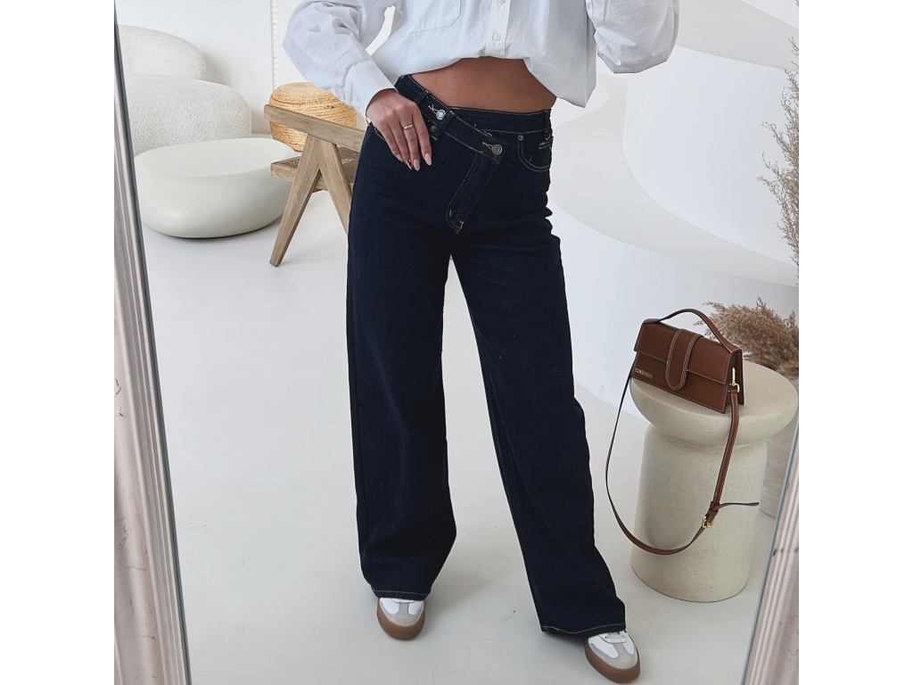 Stylové tmavě modré džíny s originálním asymetrickým zapínáním a rovně-širokým střihem, který lichotí každé postavě. Vyrobeny z jemného, elastického denimu pro pohodlí při nošení. Skvěle se hodí k basic topům, košilím i saku pro chic městský look.