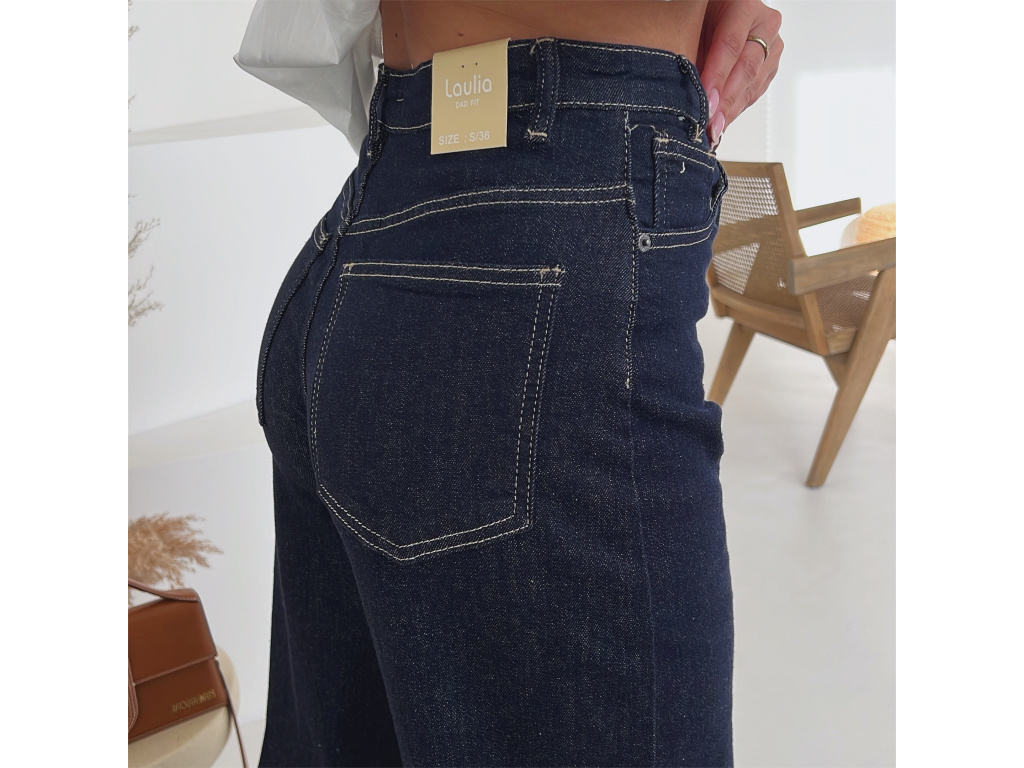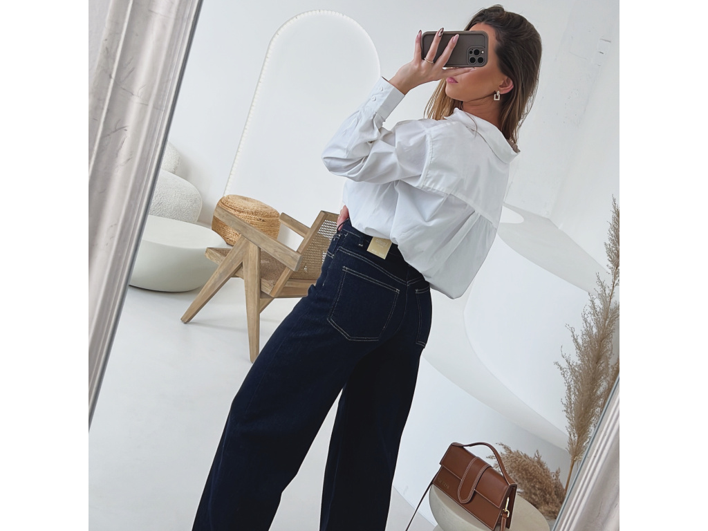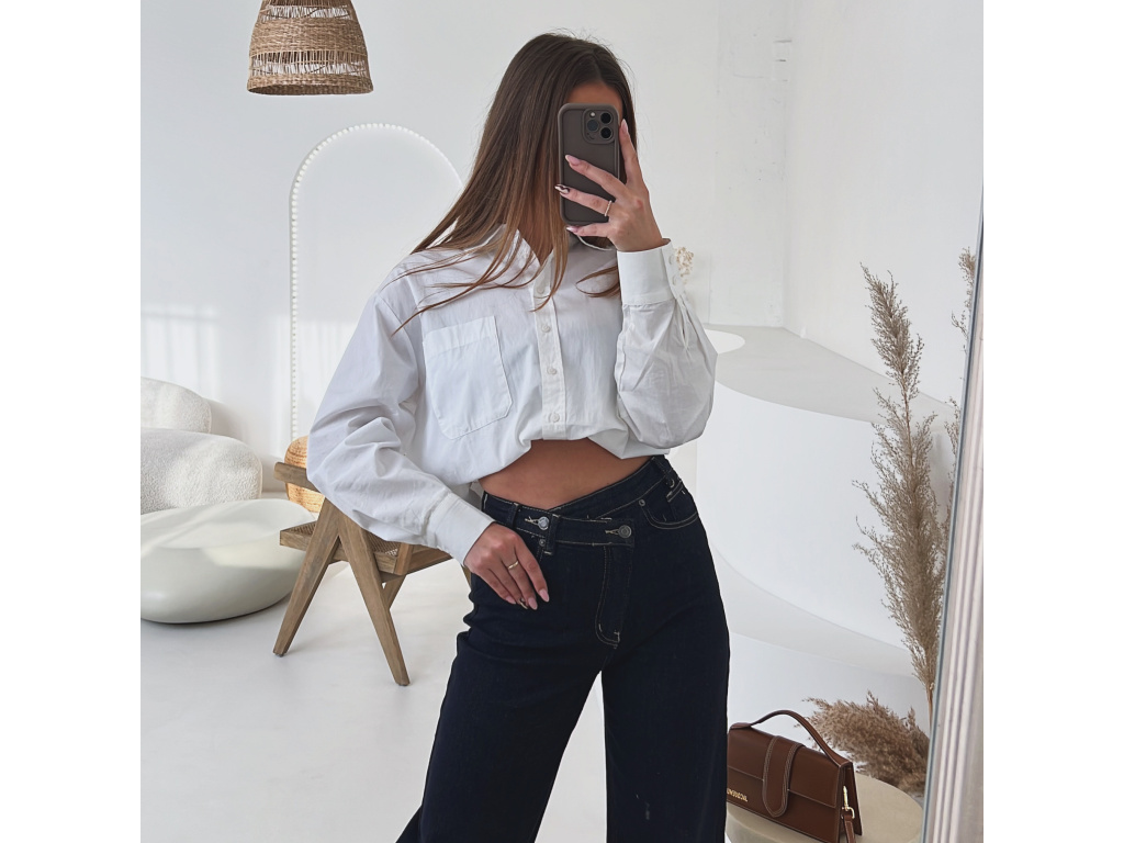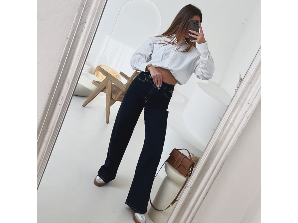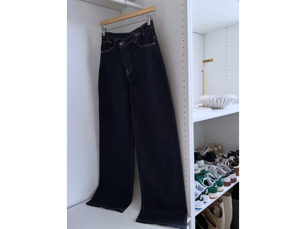 Stylové tmavě modré džíny s originálním asymetrickým zapínáním a rovně-širokým střihem, který lichotí každé postavě. Vyrobeny z jemného, elastického denimu pro pohodlí při nošení. Skvěle se hodí k basic topům, košilím i saku pro chic městský look.