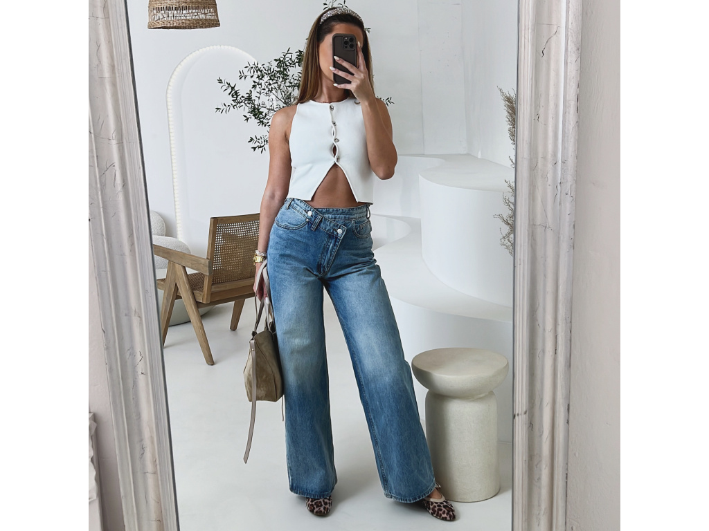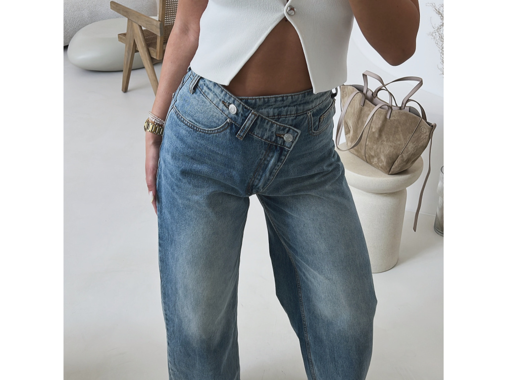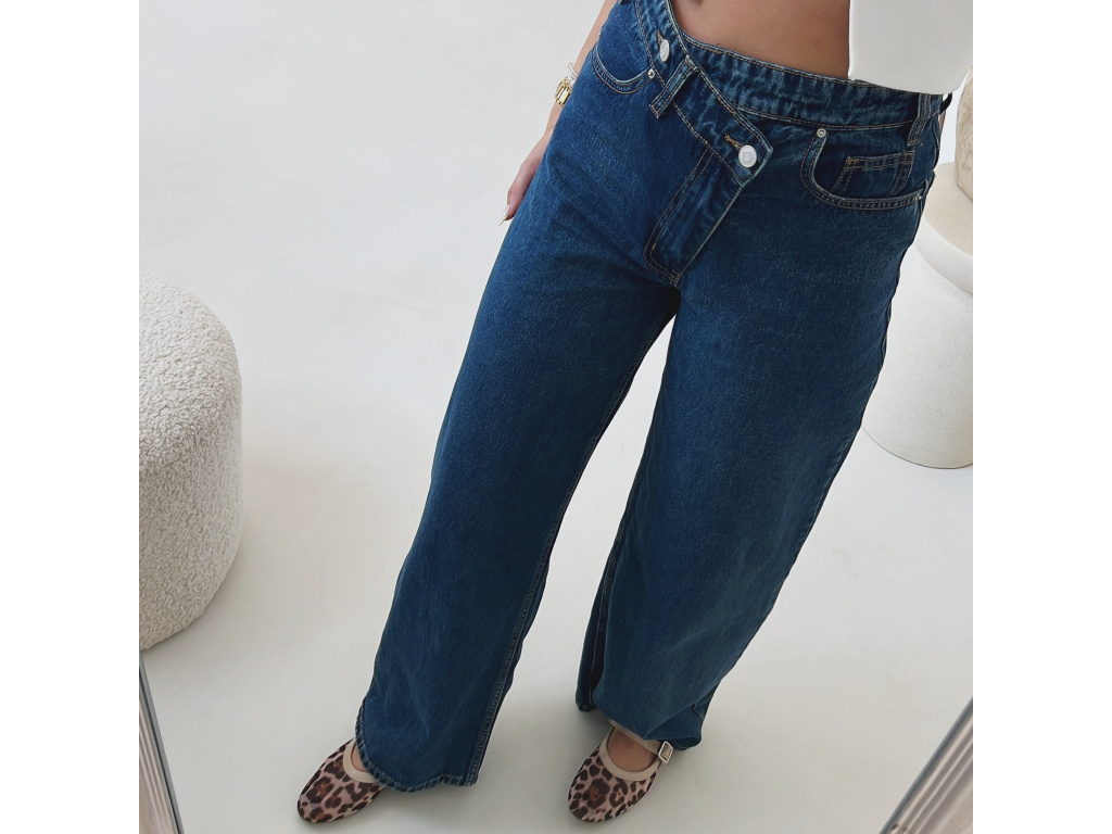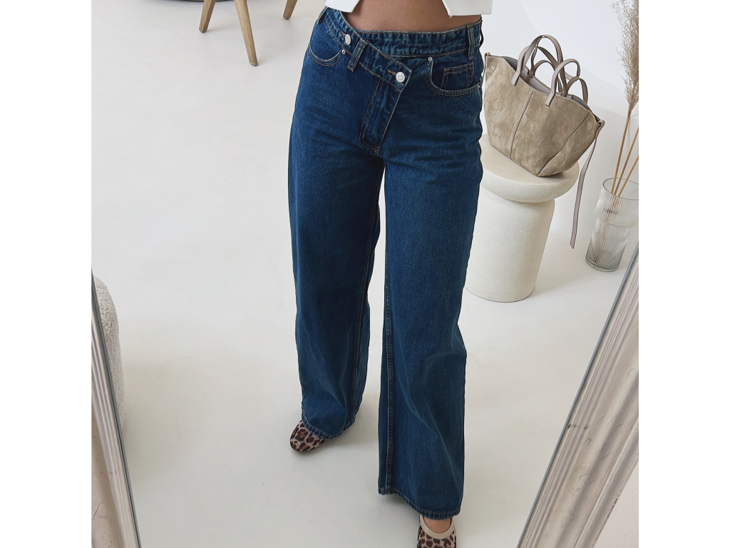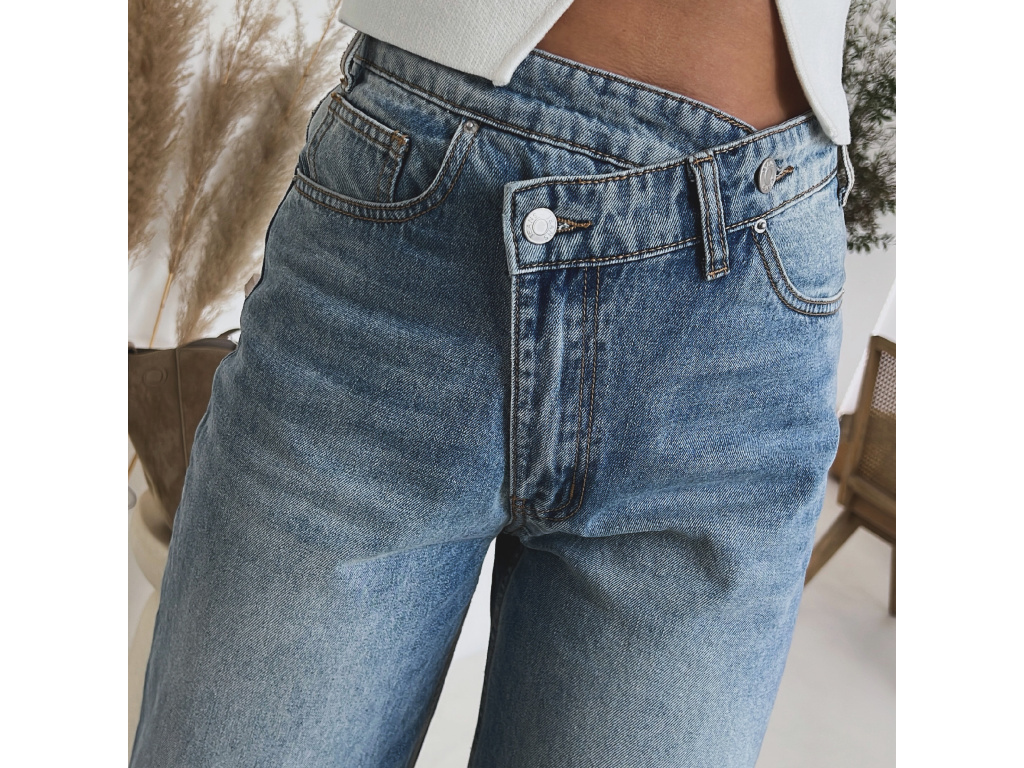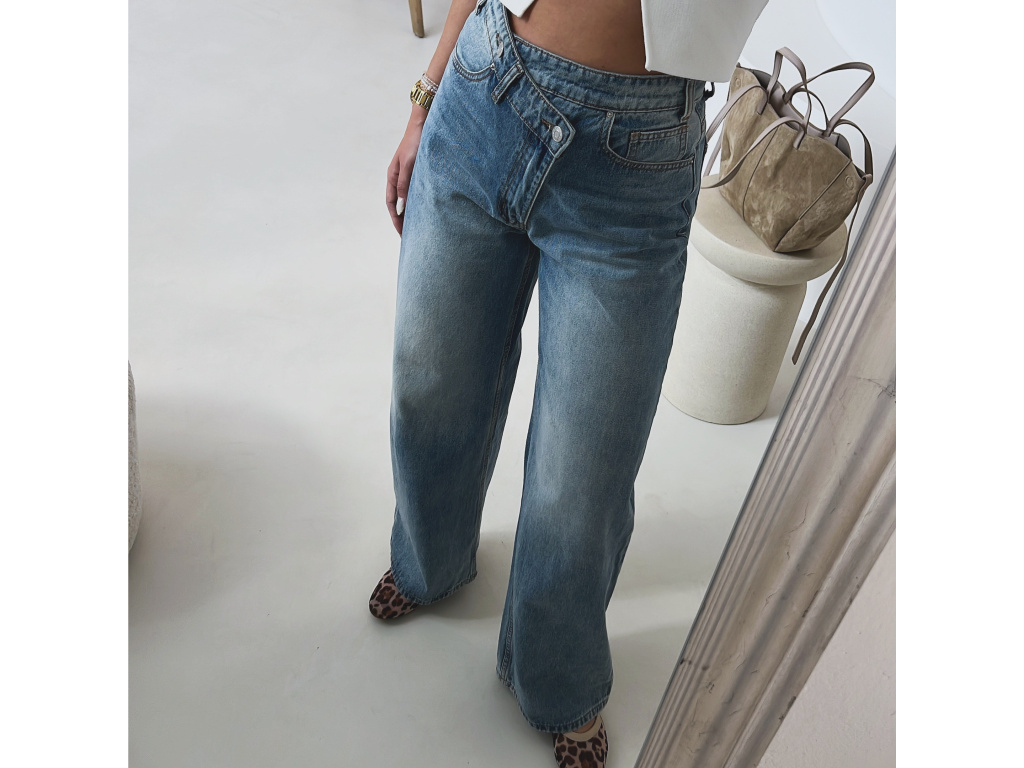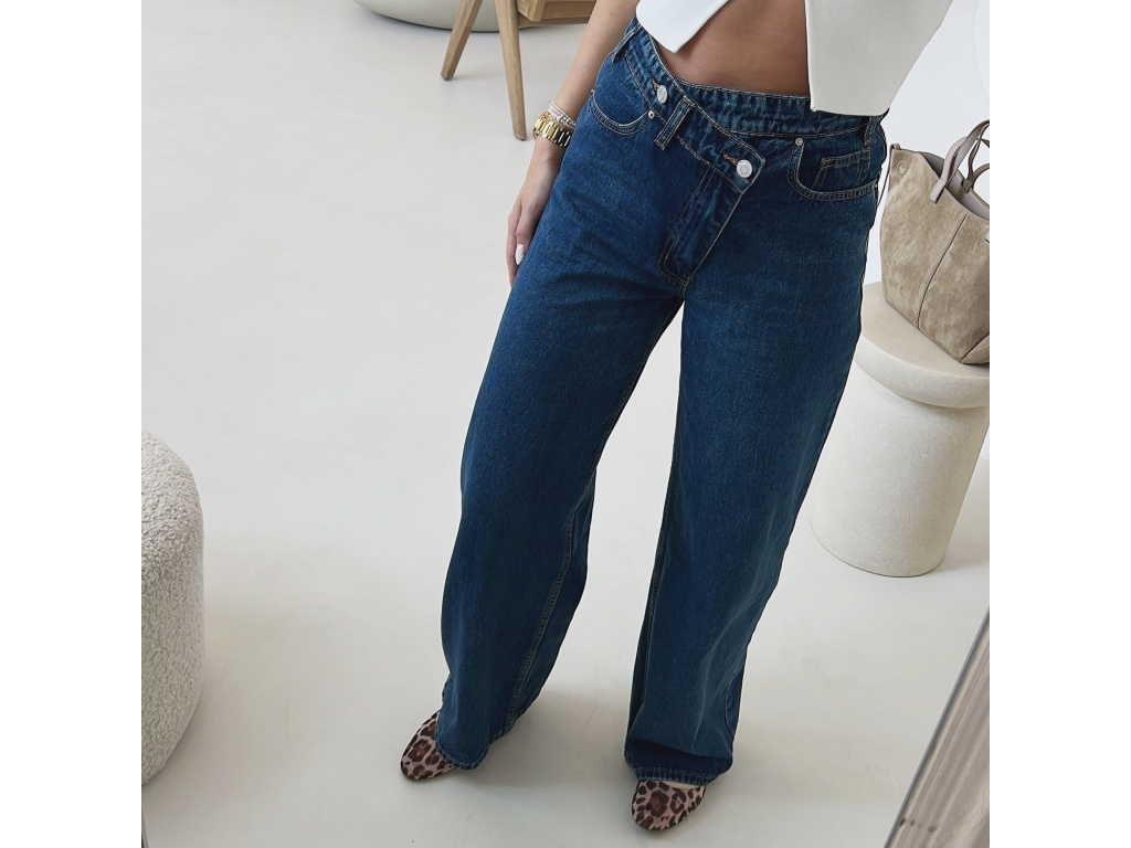 Stylové wide leg džíny s originálním překříženým zapínáním v pase, které dodává klasickému střihu moderní nádech. Kalhoty mají volnější rozšířený střih, klasické kapsy a poutka na pásek. Jsou dostupné ve dvou barevných variantách – světle a tmavě modré, takže je snadno sladíte s různými kousky ve vašem šatníku. Perfektní pro ležérní i elegantnější outfity. Džíny nejsou elastické.