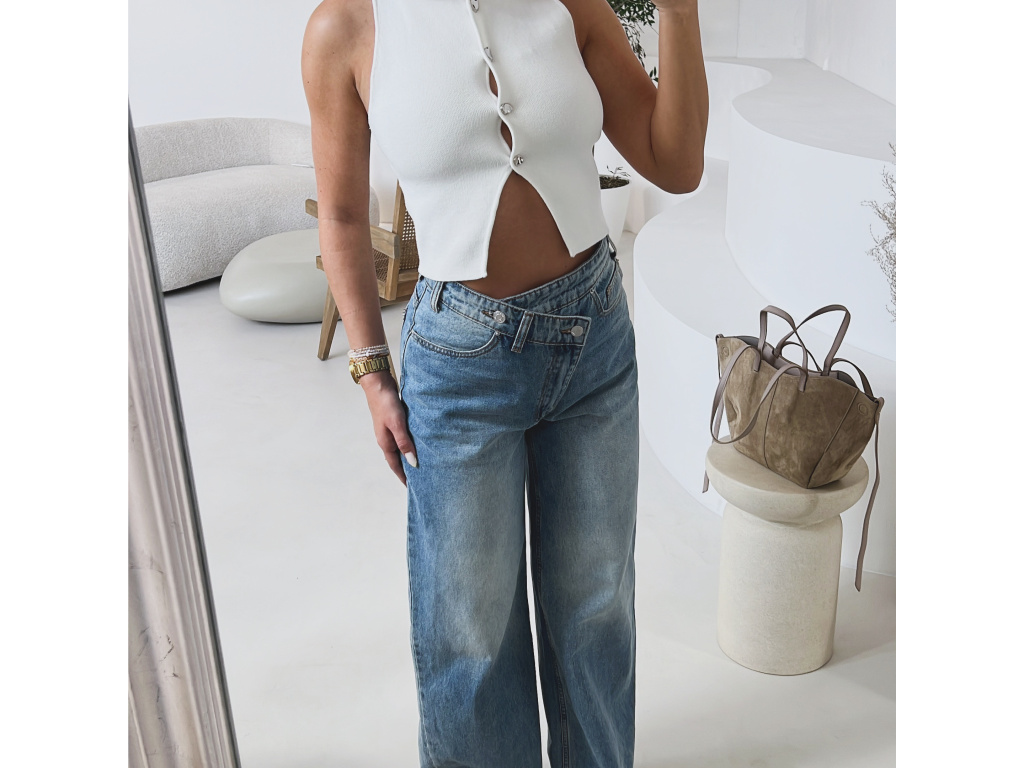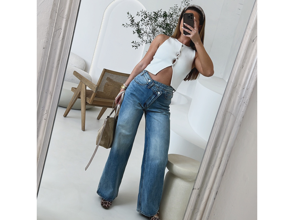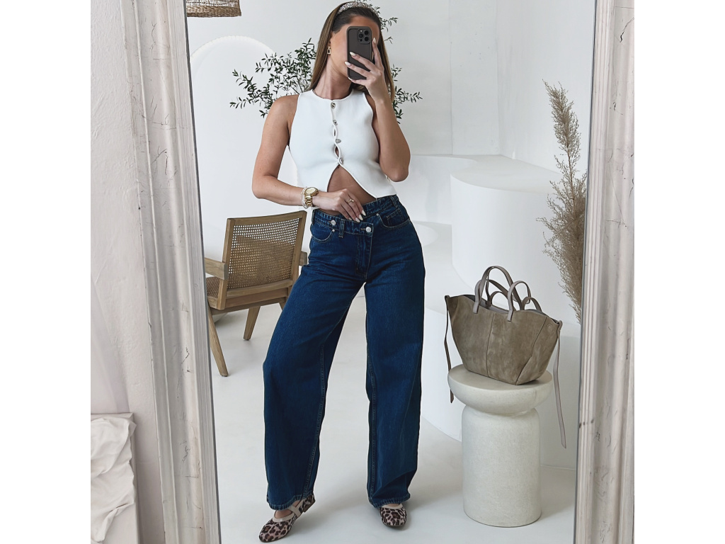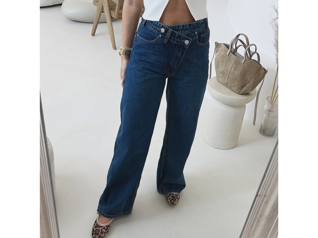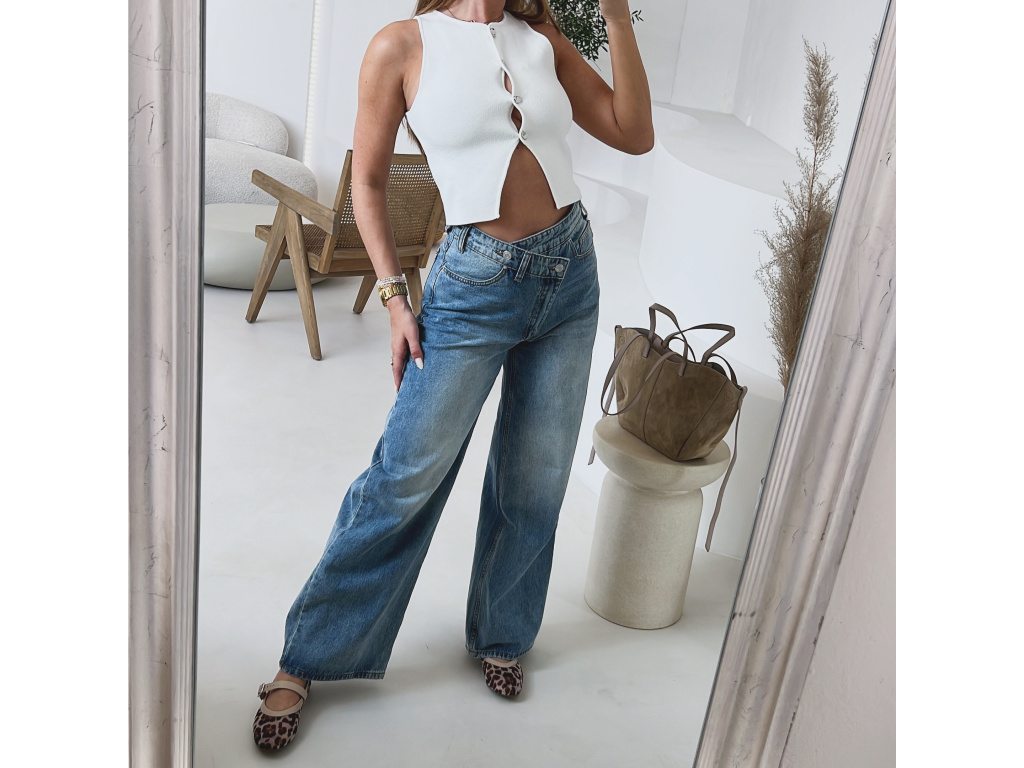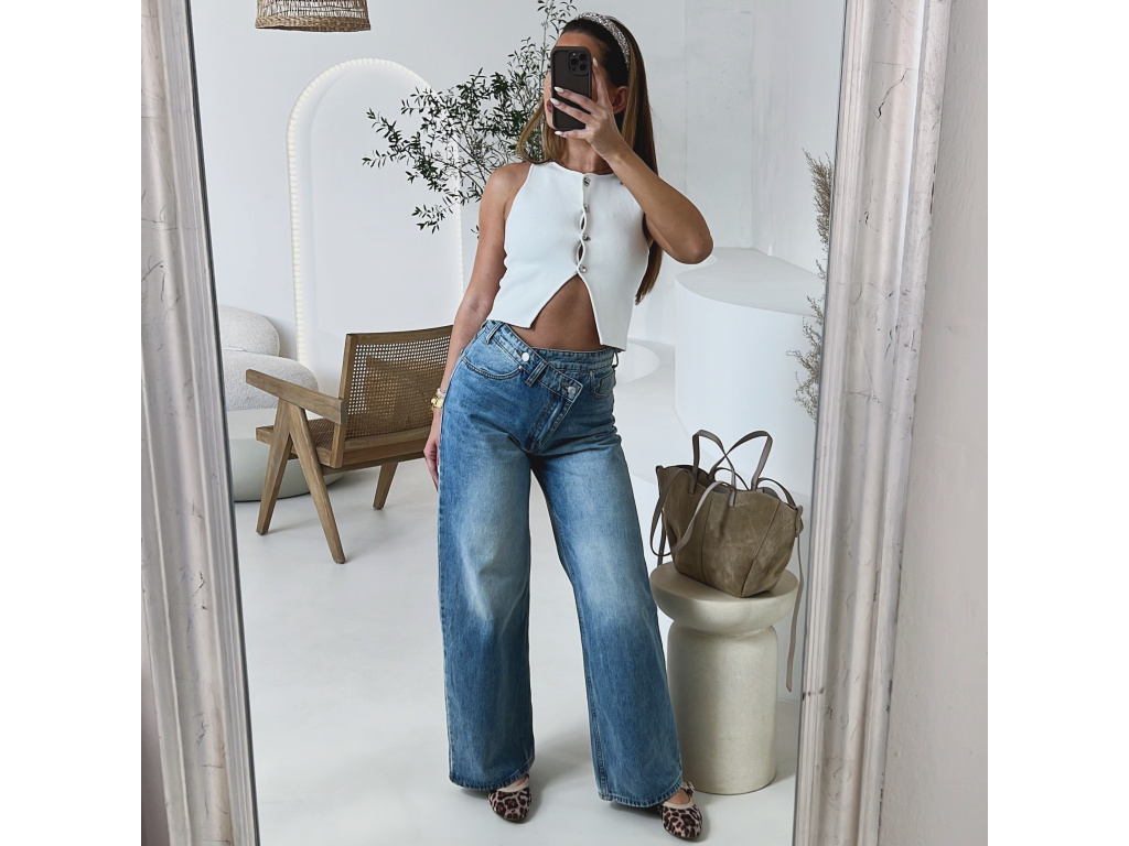Stylové wide leg džíny s originálním překříženým zapínáním v pase, které dodává klasickému střihu moderní nádech. Kalhoty mají volnější rozšířený střih, klasické kapsy a poutka na pásek. Jsou dostupné ve dvou barevných variantách – světle a tmavě modré, takže je snadno sladíte s různými kousky ve vašem šatníku. Perfektní pro ležérní i elegantnější outfity. Džíny nejsou elastické.