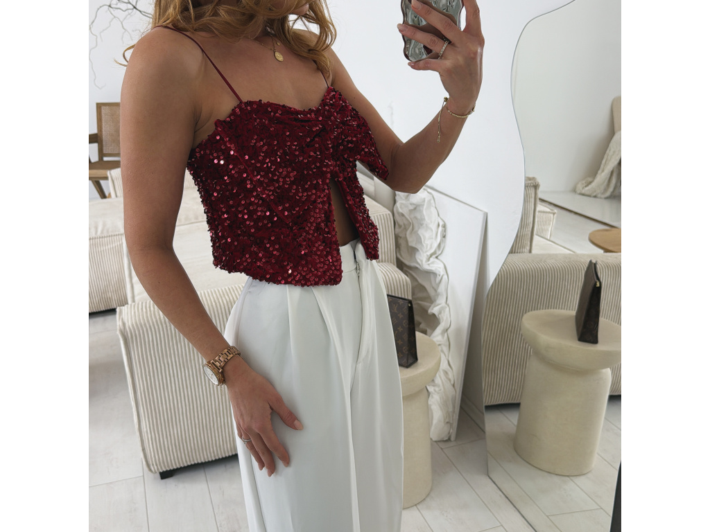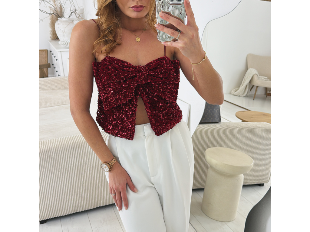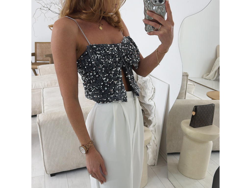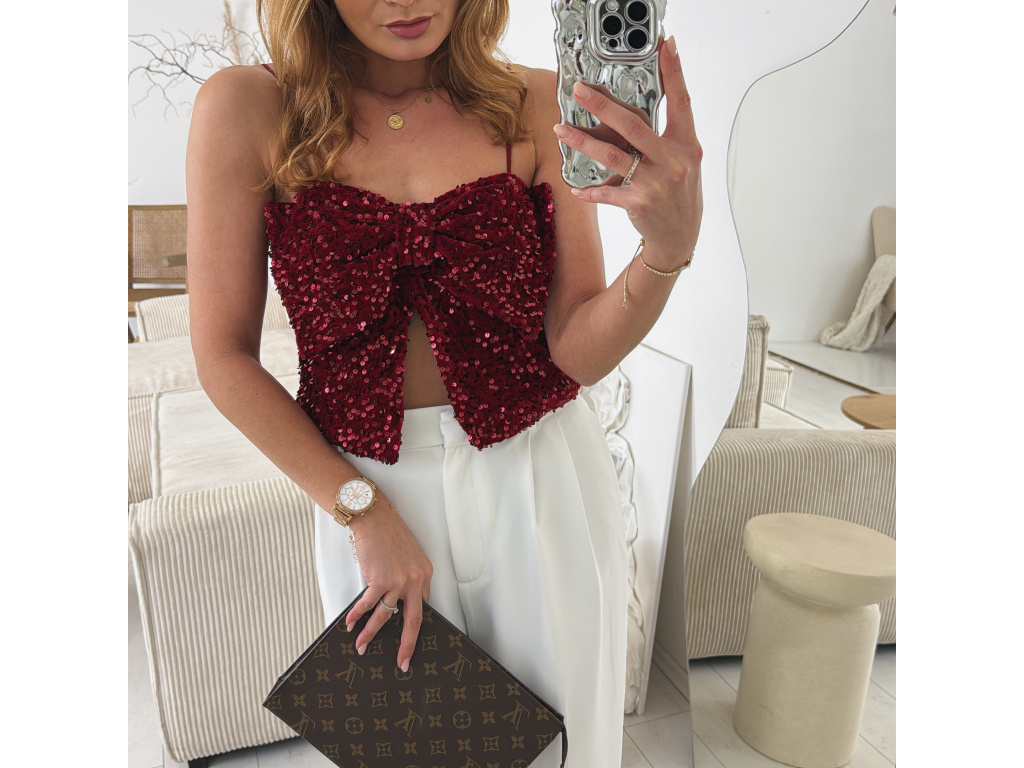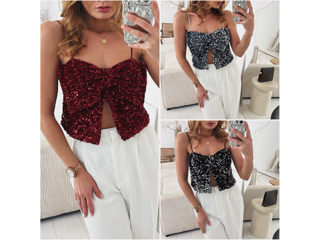 Zajímavý crop top ve tvaru mašle v šedé, červené a stříbrno-černé barvě se sametovým podkladem s flitry. Špagetové ramínka jsou z elastického materiálu. Top je z rubní strany z podšívky a je z elastického materiálu.