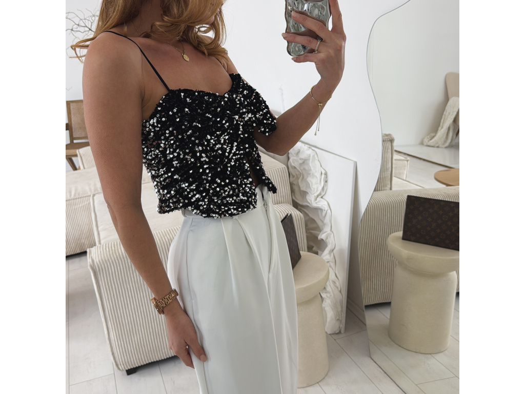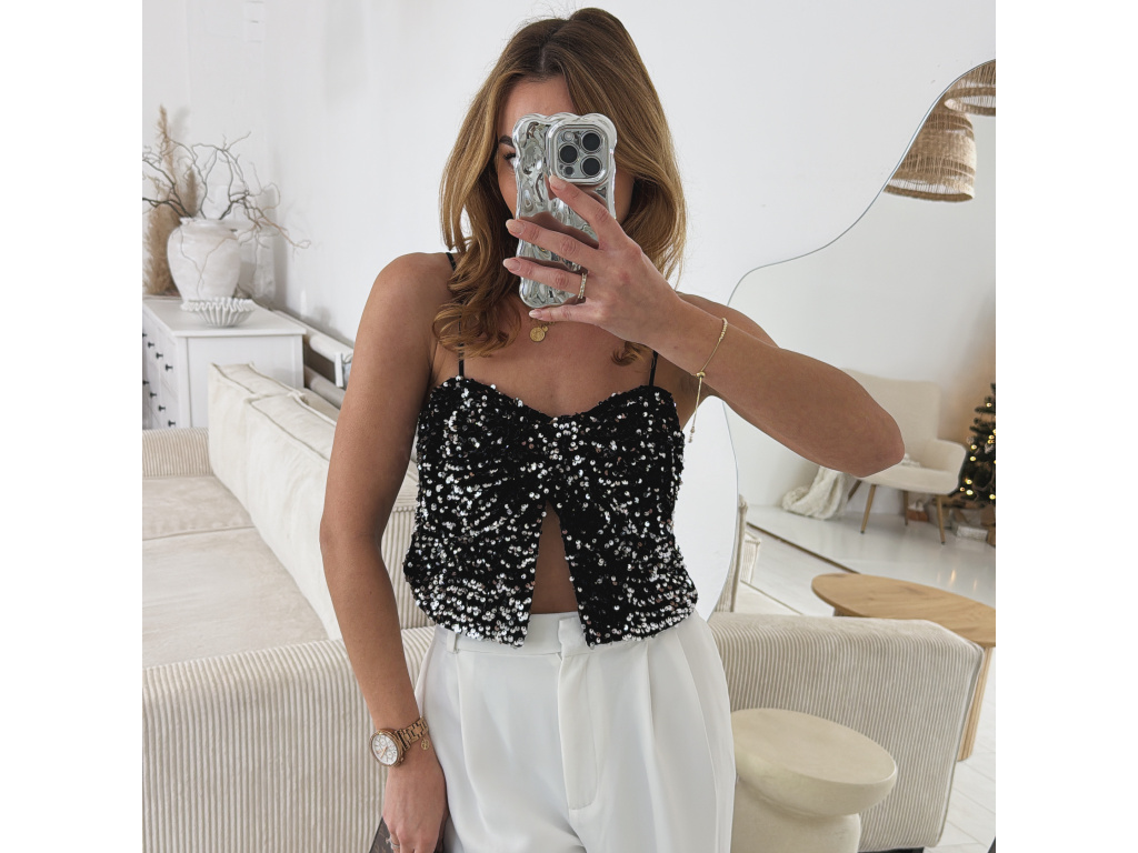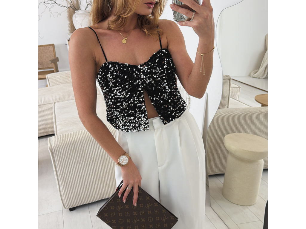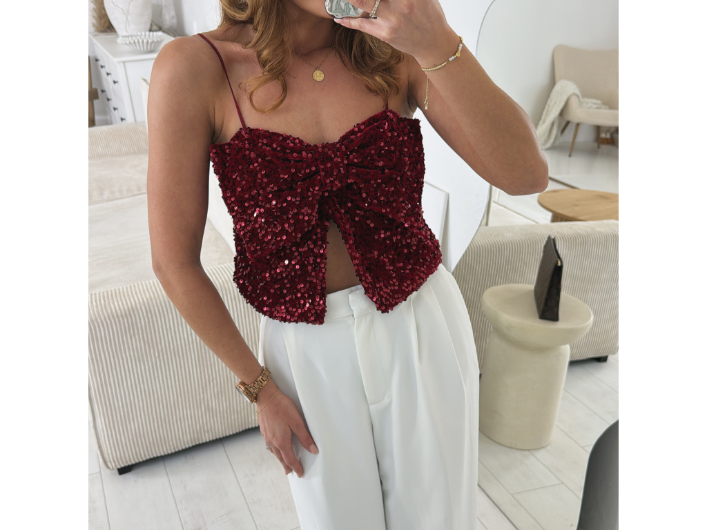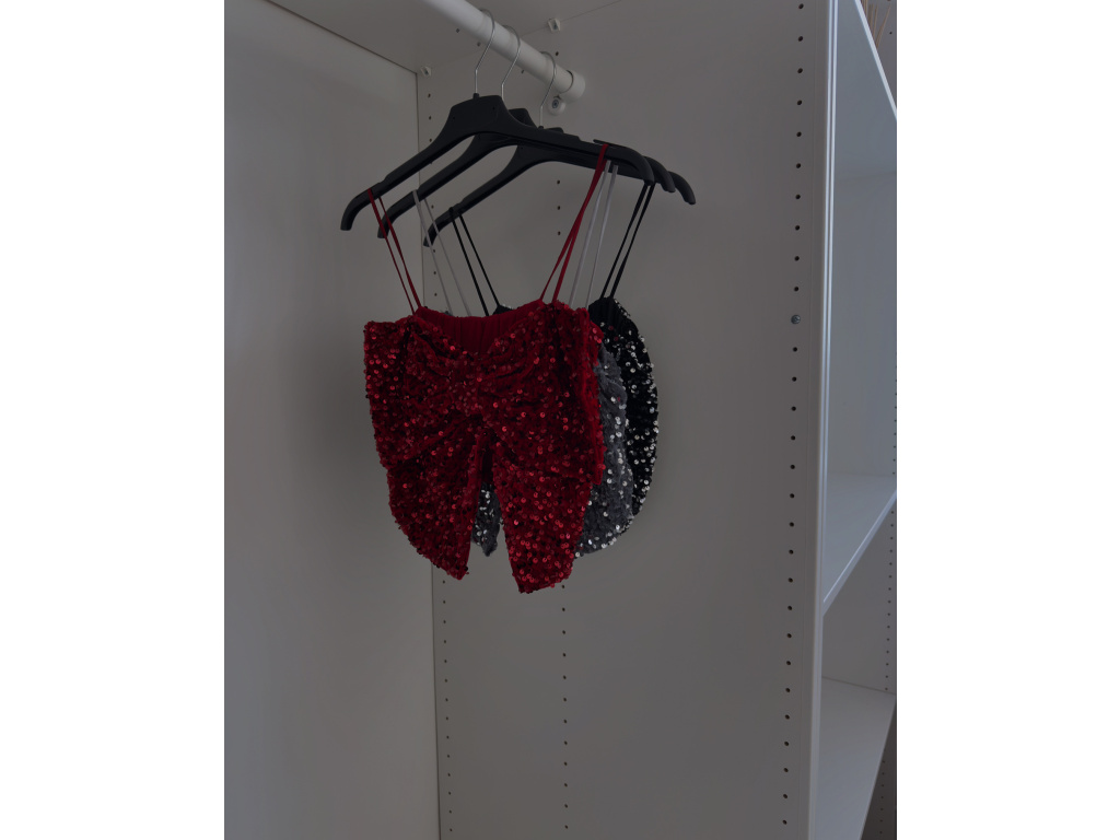 Zajímavý crop top ve tvaru mašle v šedé, červené a stříbrno-černé barvě se sametovým podkladem s flitry. Špagetové ramínka jsou z elastického materiálu. Top je z rubní strany z podšívky a je z elastického materiálu.