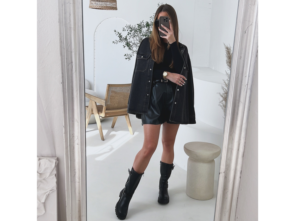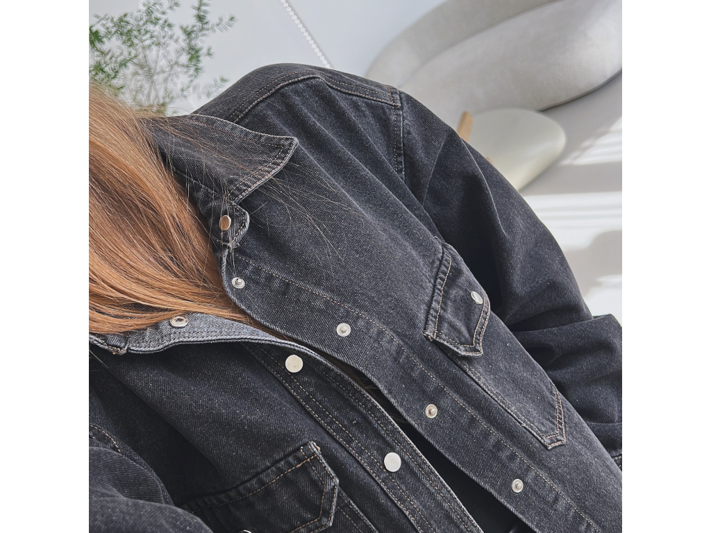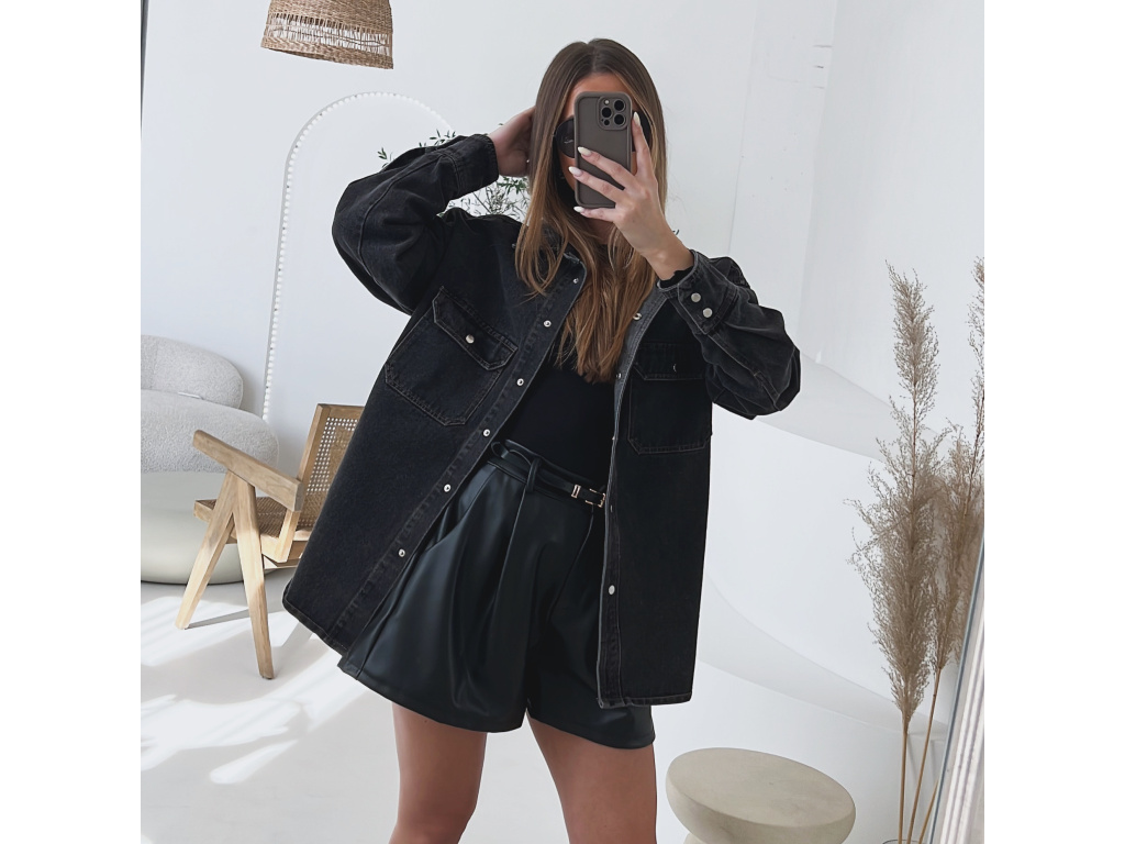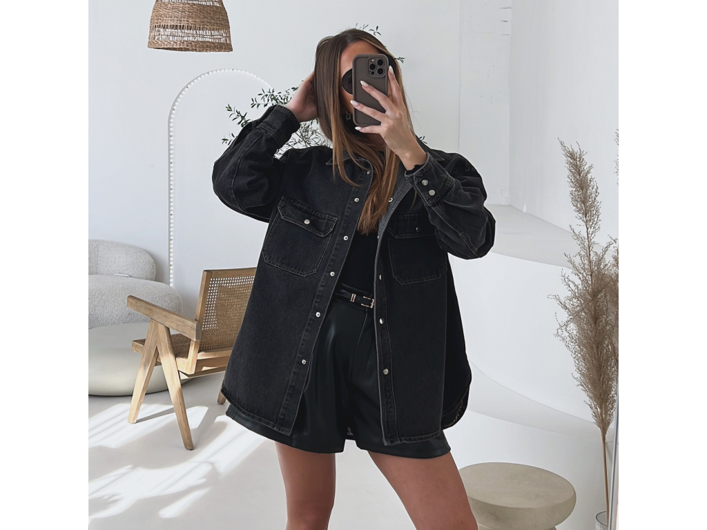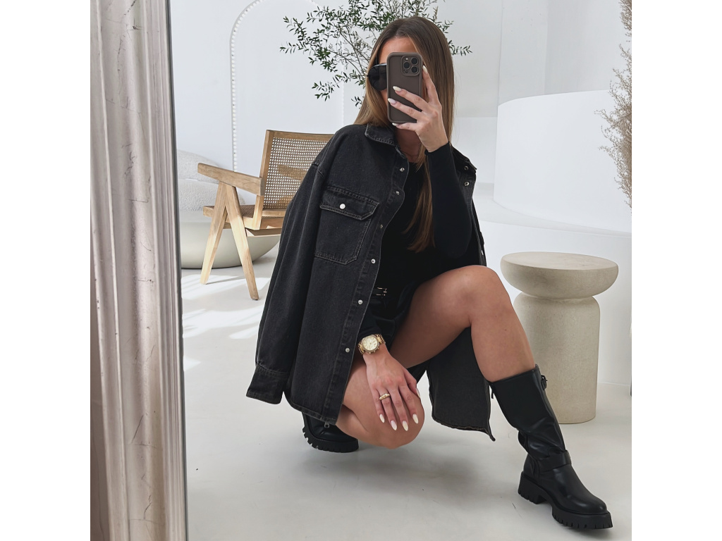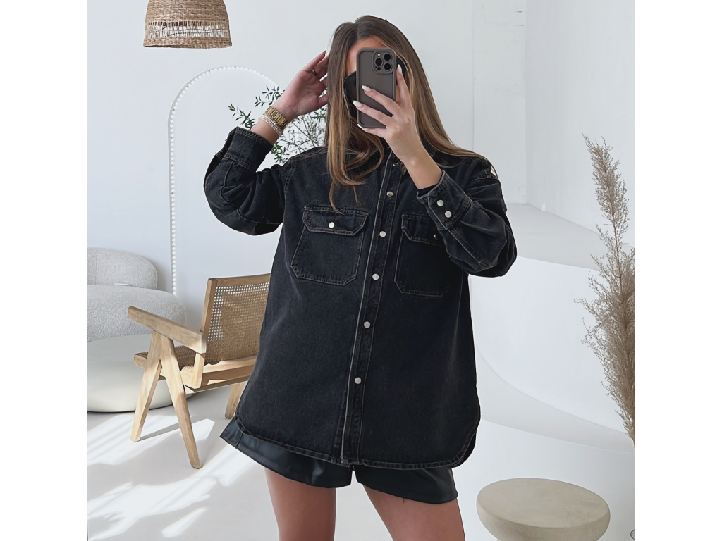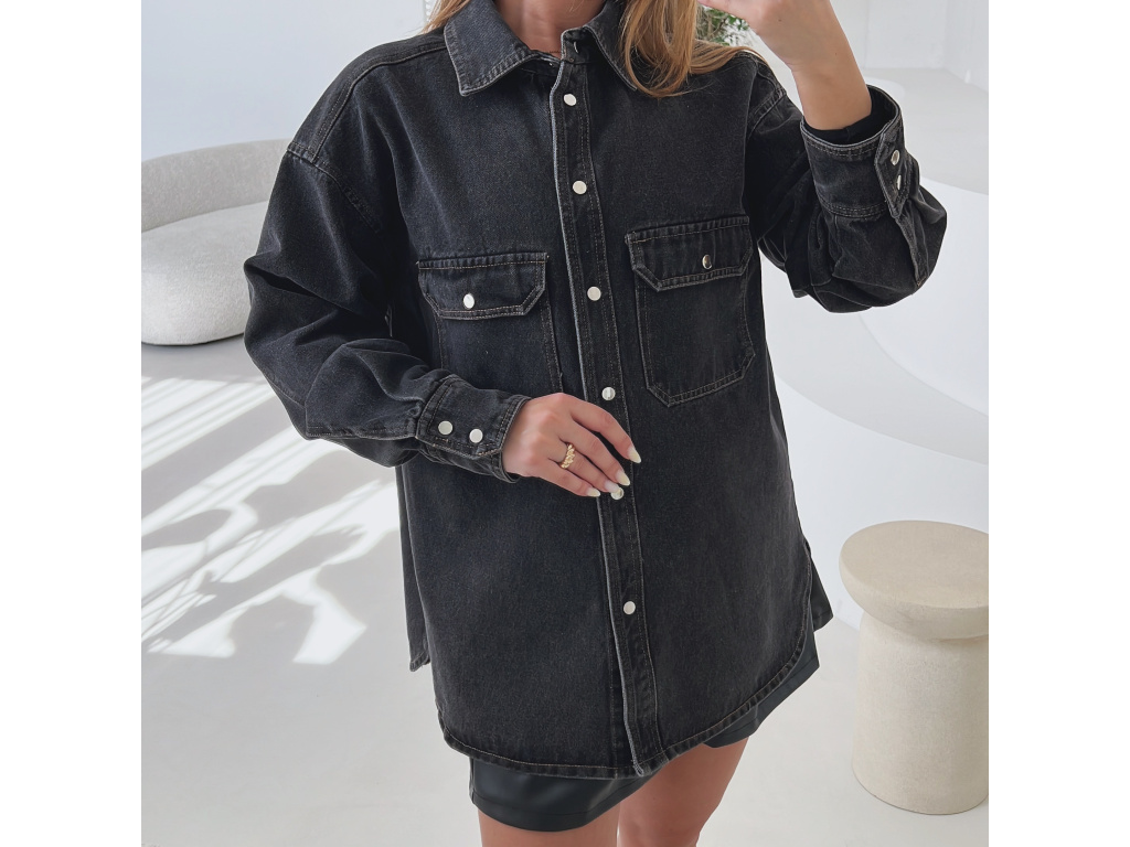 Trendy prodloužená džínová košile/bundička v šedé až černé barvě, která se stane vaším univerzálním kouskem do šatníku. Díky volnějšímu střihu je pohodlná na nošení a lze ji kombinovat jako svrchní vrstvu i samostatně. Praktické kapsy na prsou, kovové, stříbrné cvočky a kvalitní džínovina dodávají košili moderní vzhled. Velikost je S/M a M/L.