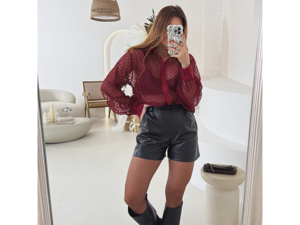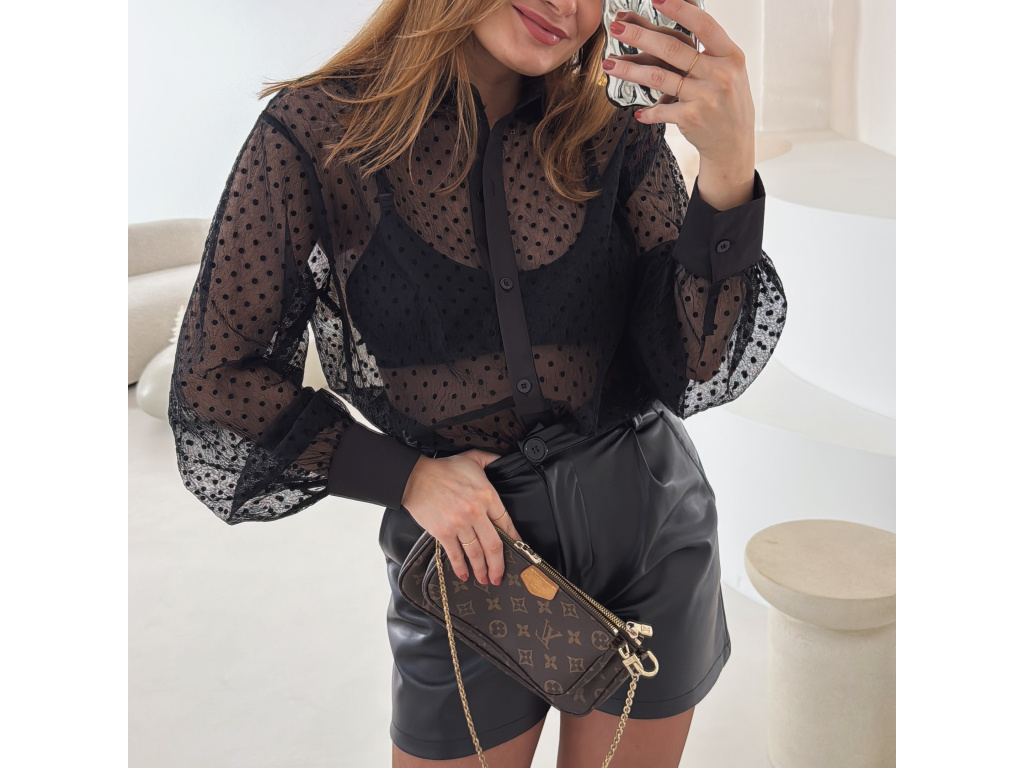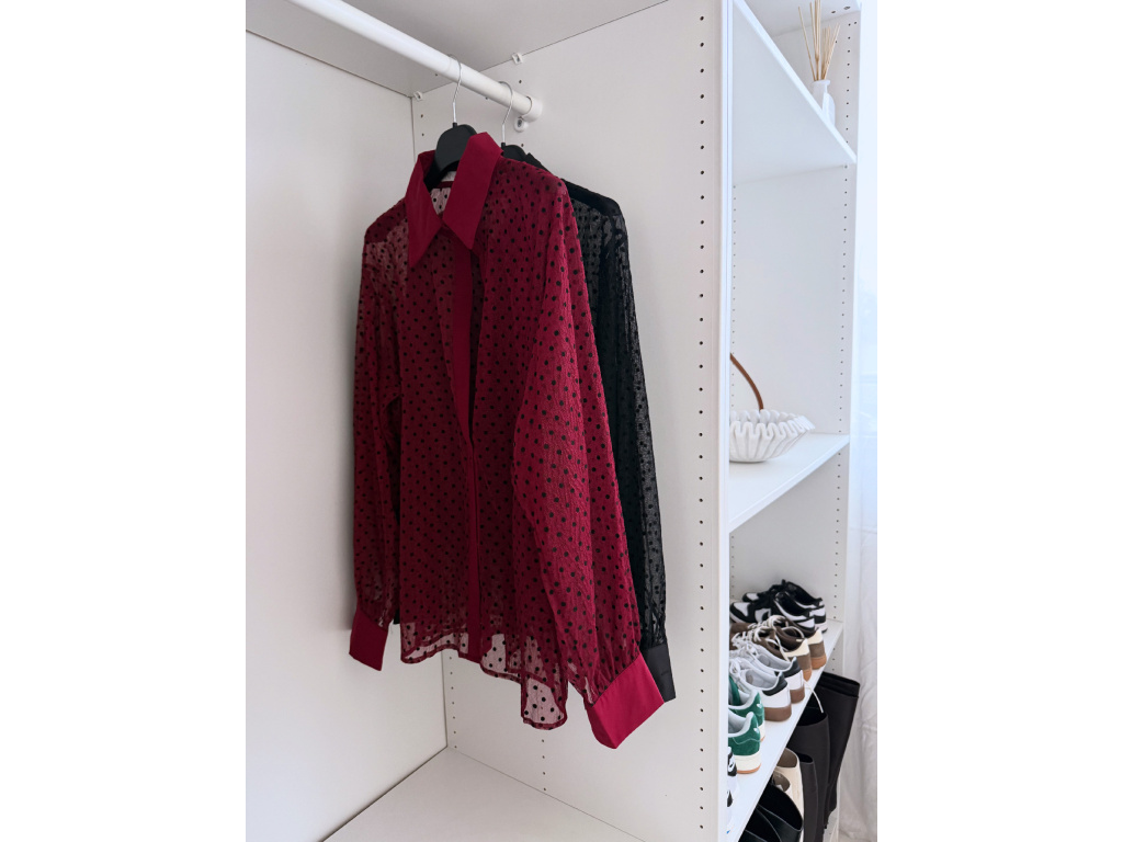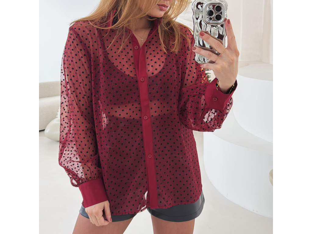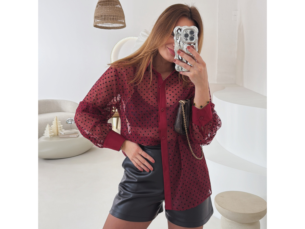 Elegantní košile z jemného průsvitného materiálu zdobená drobnými sametovými puntíky. Má klasický límeček, dlouhé rukávy s manžetou a knoflíkové zapínání po celé délce. Skvěle vyniká v kombinaci s braletkou nebo topem a dodá outfitu ženský, lehce odvážný nádech. Dostupná ve vínové a černé barvě.