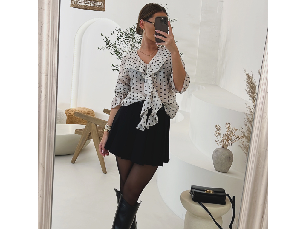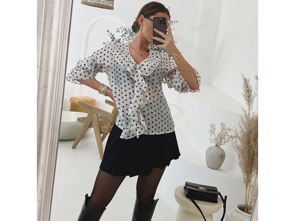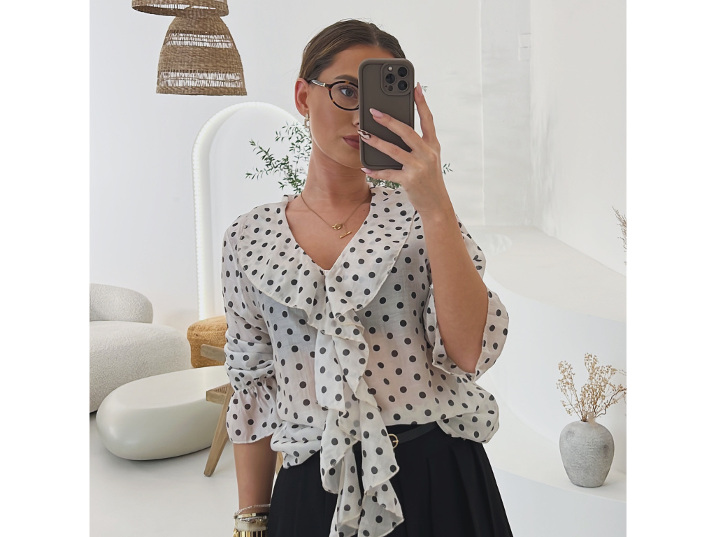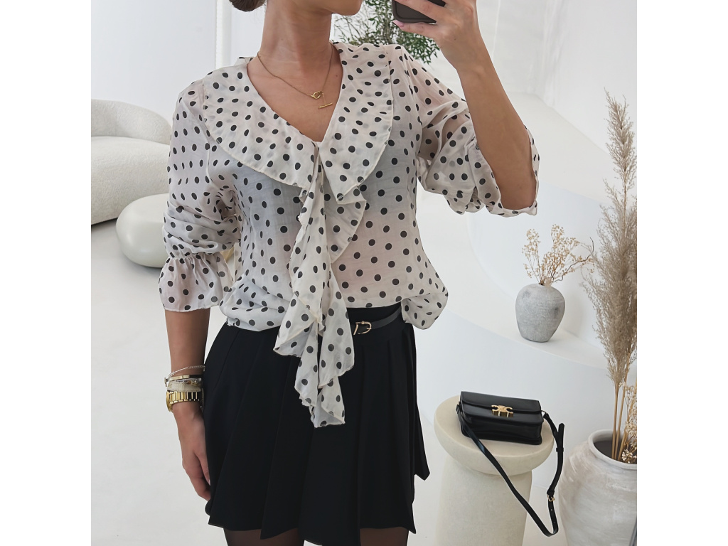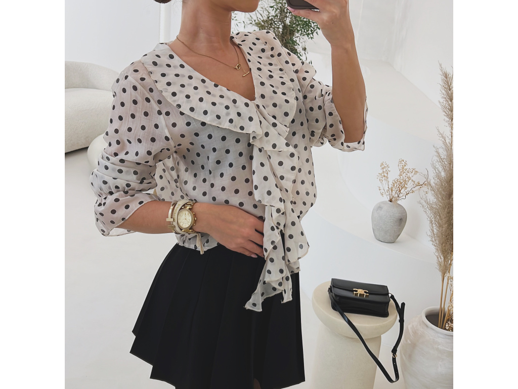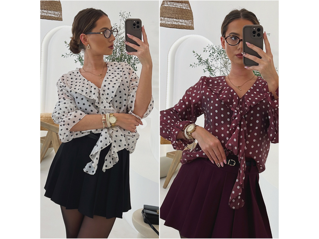 Romantická a hravá halenka s puntíky, která zaujme na první pohled. Jemně průsvitný materiál dodává lehkost a vzdušnost, zatímco volánkový límec a mašle u výstřihu přidávají ženský šarm. Halenka se hodí do kanceláře, na schůzku i na volný čas. Velikost je univerzální, sedí na XS, S, M. Kombinuj se sukní s vyšším pasem nebo elegantními kalhotami pro chic outfit.