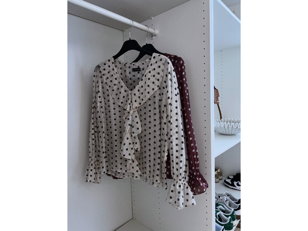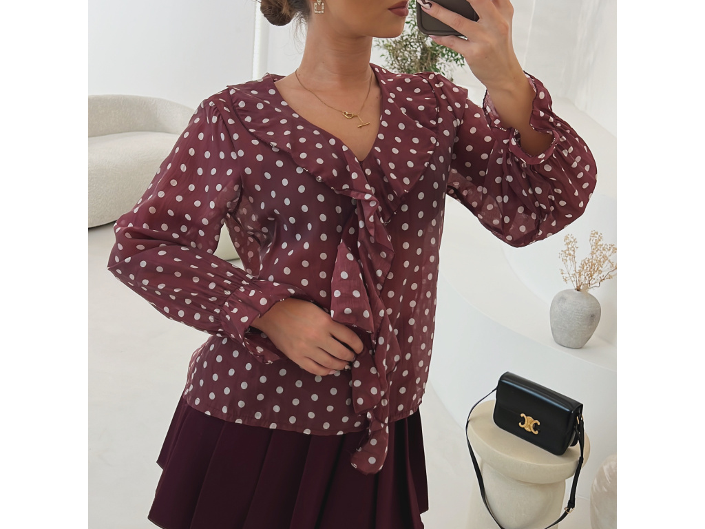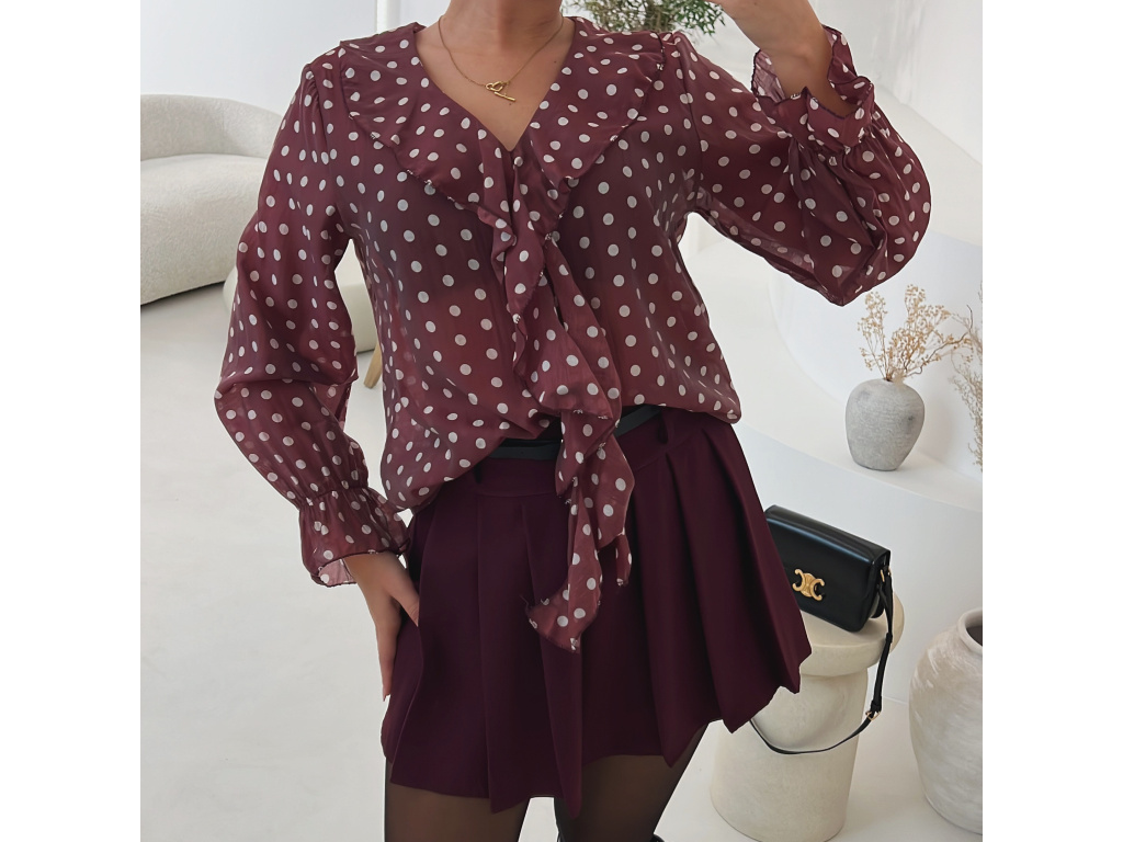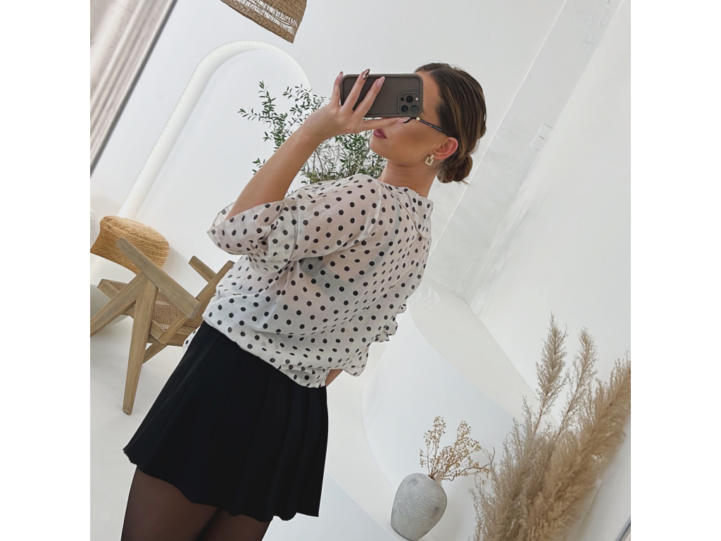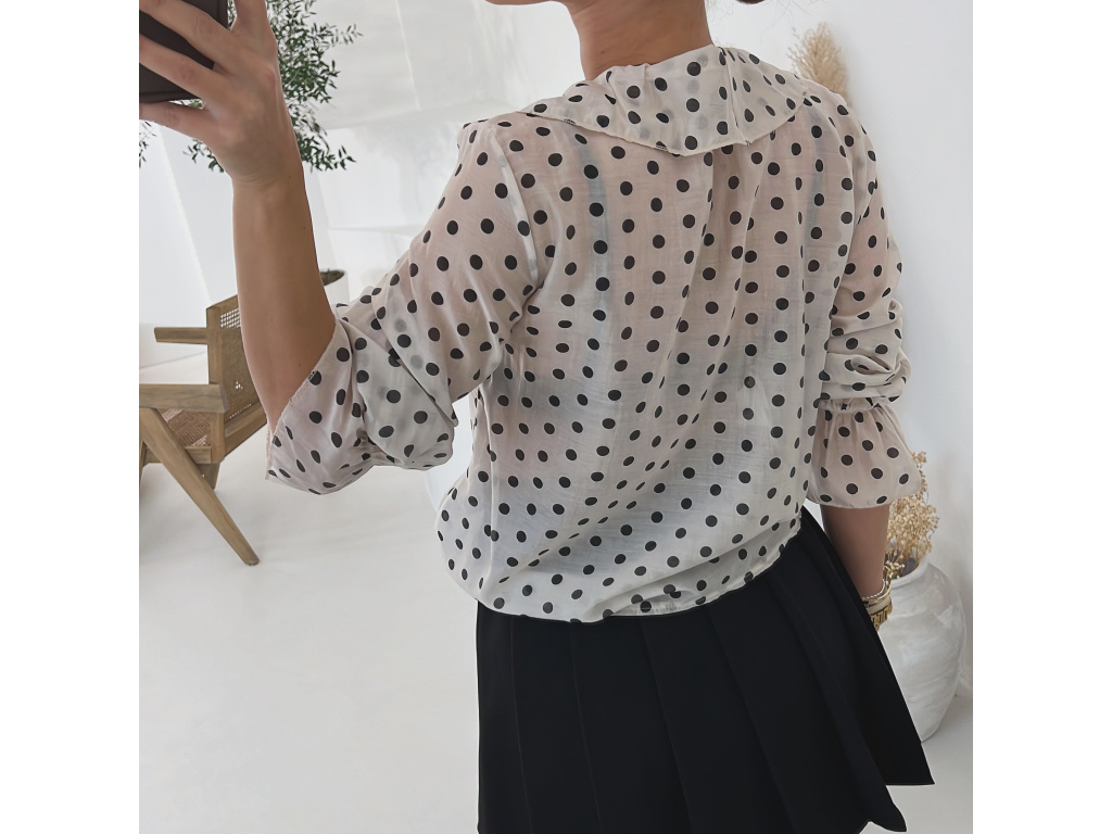 Romantická a hravá halenka s puntíky, která zaujme na první pohled. Jemně průsvitný materiál dodává lehkost a vzdušnost, zatímco volánkový límec a mašle u výstřihu přidávají ženský šarm. Halenka se hodí do kanceláře, na schůzku i na volný čas. Velikost je univerzální, sedí na XS, S, M. Kombinuj se sukní s vyšším pasem nebo elegantními kalhotami pro chic outfit.