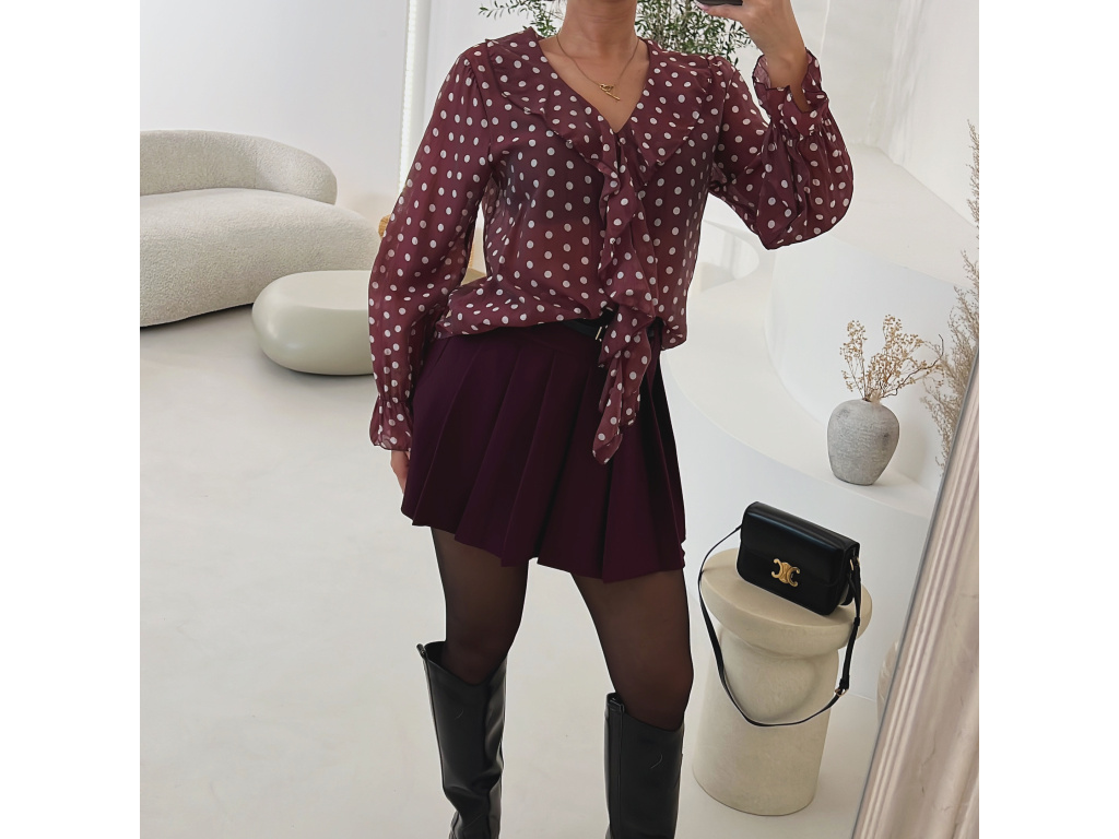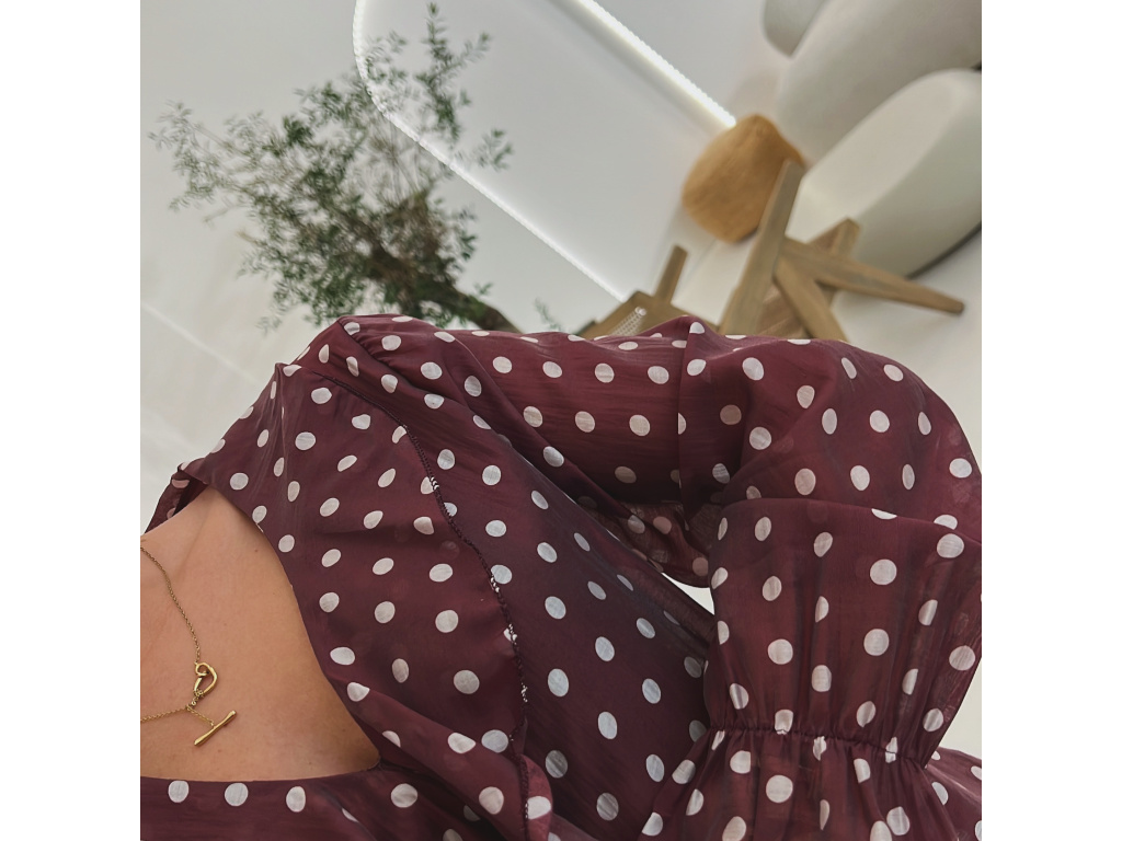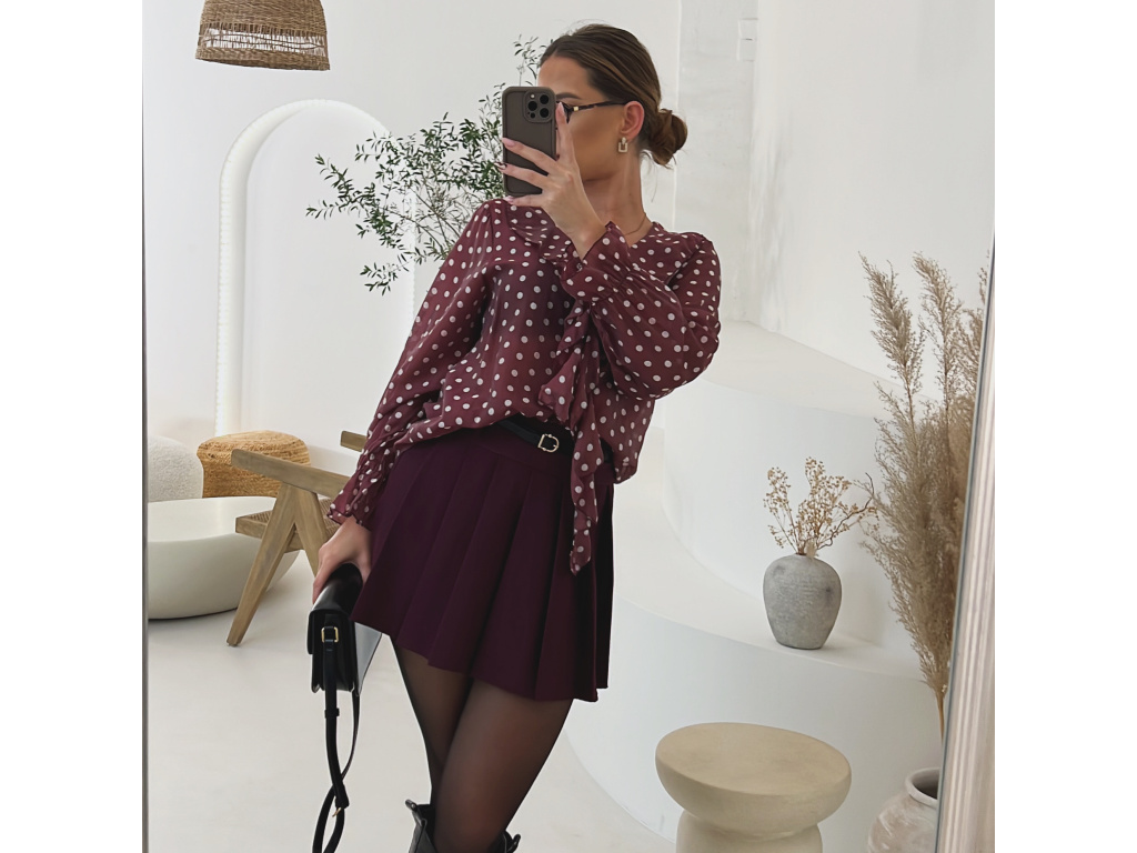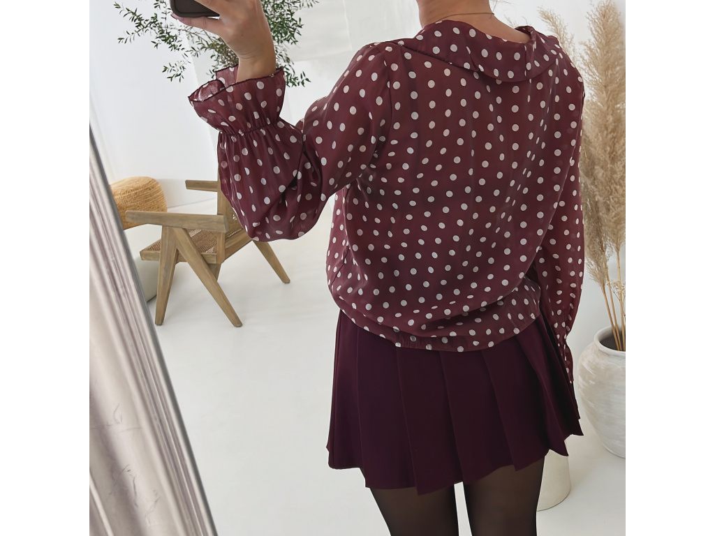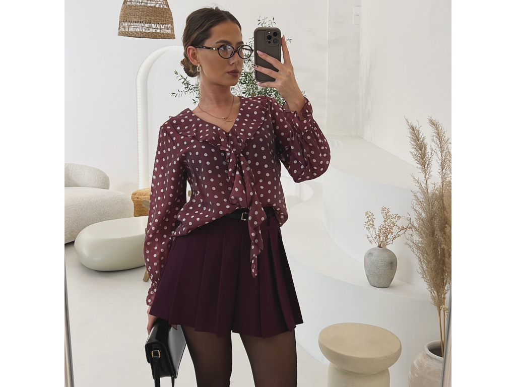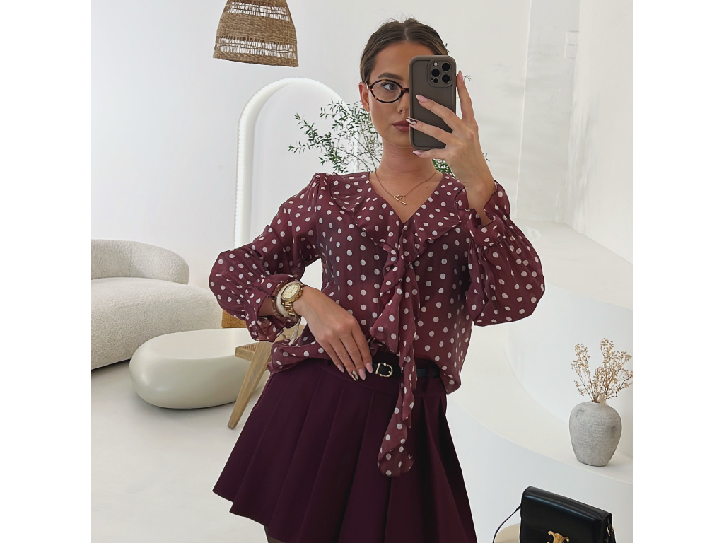 Romantická a hravá halenka s puntíky, která zaujme na první pohled. Jemně průsvitný materiál dodává lehkost a vzdušnost, zatímco volánkový límec a mašle u výstřihu přidávají ženský šarm. Halenka se hodí do kanceláře, na schůzku i na volný čas. Velikost je univerzální, sedí na XS, S, M. Kombinuj se sukní s vyšším pasem nebo elegantními kalhotami pro chic outfit.