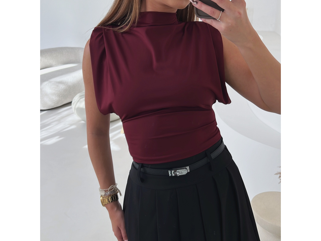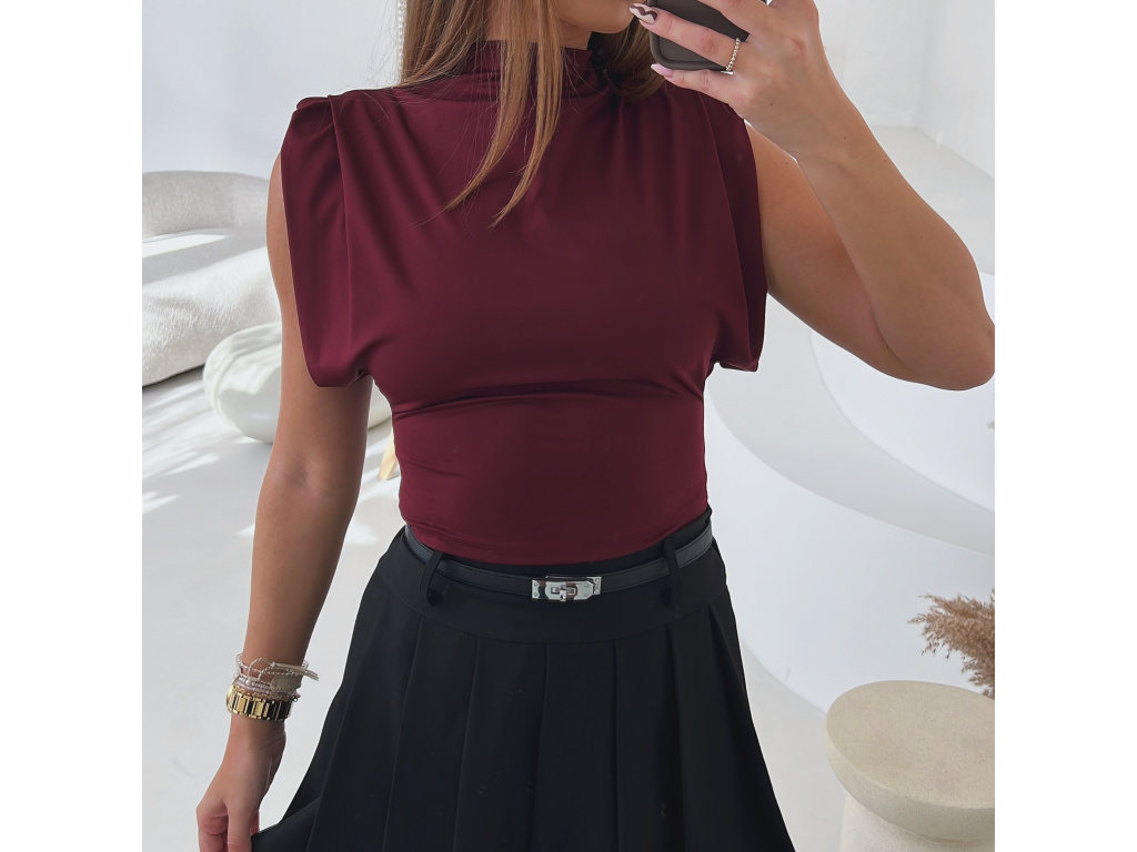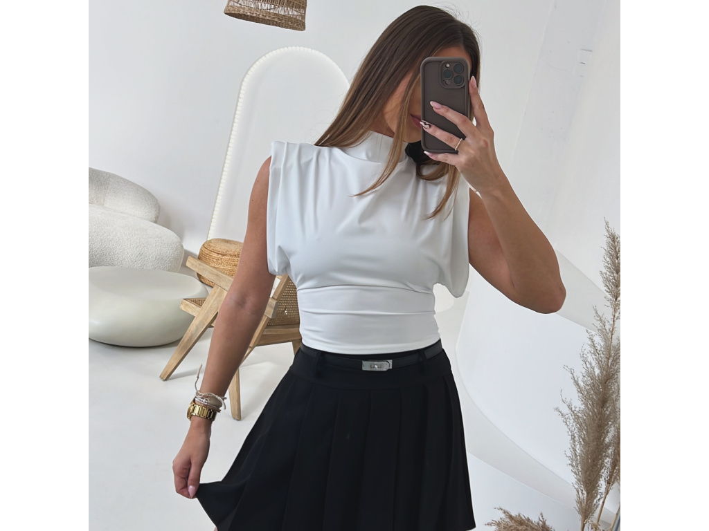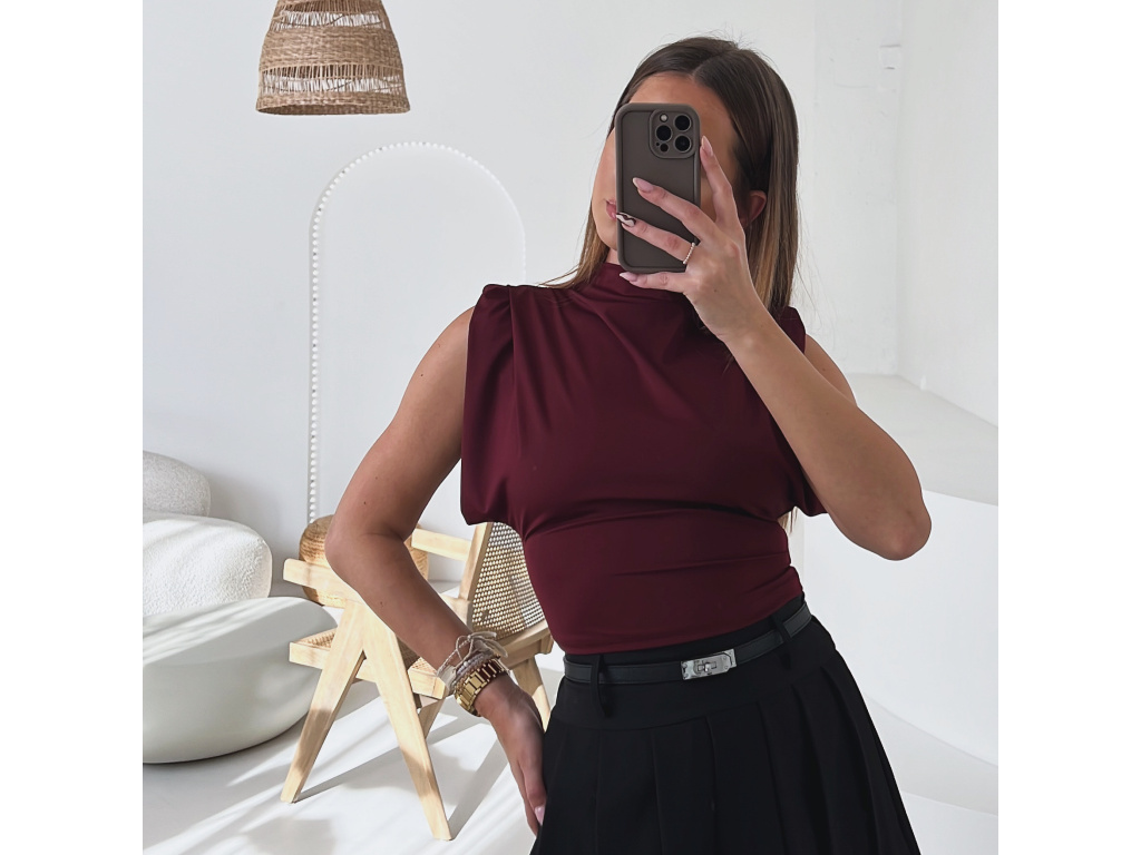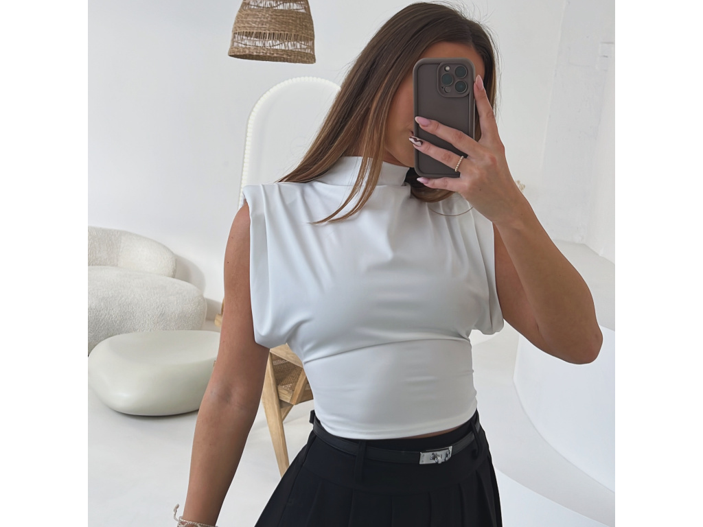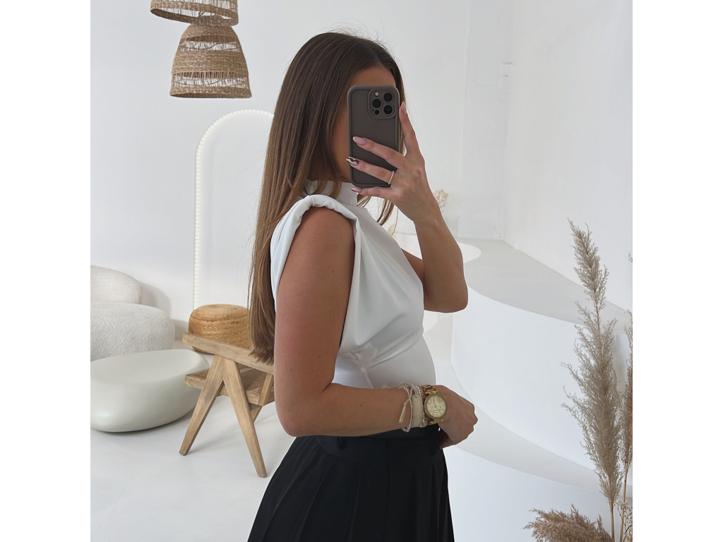 Elegantní top s výraznou siluetou ramen dodá tvému outfitu šmrnc i eleganci. Má jemné vycpávky v ramenou, zapínání za krkem na zlatý knoflík a je ušit z elastického, příjemného materiálu, který krásně obepne postavu. Skvěle se kombinuje se sukní, kalhotami i sakem – ideální volba pro stylové dny i večerní příležitosti.