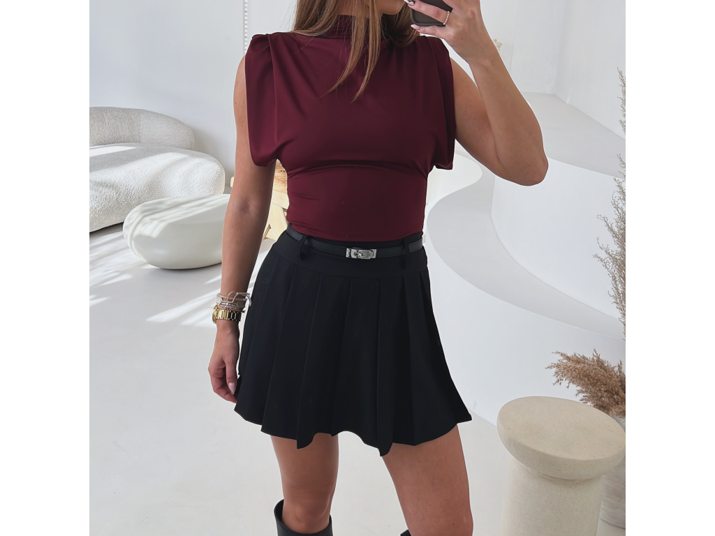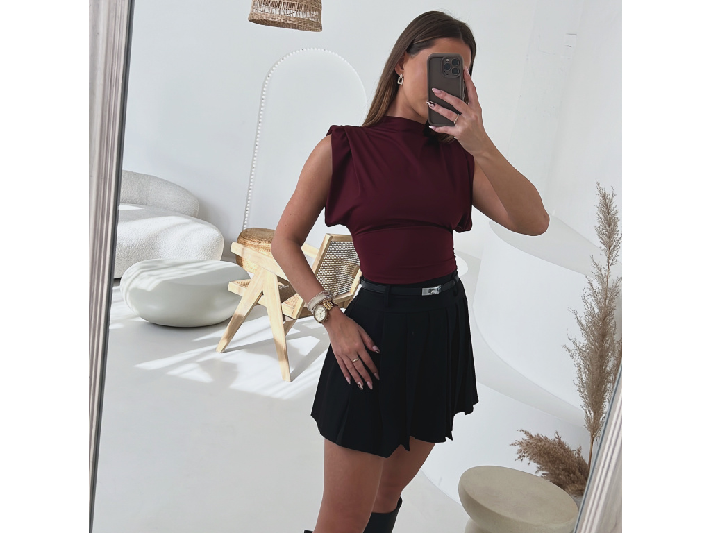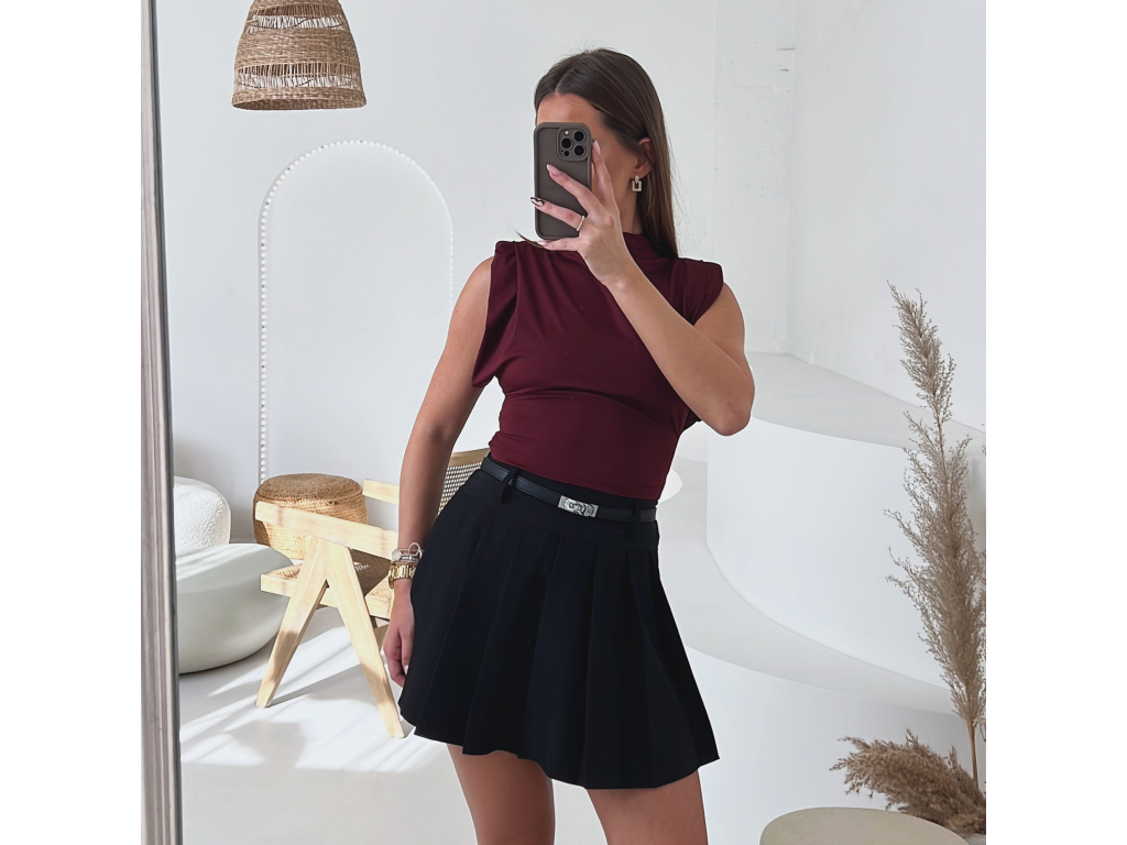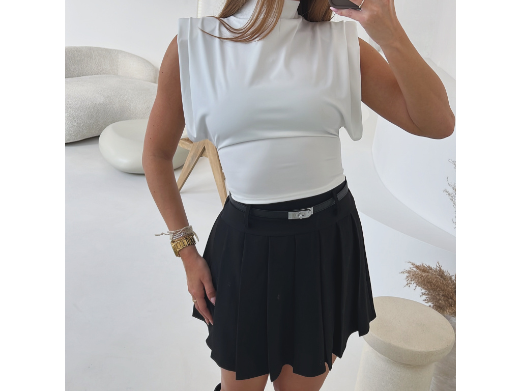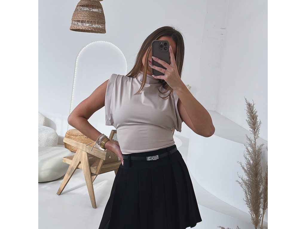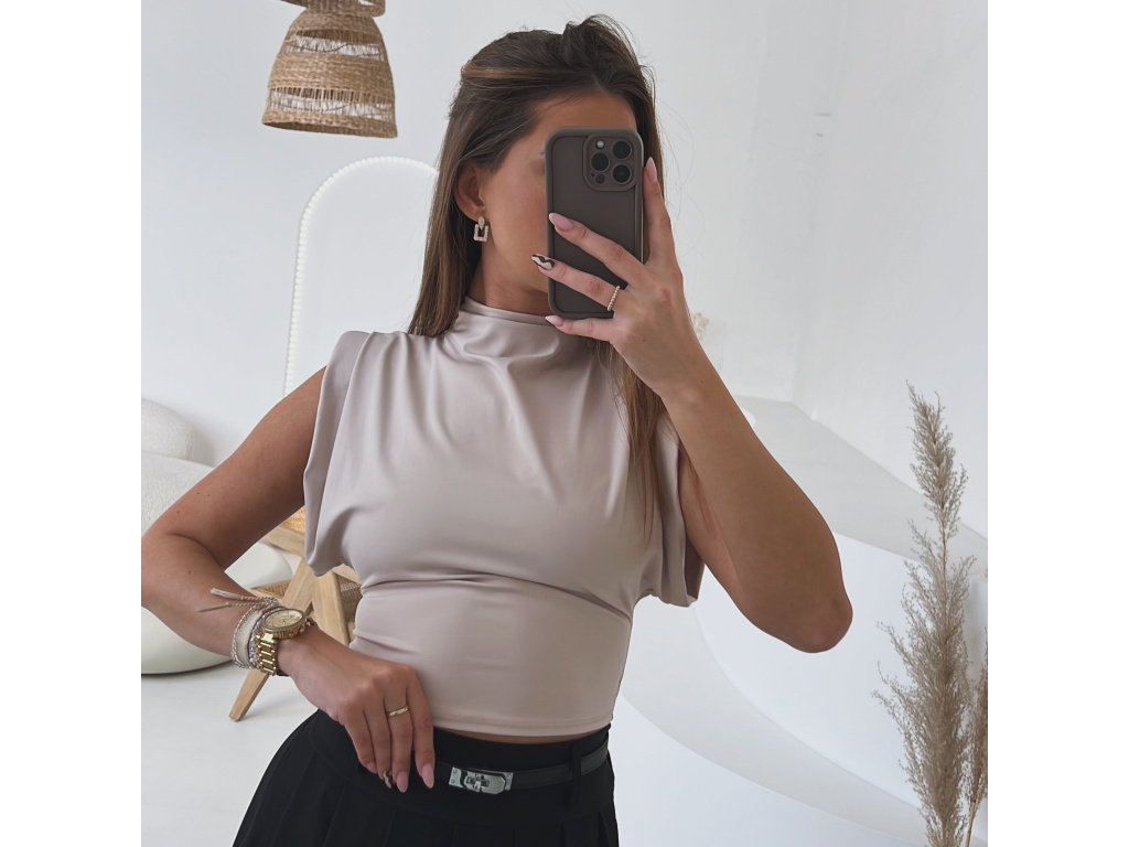 Elegantní top s výraznou siluetou ramen dodá tvému outfitu šmrnc i eleganci. Má jemné vycpávky v ramenou, zapínání za krkem na zlatý knoflík a je ušit z elastického, příjemného materiálu, který krásně obepne postavu. Skvěle se kombinuje se sukní, kalhotami i sakem – ideální volba pro stylové dny i večerní příležitosti.