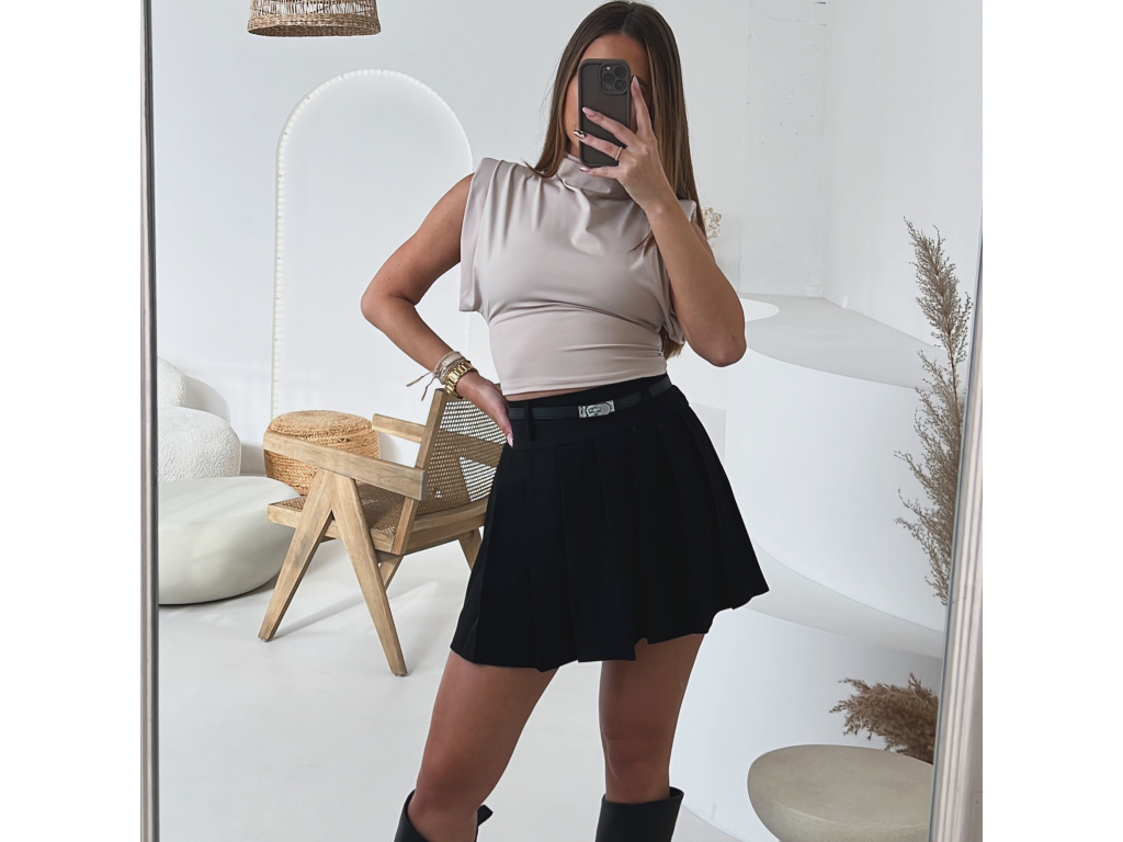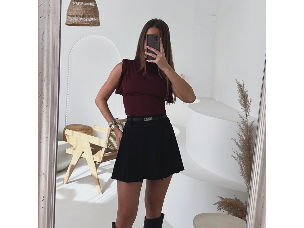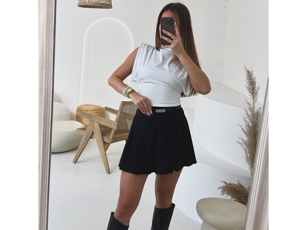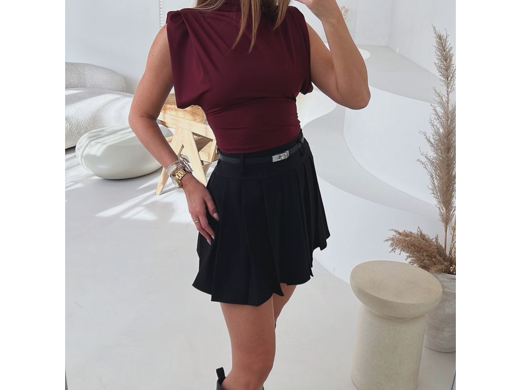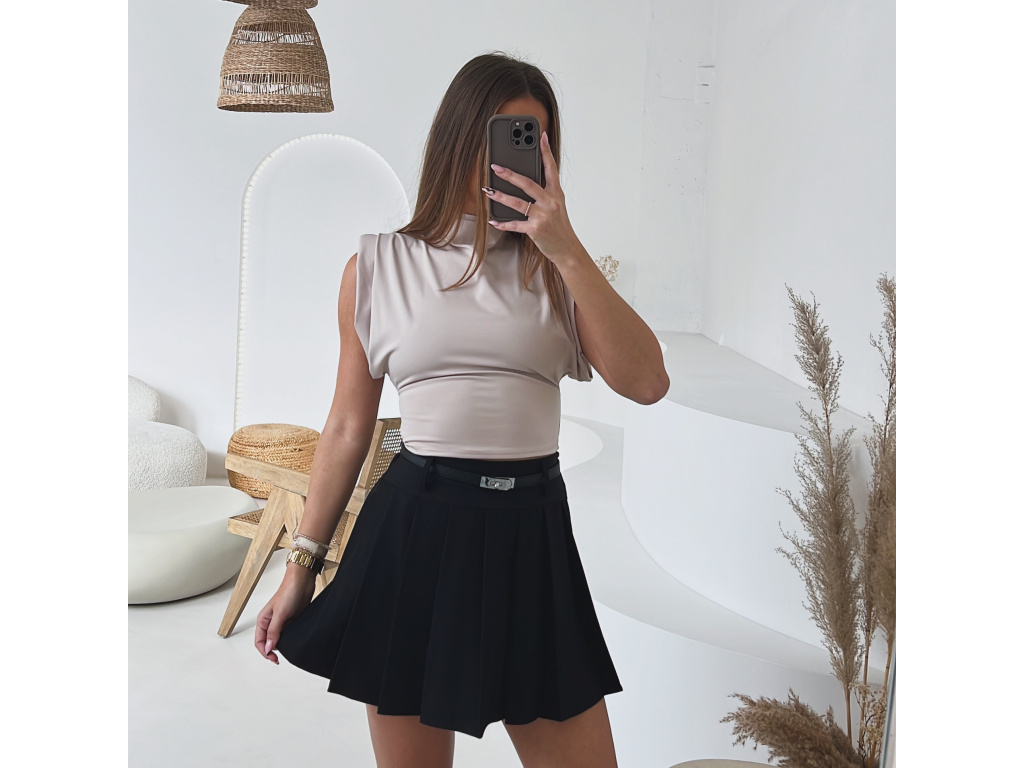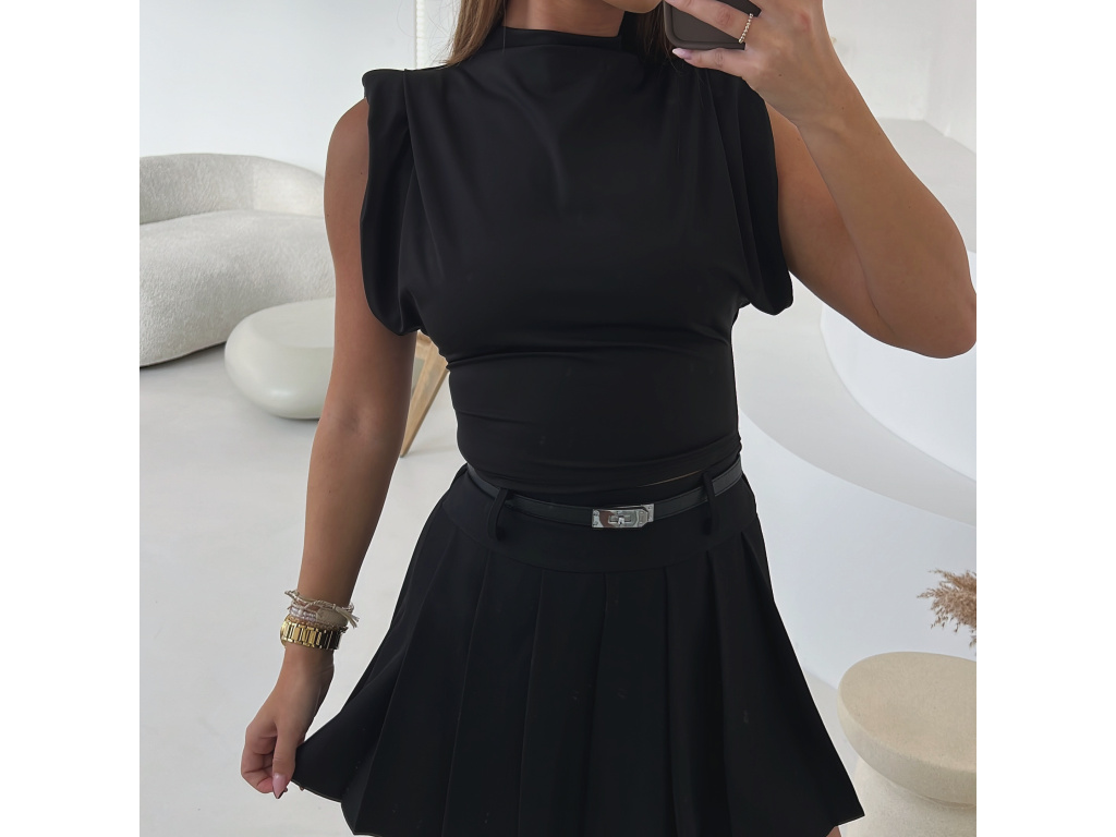 Elegantní top s výraznou siluetou ramen dodá tvému outfitu šmrnc i eleganci. Má jemné vycpávky v ramenou, zapínání za krkem na zlatý knoflík a je ušit z elastického, příjemného materiálu, který krásně obepne postavu. Skvěle se kombinuje se sukní, kalhotami i sakem – ideální volba pro stylové dny i večerní příležitosti.