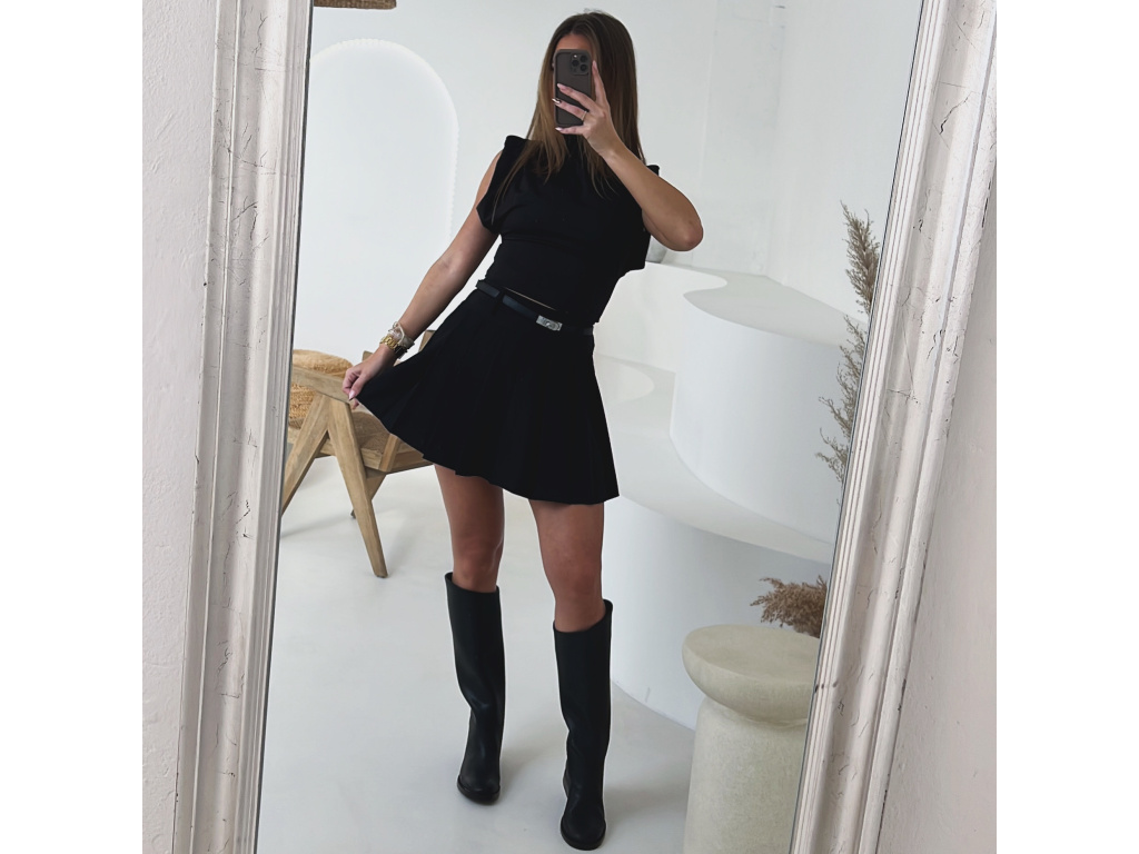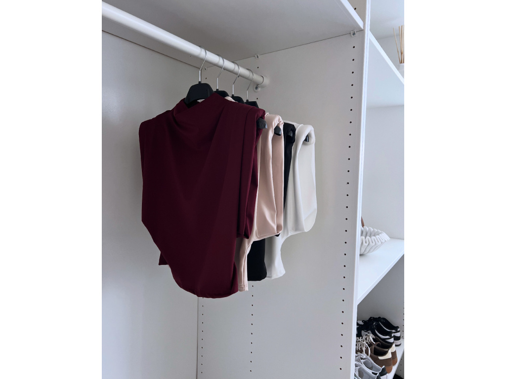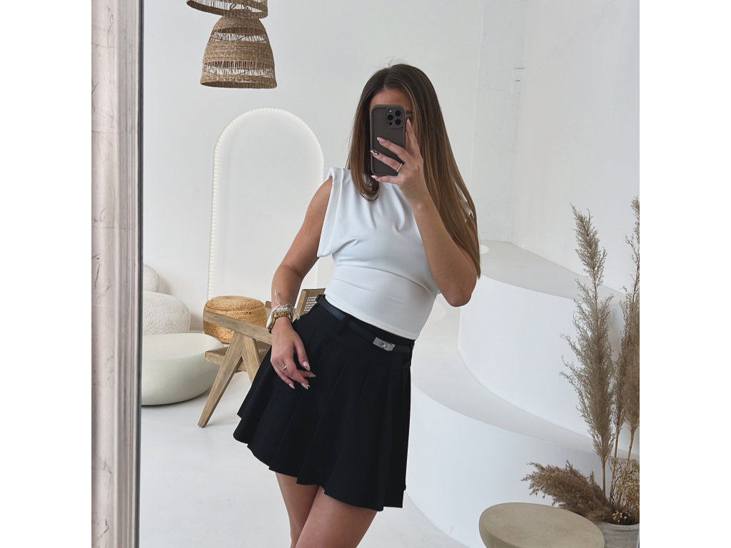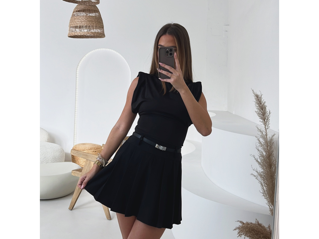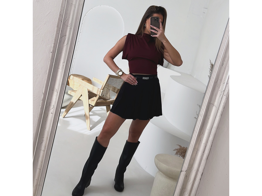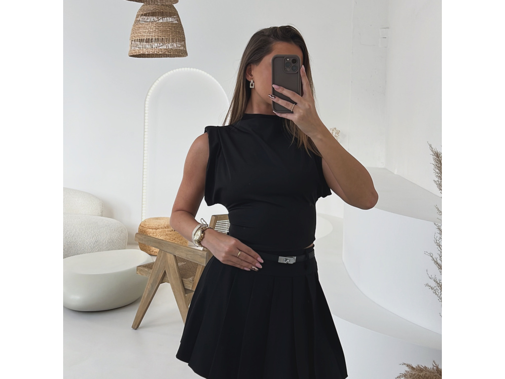 Elegantní top s výraznou siluetou ramen dodá tvému outfitu šmrnc i eleganci. Má jemné vycpávky v ramenou, zapínání za krkem na zlatý knoflík a je ušit z elastického, příjemného materiálu, který krásně obepne postavu. Skvěle se kombinuje se sukní, kalhotami i sakem – ideální volba pro stylové dny i večerní příležitosti.