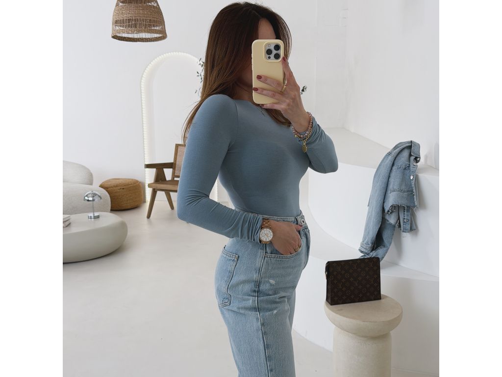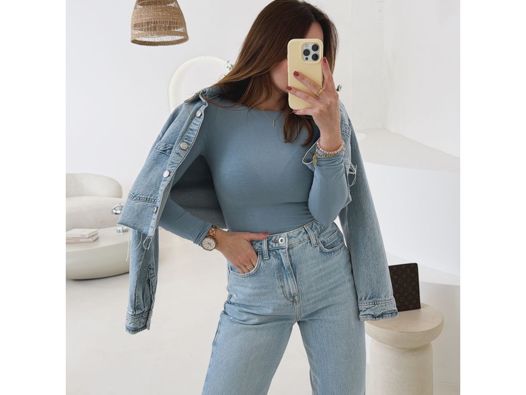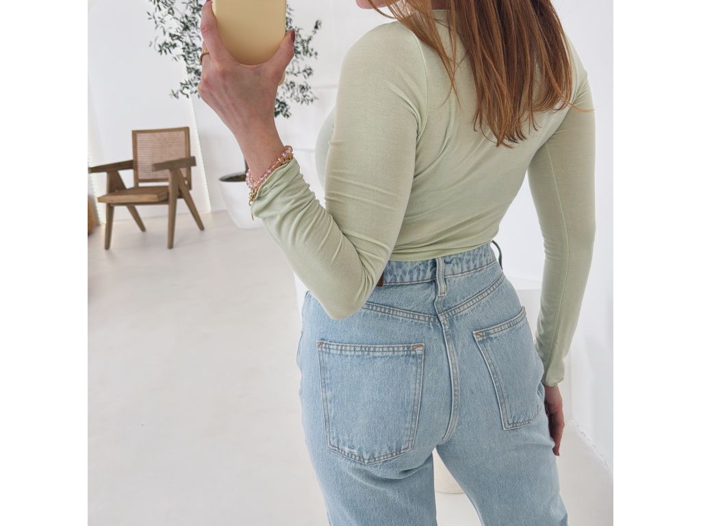 Extra příjemný, jemný top v nové modré a mint barvě s dlouhým rukávem. Top decentně prosvítá, je z lehkého, elastického materiálu. Velikost je univerzální, sedí na XS, S, M i menší L. Foceno je na velikosti XS a výšce 165 cm.