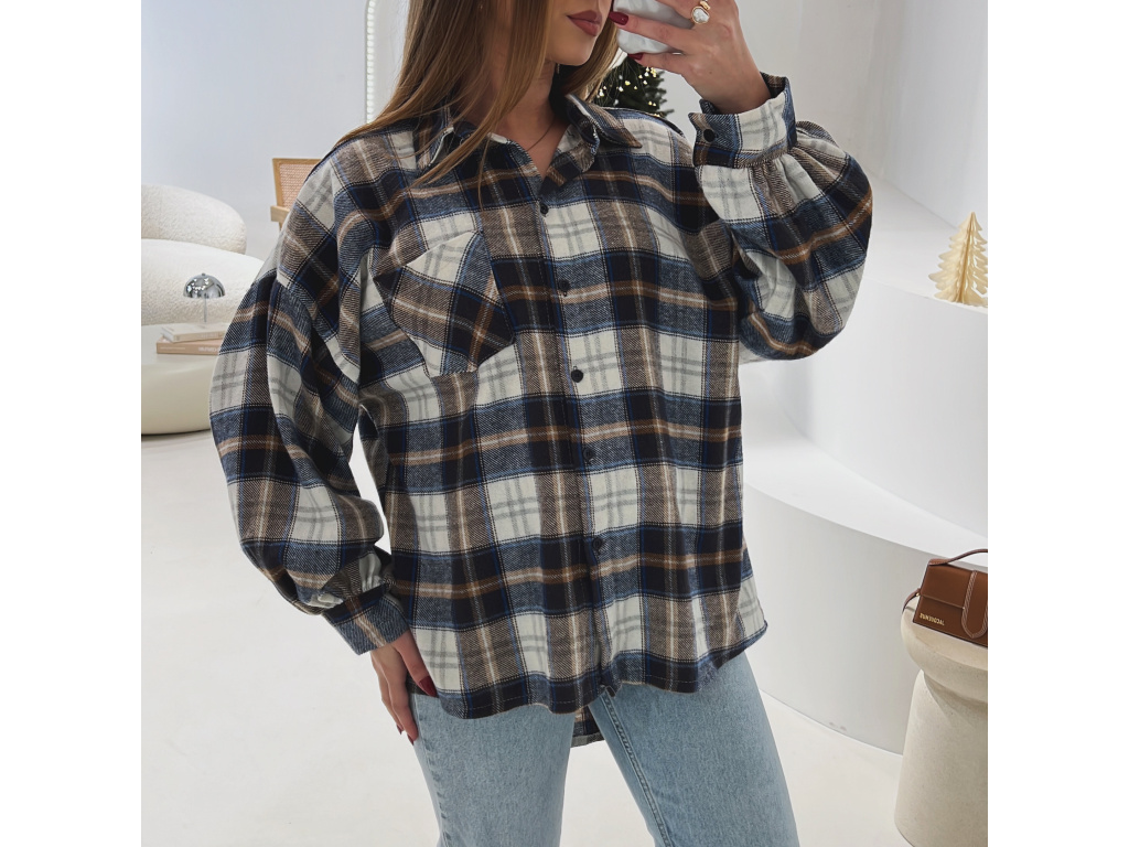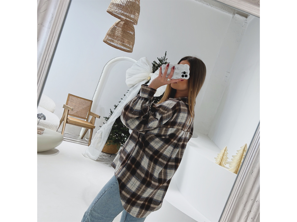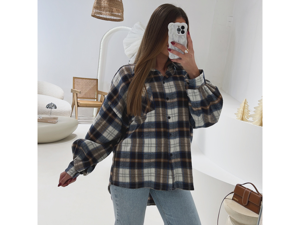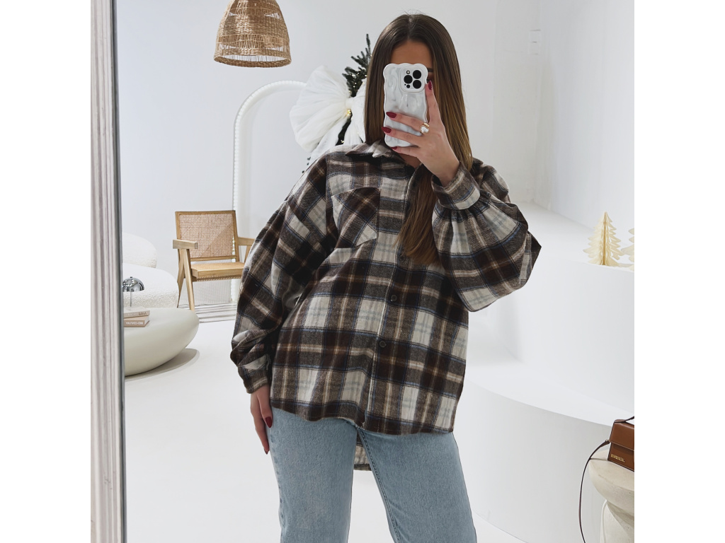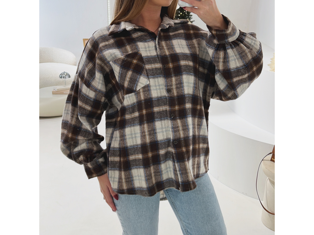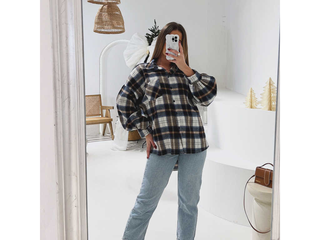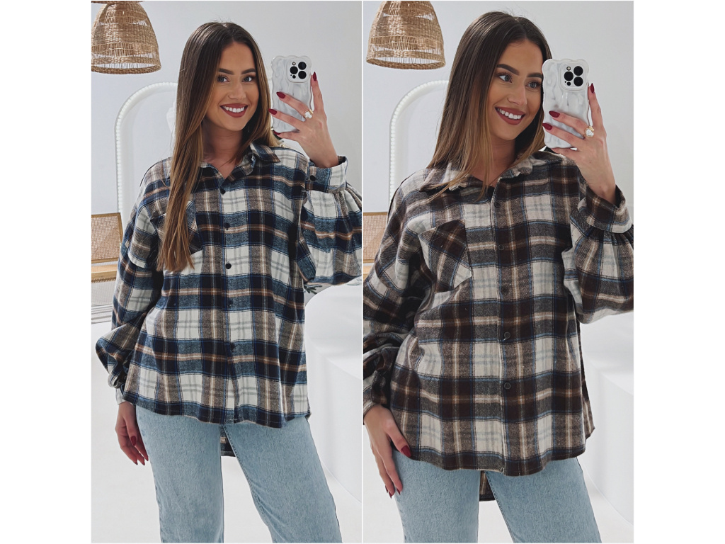 Stylová karo košile v oversize střihu je ideální volbou pro pohodlné a trendy outfity. Má asymetrický střih – vepředu kratší a vzadu delší, což dodává moderní siluetu. Mírně balónové rukávy jsou zakončené klasickou manžetou. Košile je příjemná na nošení a dostupná ve dvou nadčasových odstínech – modrém a hnědém. Perfektní k džínům i legínám.