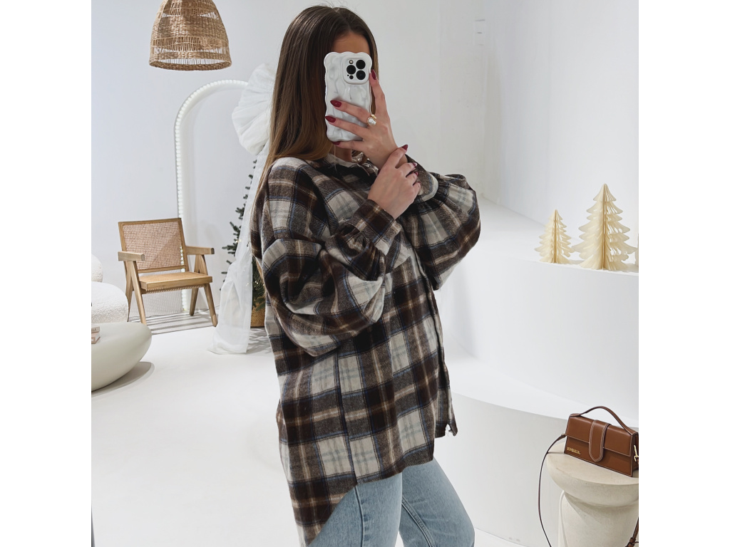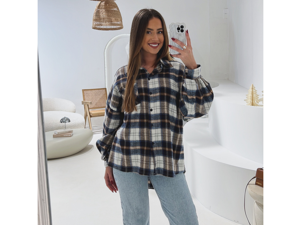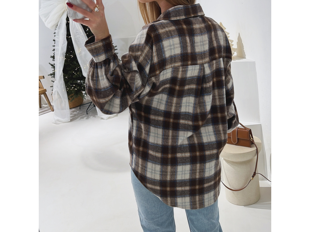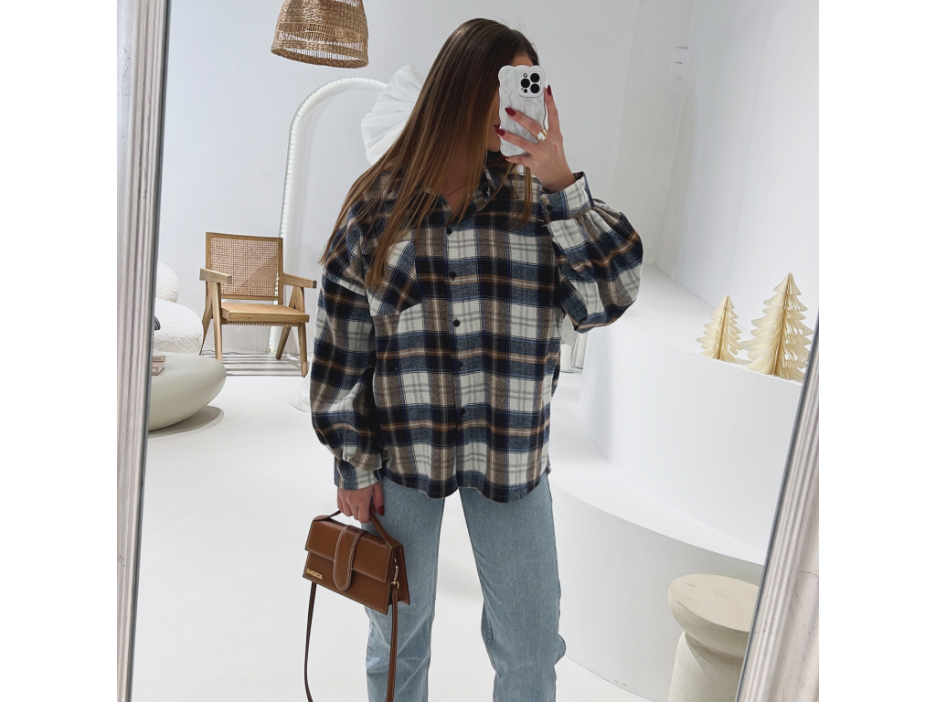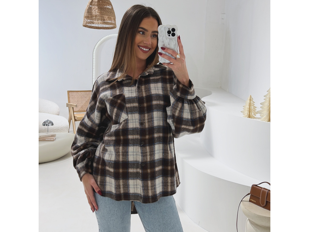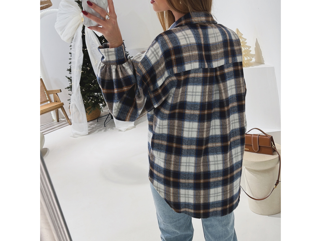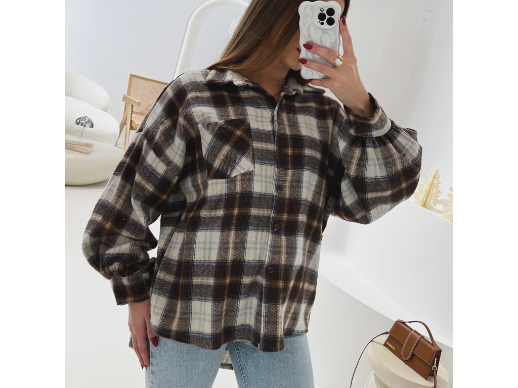 Stylová karo košile v oversize střihu je ideální volbou pro pohodlné a trendy outfity. Má asymetrický střih – vepředu kratší a vzadu delší, což dodává moderní siluetu. Mírně balónové rukávy jsou zakončené klasickou manžetou. Košile je příjemná na nošení a dostupná ve dvou nadčasových odstínech – modrém a hnědém. Perfektní k džínům i legínám.