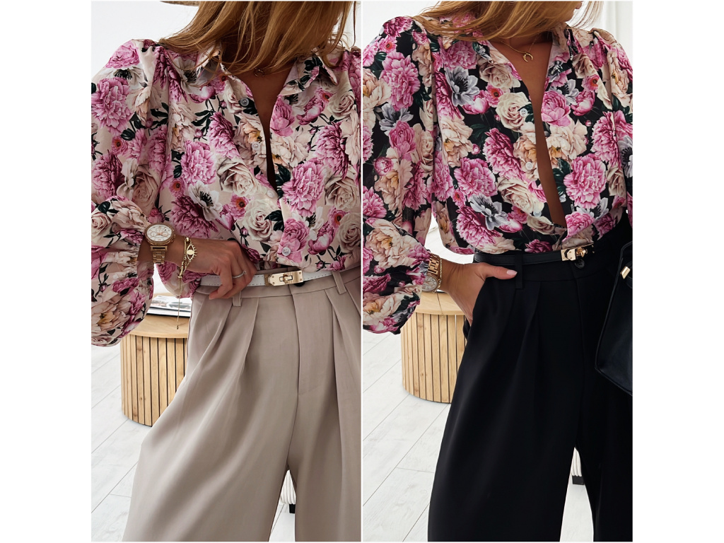 Košile krásného jarního, květinového vzoru v béžové a černé barvě s balónovými rukávy zakončeny do gumy. Velikost je univerzální, sedí na XS - L. Foceno je na velikosti XS a výšce 165 cm.!