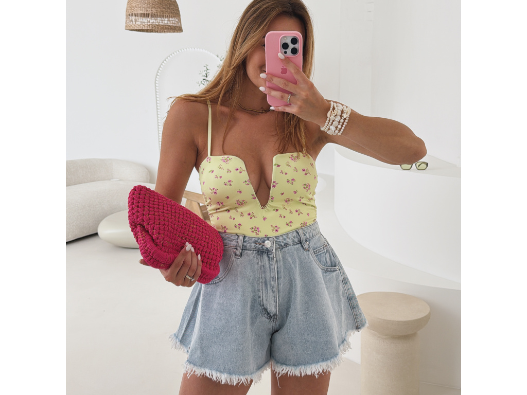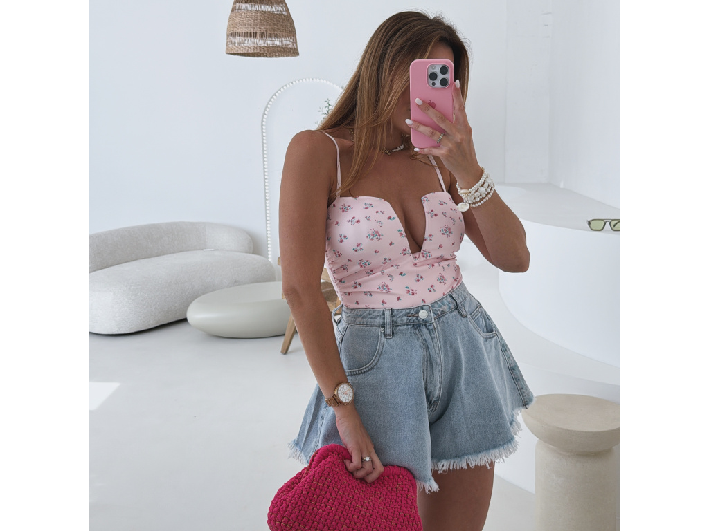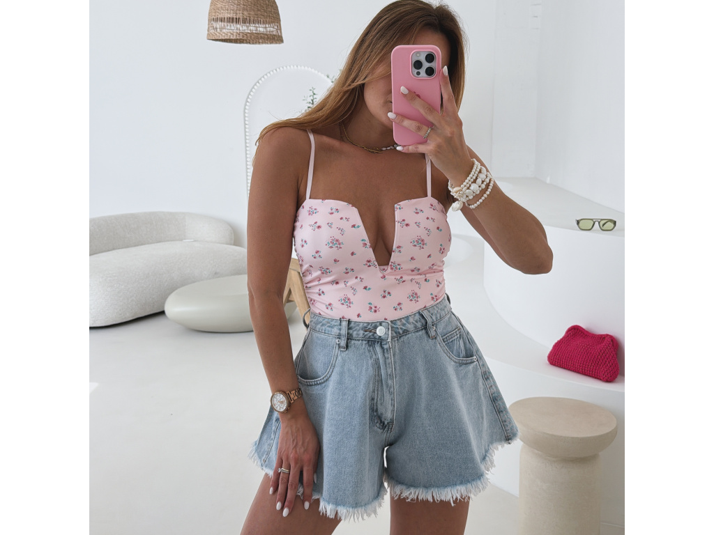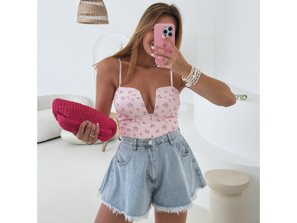 Smyslné body s výrazným výstřihem, které dokonale zvýrazní dekolt díky všité výztuži prsou. Vyrobené z pružného materiálu, krásně obepne postavu. Má posuvná nastavitelná ramínka a praktické zapínání ve spodní části na podprsenkové háčky. Perfektní volba pro odvážný look – samostatně i pod sako! Velikost je univerzální, sedí na XS,S a M.