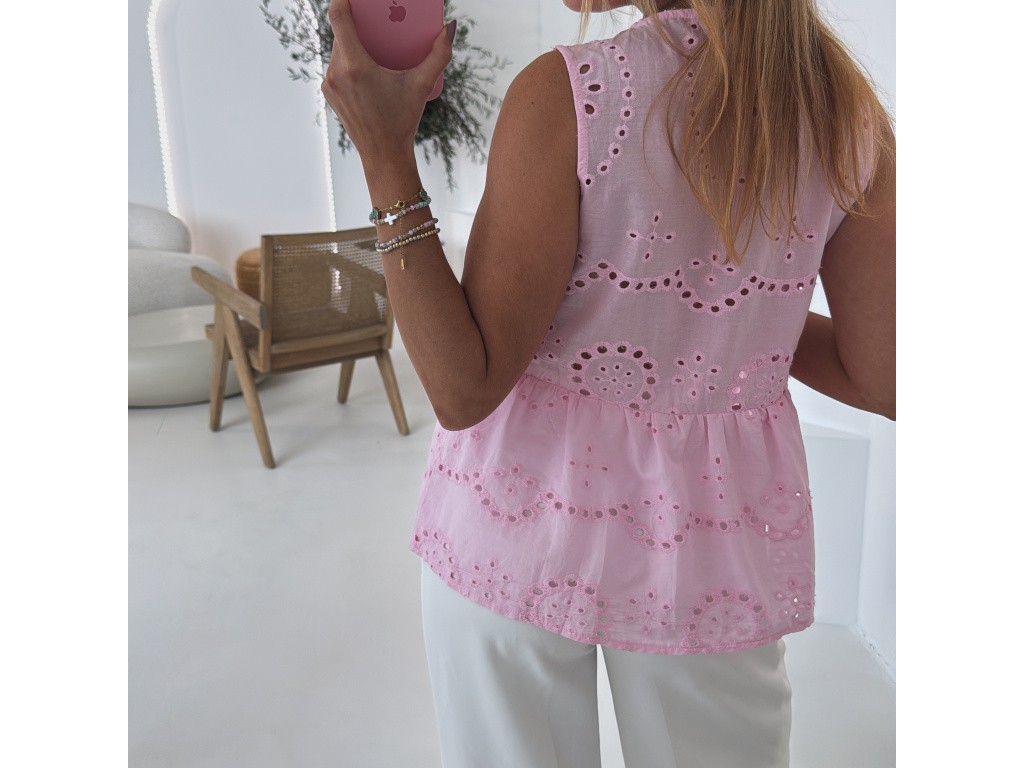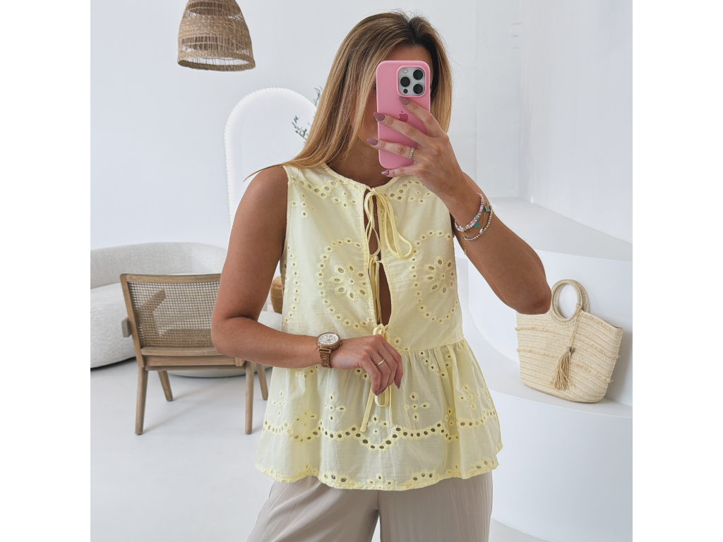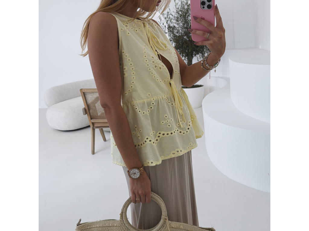 Romantická madejrová tunika bez rukávů s jemnými výšivkami, šněrováním vpředu a volánovým spodním lemem. Lehký, vzdušný střih, který krásně sedí a lichotí postavě. Ideální volba pro letní dny – k džínům, šortkám i plážovým outfitům. Velikost je S, M a L.
