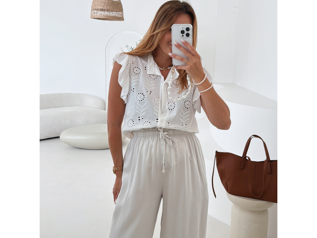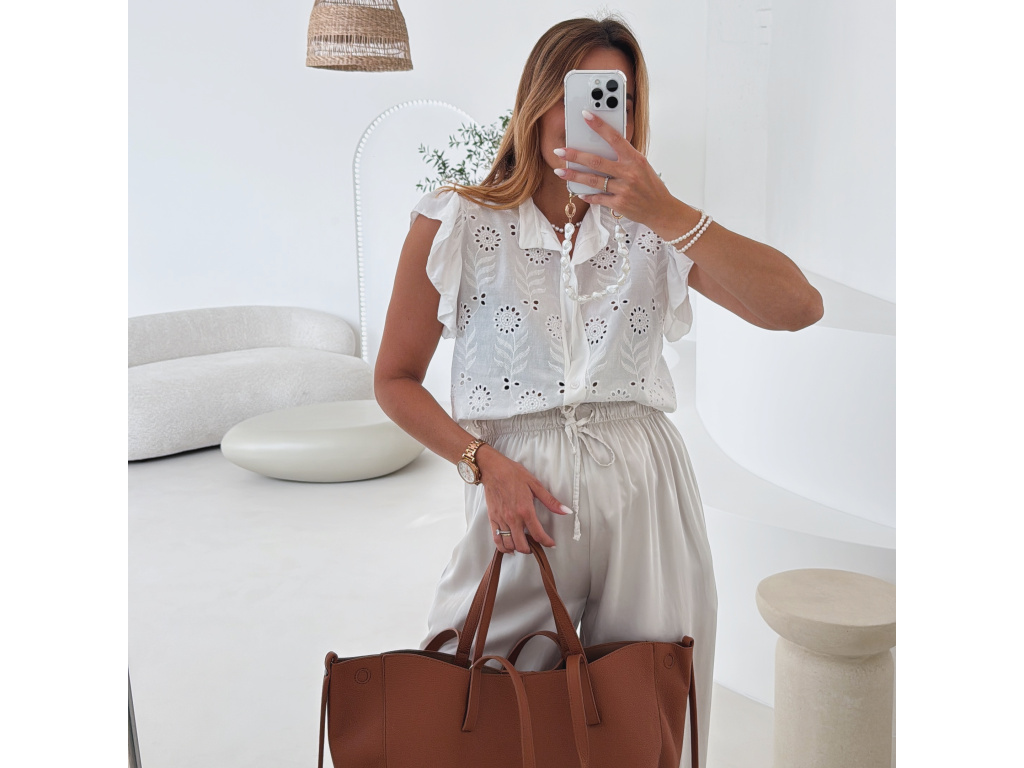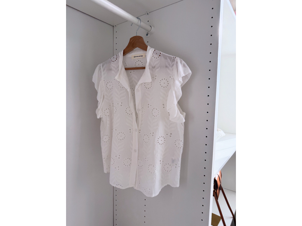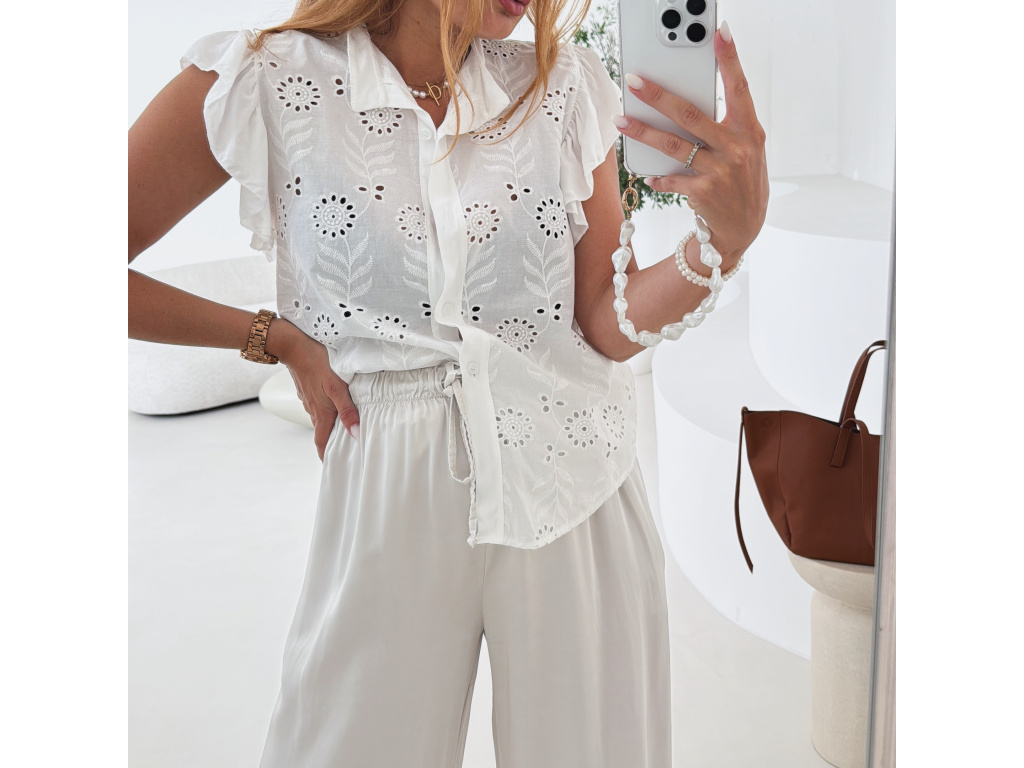 Lehká a vzdušná halenka s jemným vyšívaným vzorem a volánkovými rukávy. Romantický kousek, který dodá svěžest každému letnímu outfitu a snadno se kombinuje s kalhotami i sukní. Velikost je univerzální, sedí na XS až M.