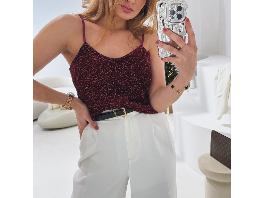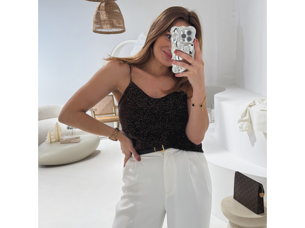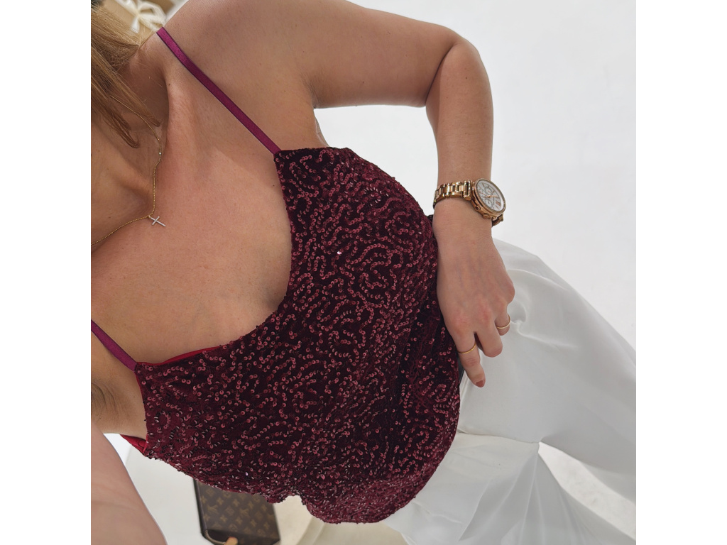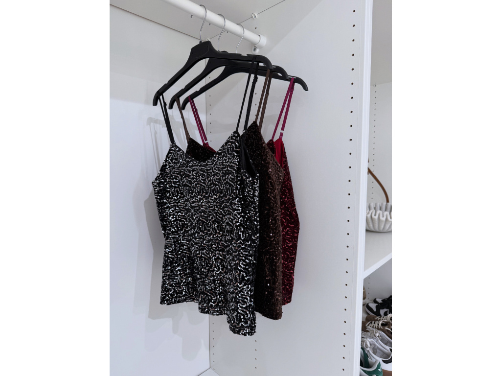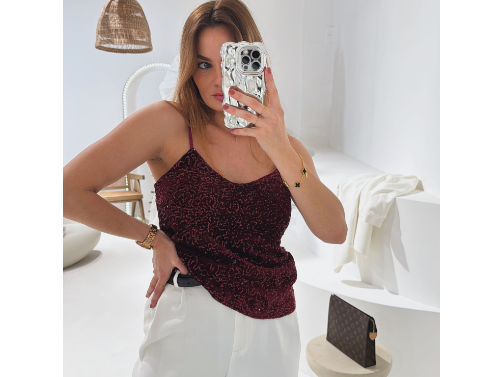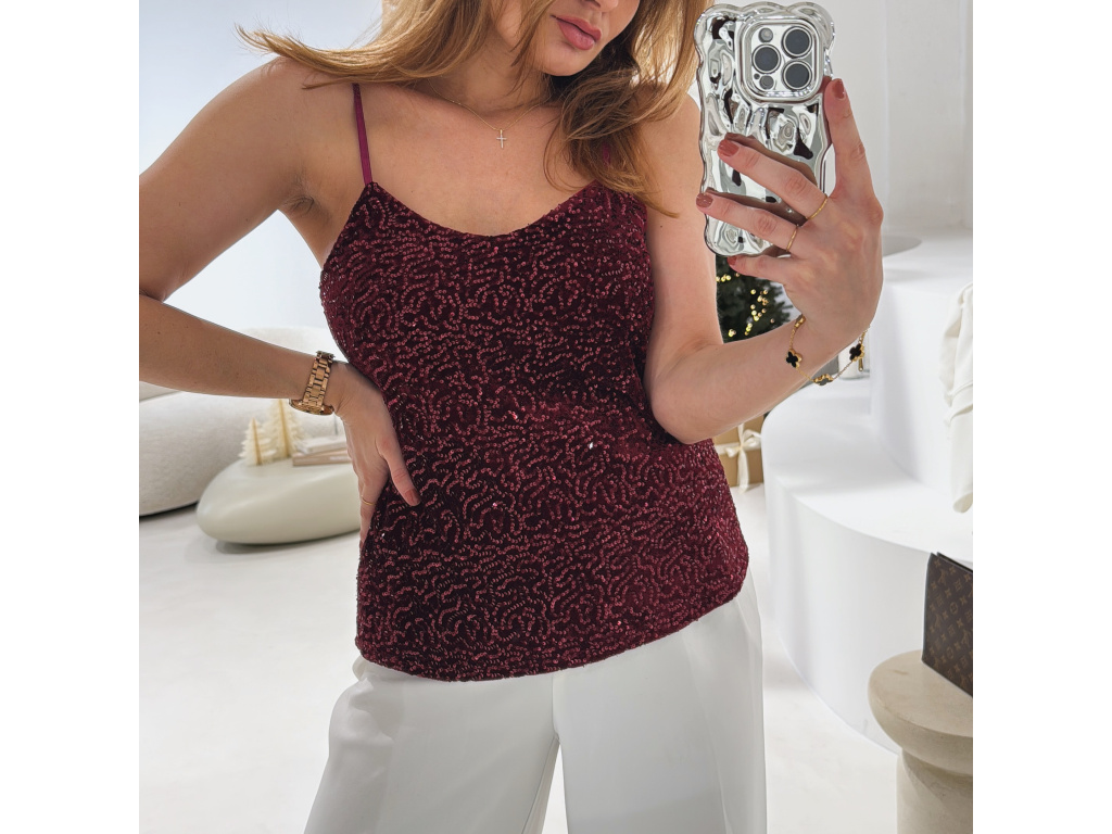 Stylový nátělník zdobený jemnými flitry, které vytvářejí krásný třpytivý efekt. Díky posuvným ramínkům si můžete snadno upravit délku podle sebe a všitá výztuž zajišťuje perfektní tvar i pohodlné nošení. Dostupný ve třech luxusních barvách – stříbrné, hnědé a vínové. Ideální k saku, na večerní outfit i jako výrazný detail v každodenním looku. Velikost univerzální, sedí na XS, S a M.