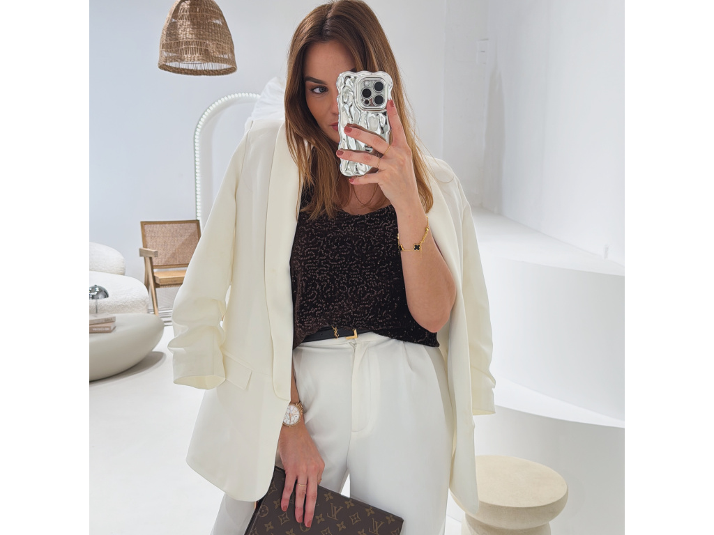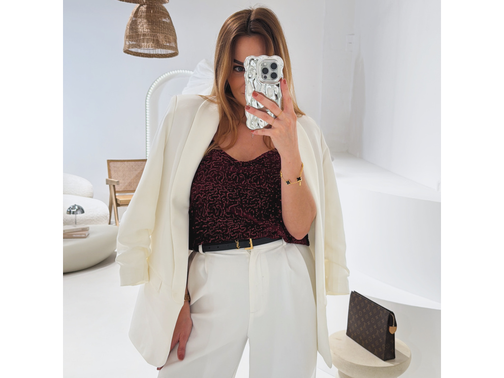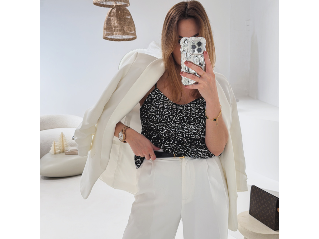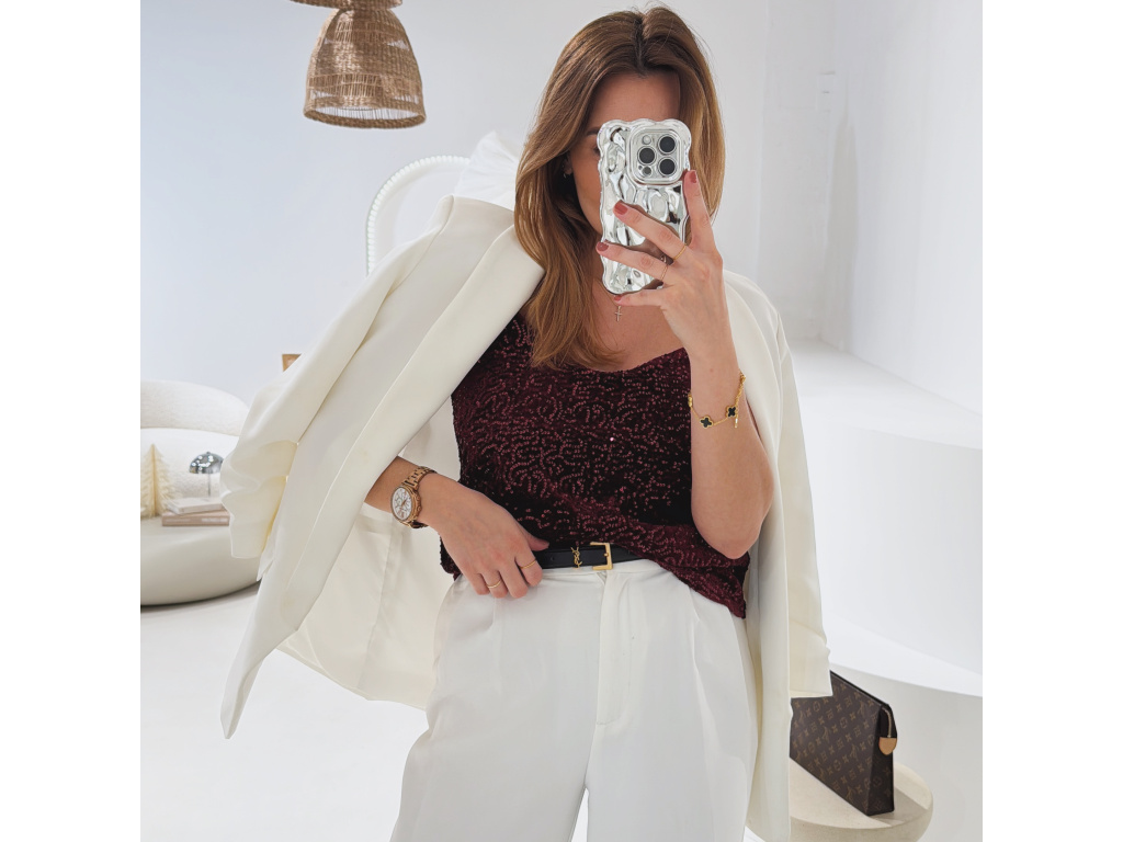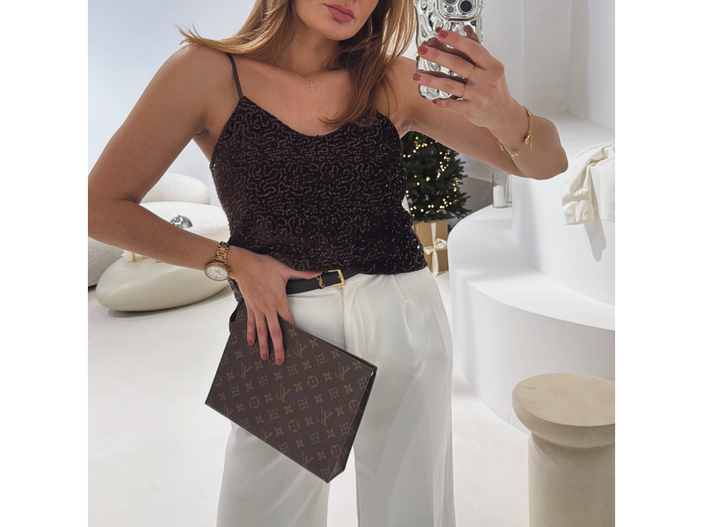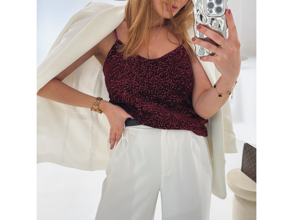 Stylový nátělník zdobený jemnými flitry, které vytvářejí krásný třpytivý efekt. Díky posuvným ramínkům si můžete snadno upravit délku podle sebe a všitá výztuž zajišťuje perfektní tvar i pohodlné nošení. Dostupný ve třech luxusních barvách – stříbrné, hnědé a vínové. Ideální k saku, na večerní outfit i jako výrazný detail v každodenním looku. Velikost univerzální, sedí na XS, S a M.