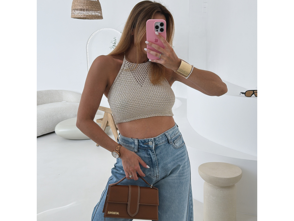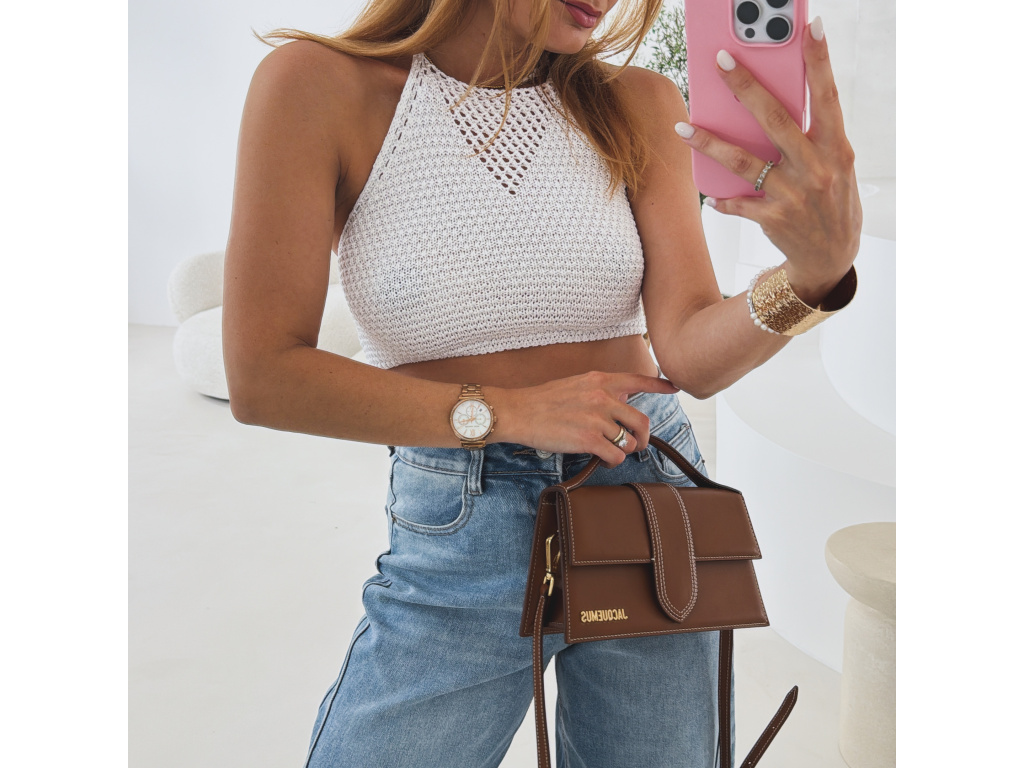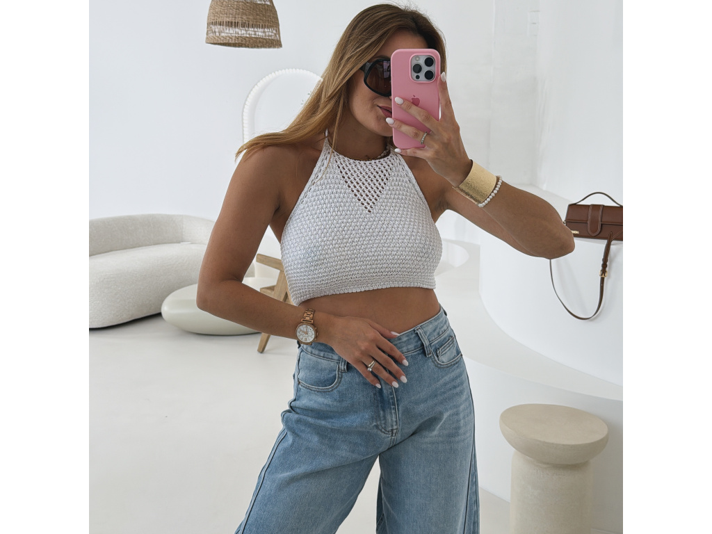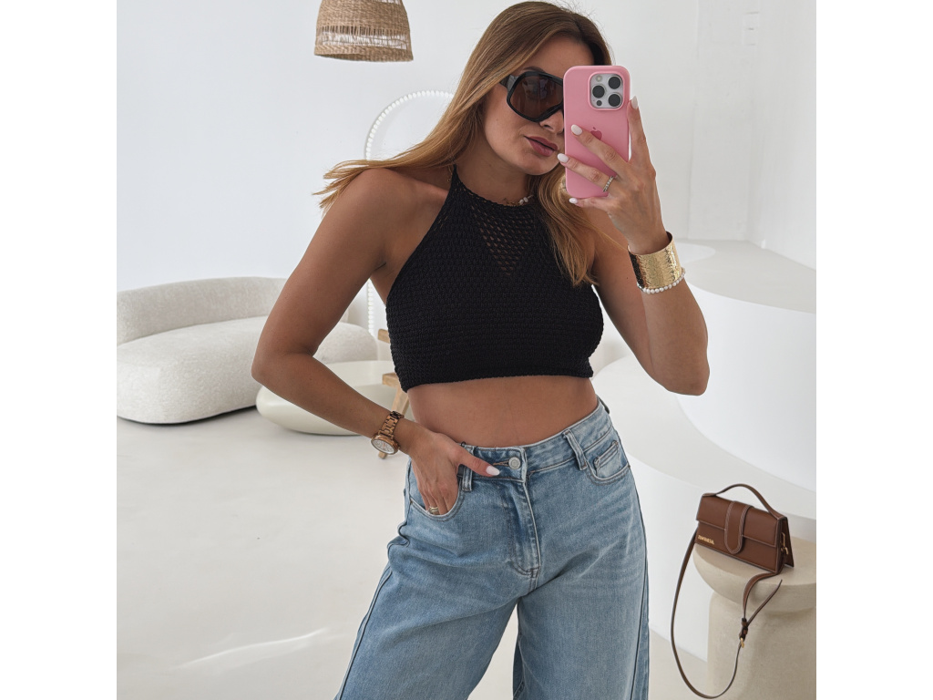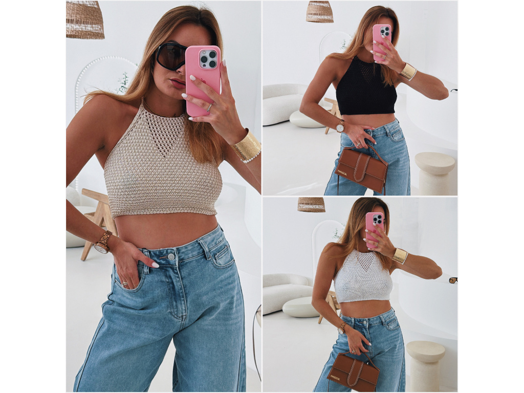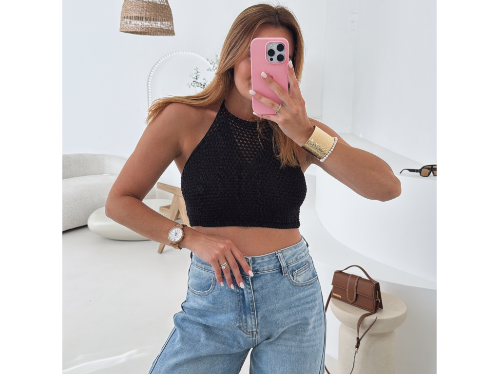 Stylový háčkovaný crop top s halter výstřihem, který podtrhne letní vibe každého outfitu. Pohodlný střih, zavazování za krkem a lehký materiál dělají z tohoto kousku ideální volbu na teplé dny. Materiál je elastický. Dostupný v růžové, bílé, černé, béžové a hnědé barvě. Velikost je univerzální, sedí na XS, S, M.