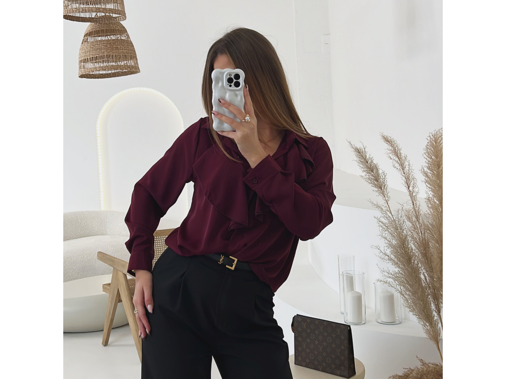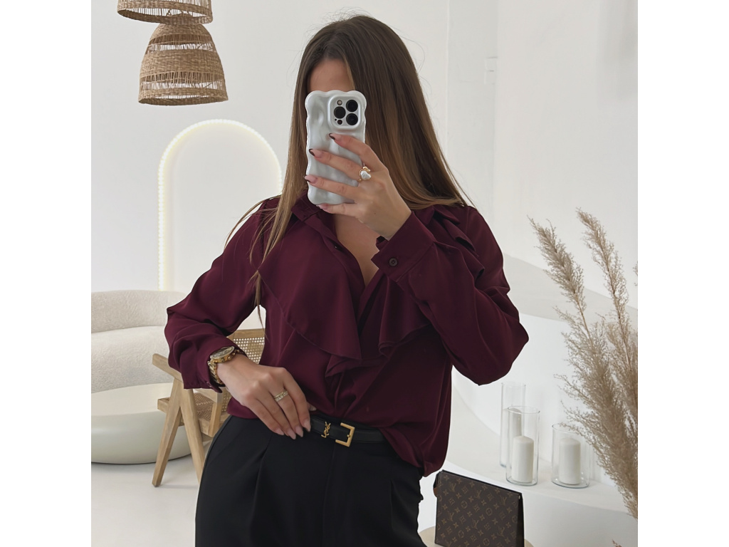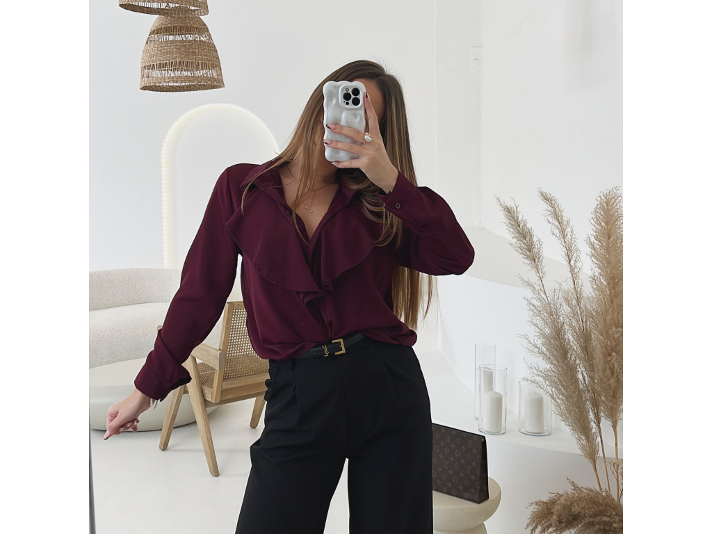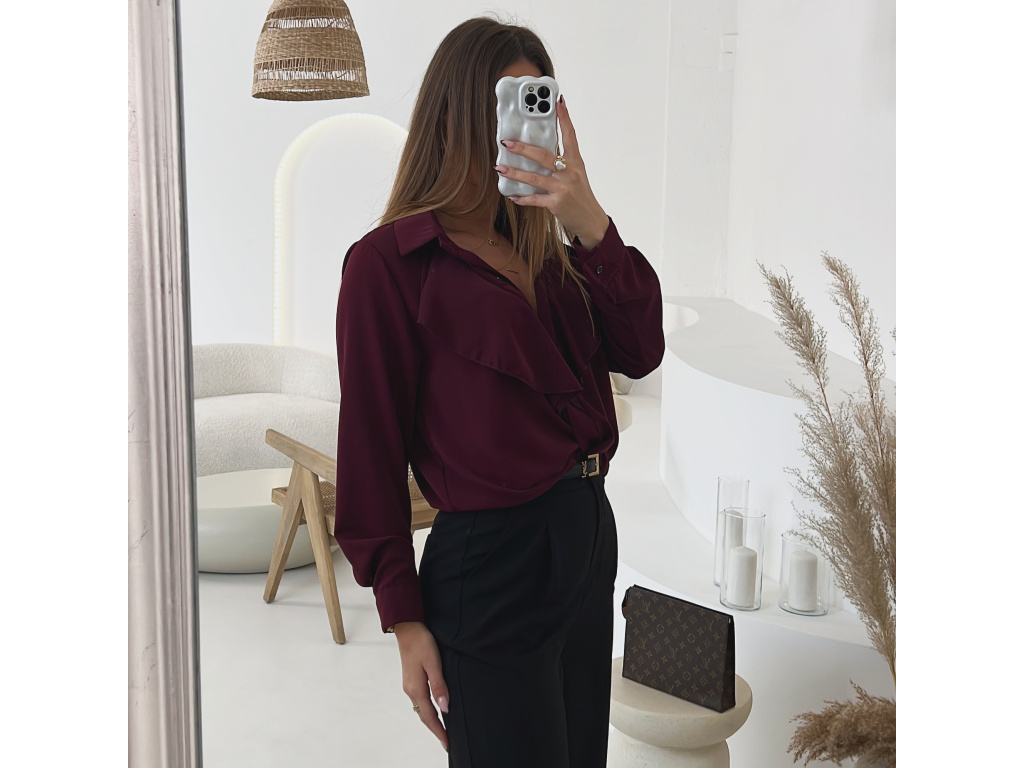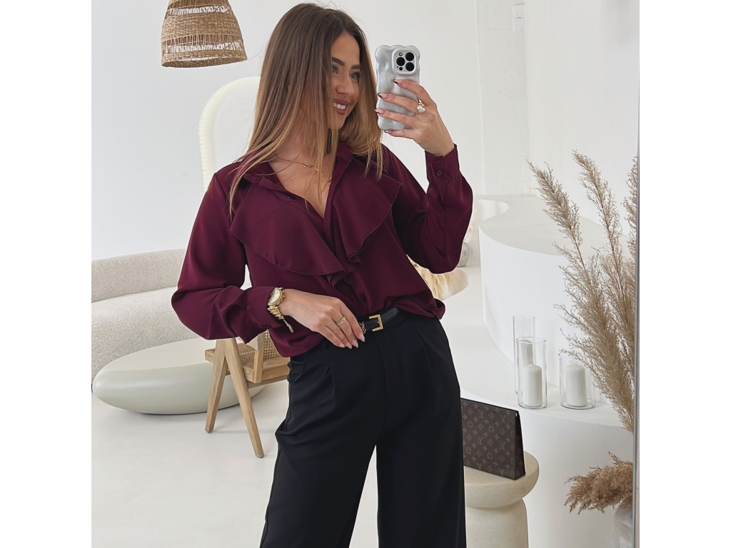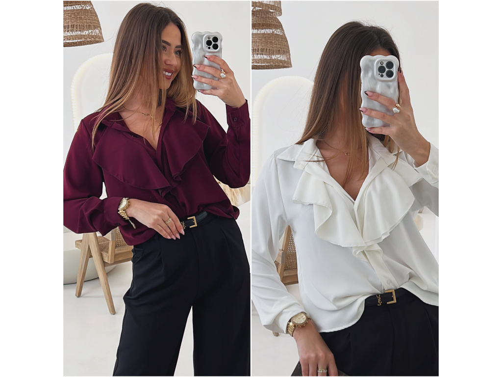 Elegantní košile s jemným volánem podél výstřihu dodá každému outfitu ženskost a šarm. Lehký, příjemný materiál krásně splývá a vytváří sofistikovaný vzhled vhodný jak do práce, tak i na večerní příležitosti. Dostupná ve dvou barvách – vínové a bílé.