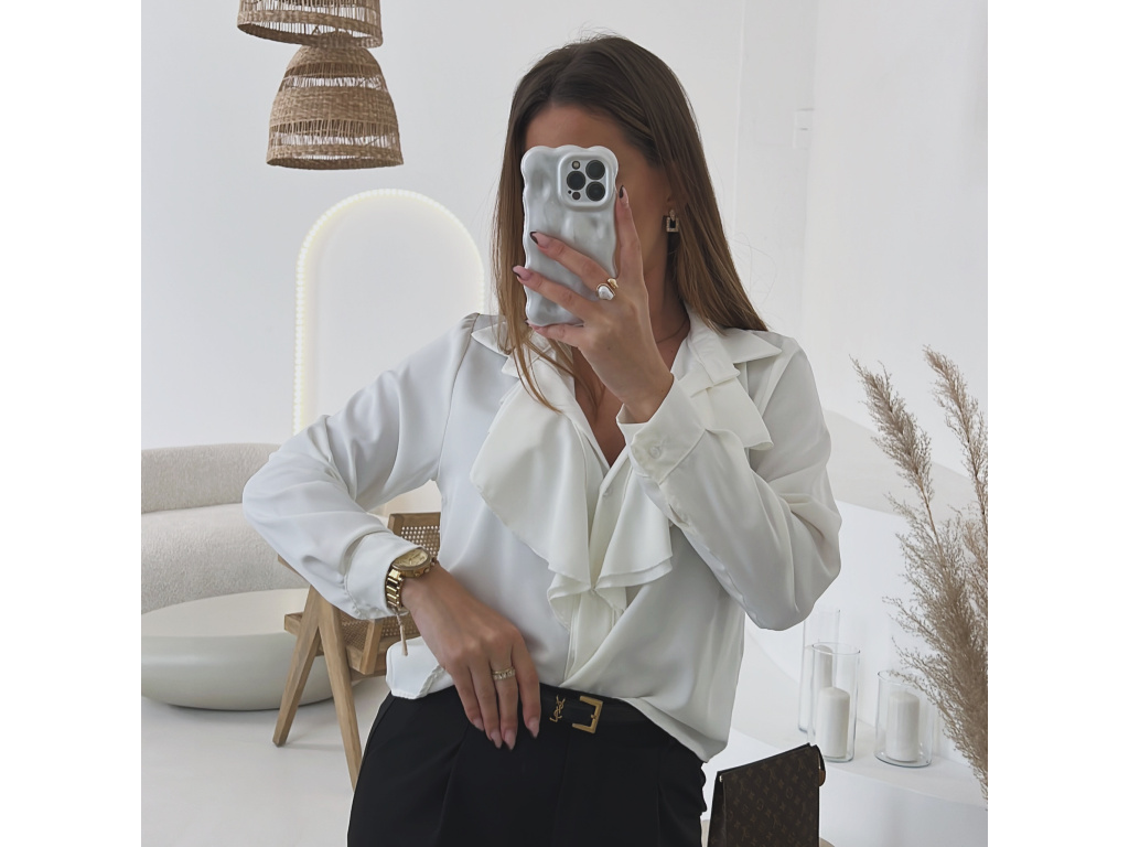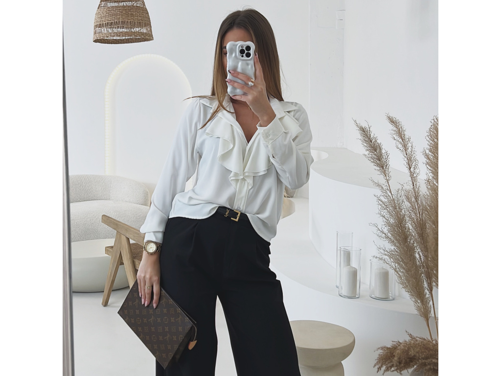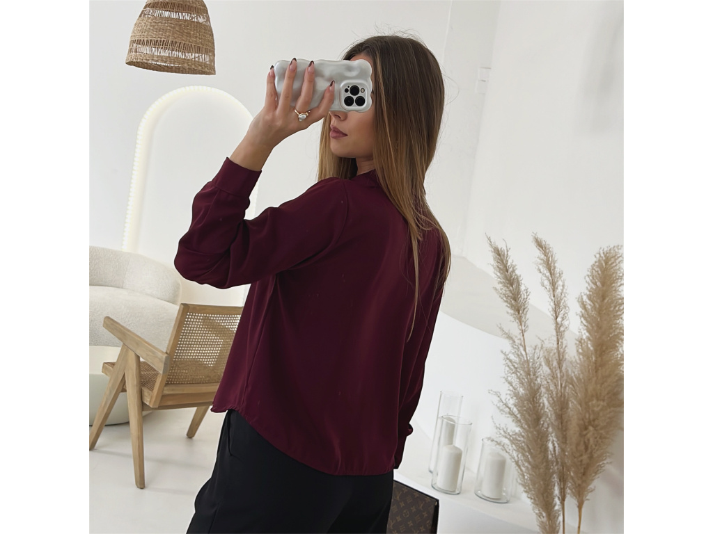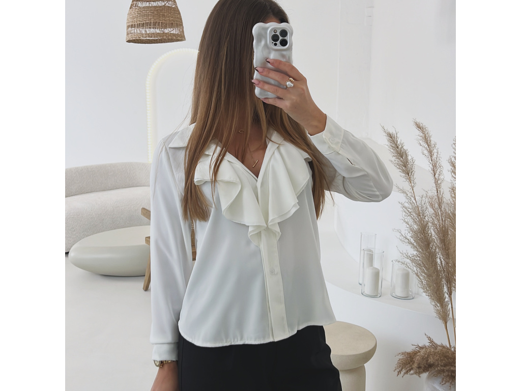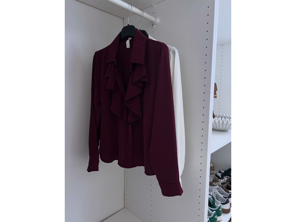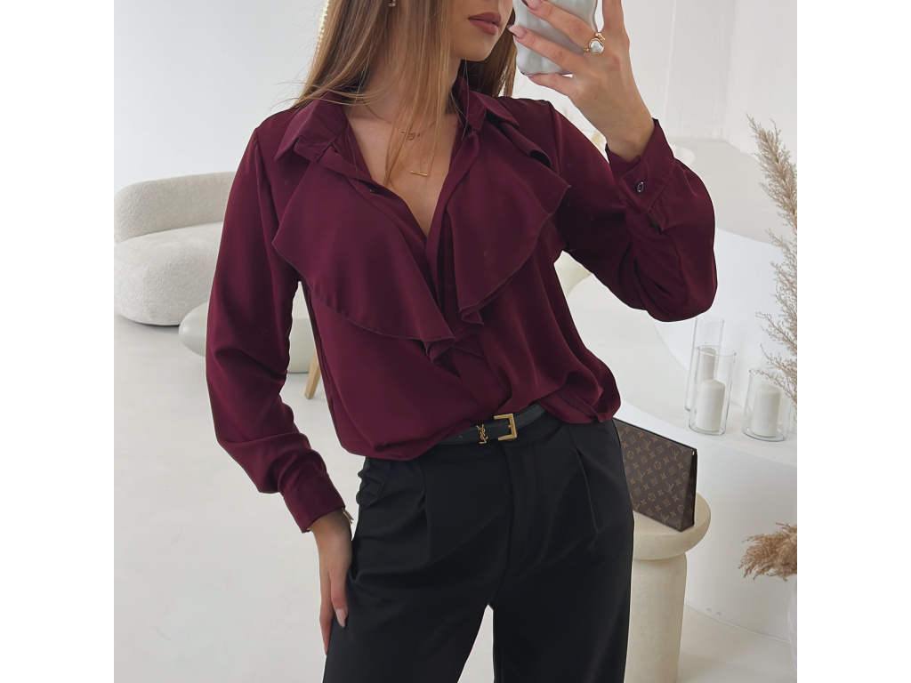 Elegantní košile s jemným volánem podél výstřihu dodá každému outfitu ženskost a šarm. Lehký, příjemný materiál krásně splývá a vytváří sofistikovaný vzhled vhodný jak do práce, tak i na večerní příležitosti. Dostupná ve dvou barvách – vínové a bílé.